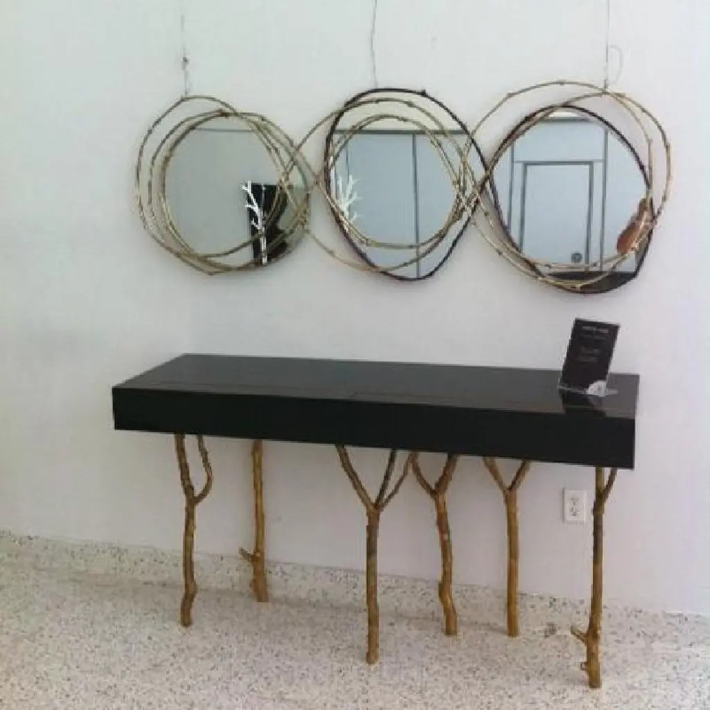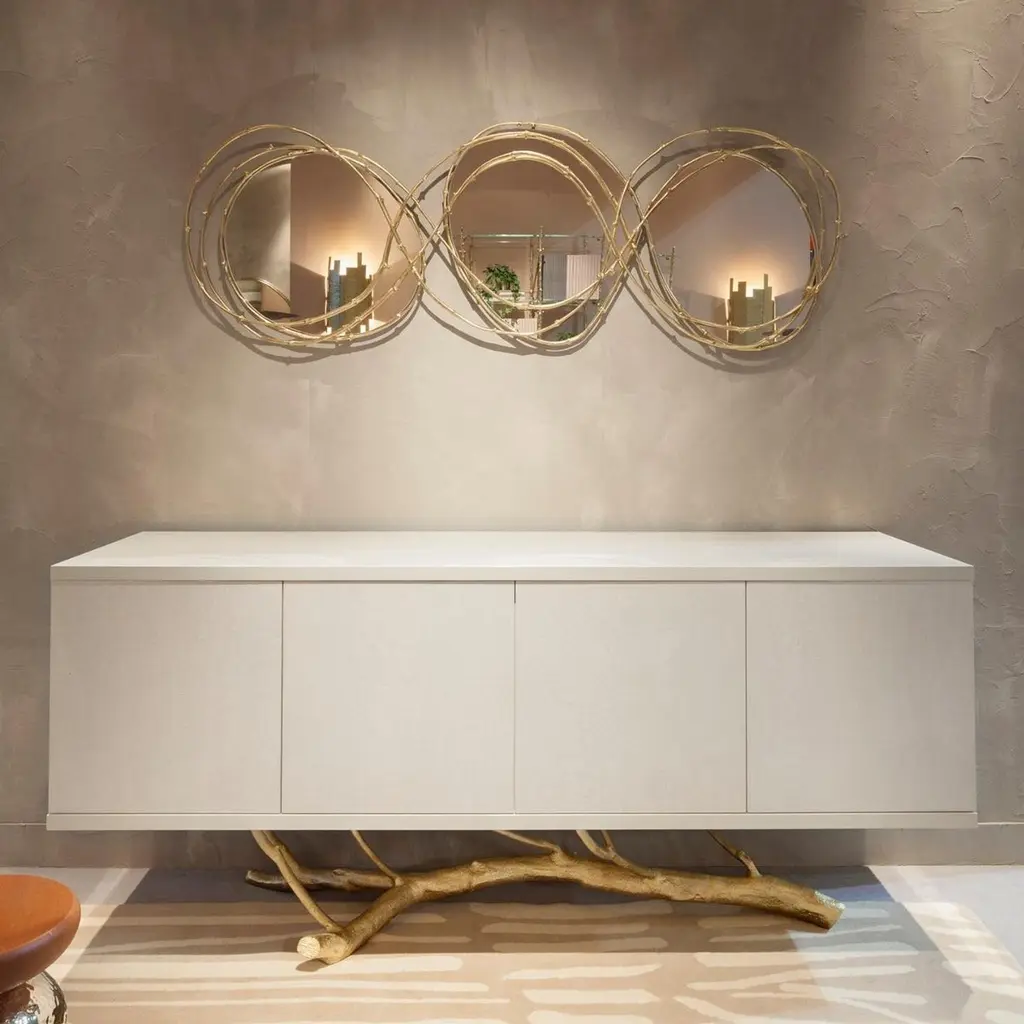 Framing the beholder in a crown of vine branches, this mirror is the ultimate artisanal piece. The three arches that form the frame are handmade from vine branches, molded in brass casting,Frame: Cast brass in Brass, Antique Brass, Silver, Antique Silver, Copper or Antique Copper.Mirror: Clear, Bronze or Smokey finishingSize can be customized to fit your space perfectly.We do our best to expedite production and to ship and deliver product within the listed lead time, however current lead times might be longer due to global shipping backlog and delays. These delays are out of our control and cannot be a reason to cancel an order.