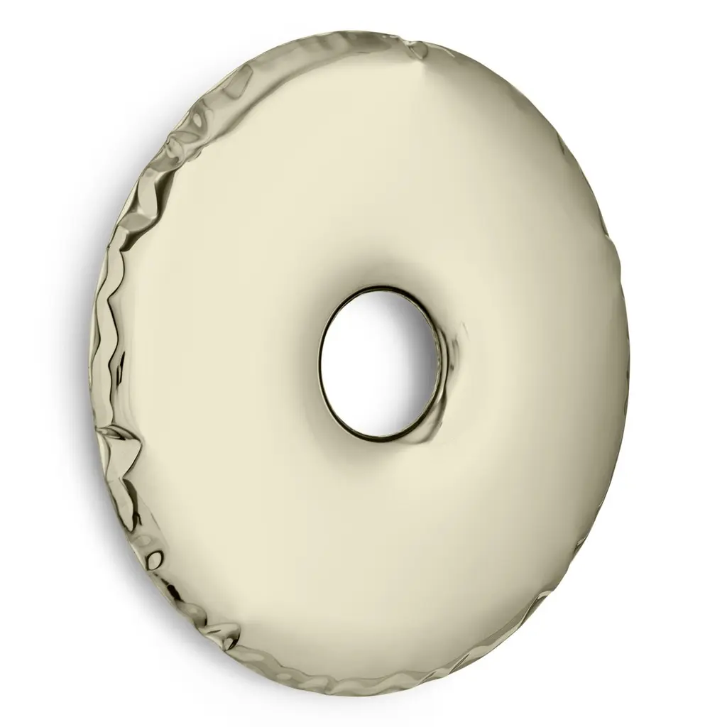 "Rondo" contemporary mirror by ZietaOriginal Zieta mirror, delivered with certificate. Collection: ARUM (2021)Material: Polished stainless steelFinish: Lacquer - Classic goldSize: 120cmZieta is best known for his collection of stools “Plopp” made through the technologist FIDU. With the same principle Zieta Studio conceived mirror collections made of stainless steel called “Tafla”, “Rondo” and “Rondel”. Two laser-cut metal sheets are first welded together before air is injected between them until they separate from each other forming a three-dimensional object.Aurum Collection is an outcome of Zieta’s experiment with lacquered steel – the polished inox surface is covered with semi-transparent lacquer that covers the object and at the same time uncovers its natural beauty. It is a collection of Zieta Studio’s classic mirrors such as RONDO and TAFLA, that come in three colours: Light Gold, Classic Gold and Rose Gold.Light Gold is the lightest, delicate gold, in which the cool hue of the polished steel shines through the warm shade of the varnish.Classic Gold is dedicated for those who love the warm golden hue – it is the colour of the traditional jewelry.Last but not least, the Rose Gold features the delicately rosey golden colour. Feminine, subtle, unconventional.