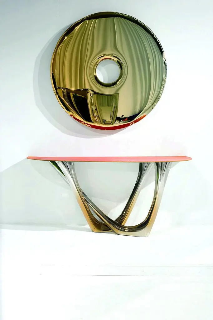 "Rondo" contemporary mirror by ZietaOriginal Zieta mirror, delivered with certificate. Collection: ARUM (2021)Material: Polished stainless steelFinish: Lacquer - Classic goldSize: 120cmZieta is best known for his collection of stools “Plopp” made through the technologist FIDU. With the same principle Zieta Studio conceived mirror collections made of stainless steel called “Tafla”, “Rondo” and “Rondel”. Two laser-cut metal sheets are first welded together before air is injected between them until they separate from each other forming a three-dimensional object.Aurum Collection is an outcome of Zieta’s experiment with lacquered steel – the polished inox surface is covered with semi-transparent lacquer that covers the object and at the same time uncovers its natural beauty. It is a collection of Zieta Studio’s classic mirrors such as RONDO and TAFLA, that come in three colours: Light Gold, Classic Gold and Rose Gold.Light Gold is the lightest, delicate gold, in which the cool hue of the polished steel shines through the warm shade of the varnish.Classic Gold is dedicated for those who love the warm golden hue – it is the colour of the traditional jewelry.Last but not least, the Rose Gold features the delicately rosey golden colour. Feminine, subtle, unconventional.