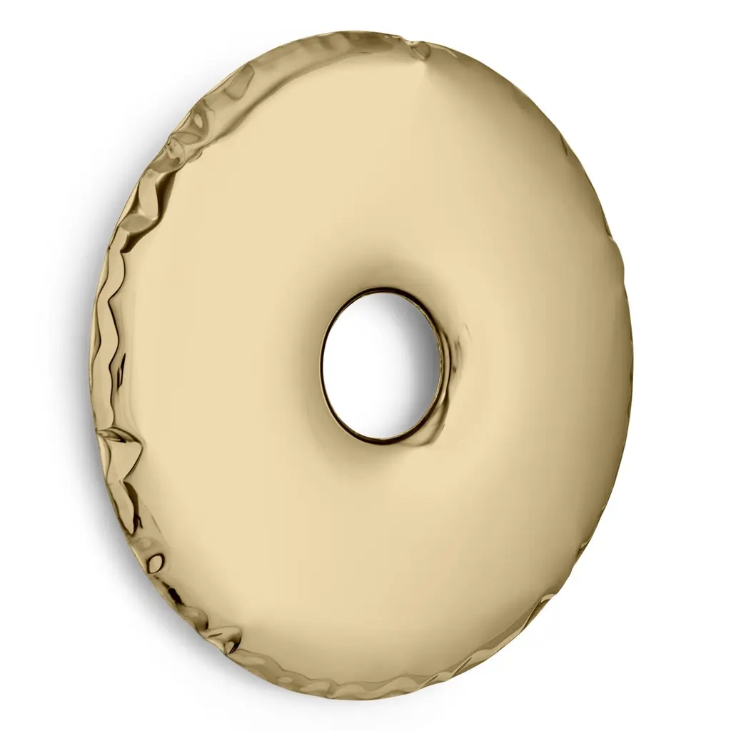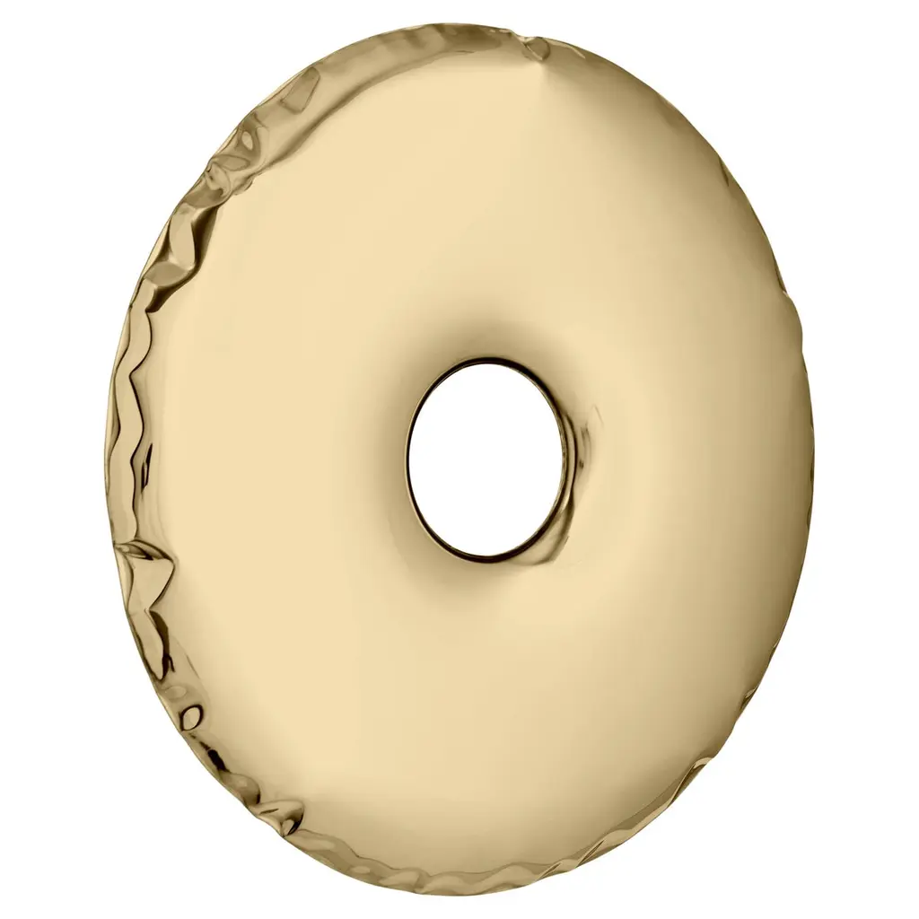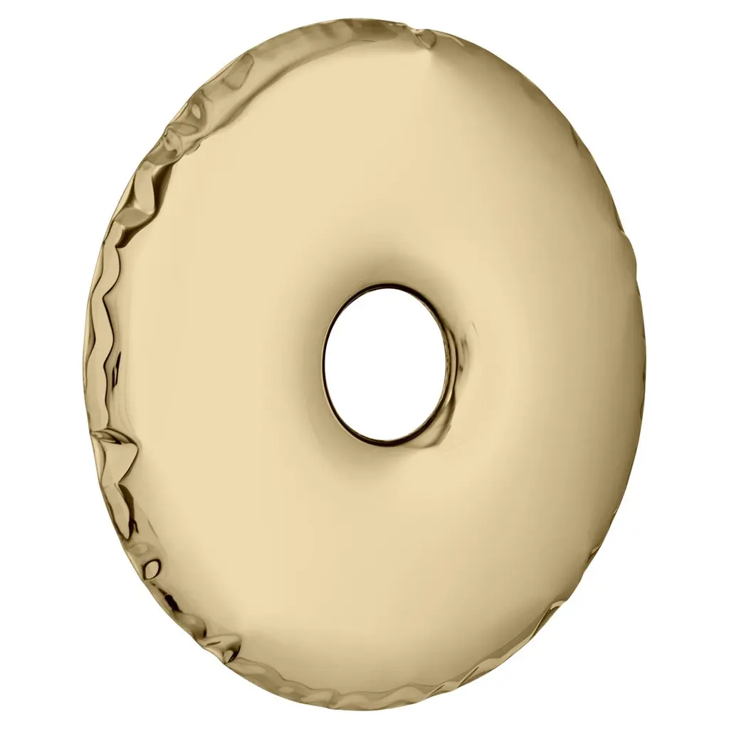 "Rondo" contemporary mirror by ZietaOriginal Zieta mirror, delivered with certificate. Collection: ARUM (2021)Material: Polished stainless steelFinish: Lacquer - Classic goldSize: 95cmZieta is best known for his collection of stools “Plopp” made through the technologist FIDU. With the same principle Zieta Studio conceived mirror collections made of stainless steel called “Tafla”, “Rondo” and “Rondel”. Two laser-cut metal sheets are first welded together before air is injected between them until they separate from each other forming a three-dimensional object.Aurum Collection is an outcome of Zieta’s experiment with lacquered steel – the polished inox surface is covered with semi-transparent lacquer that covers the object and at the same time uncovers its natural beauty. It is a collection of Zieta Studio’s classic mirrors such as RONDO and TAFLA, that come in three colours: Light Gold, Classic Gold and Rose Gold.Light Gold is the lightest, delicate gold, in which the cool hue of the polished steel shines through the warm shade of the varnish.Classic Gold is dedicated for those who love the warm golden hue – it is the colour of the traditional jewelry.Last but not least, the Rose Gold features the delicately rosey golden colour. Feminine, subtle, unconventional.