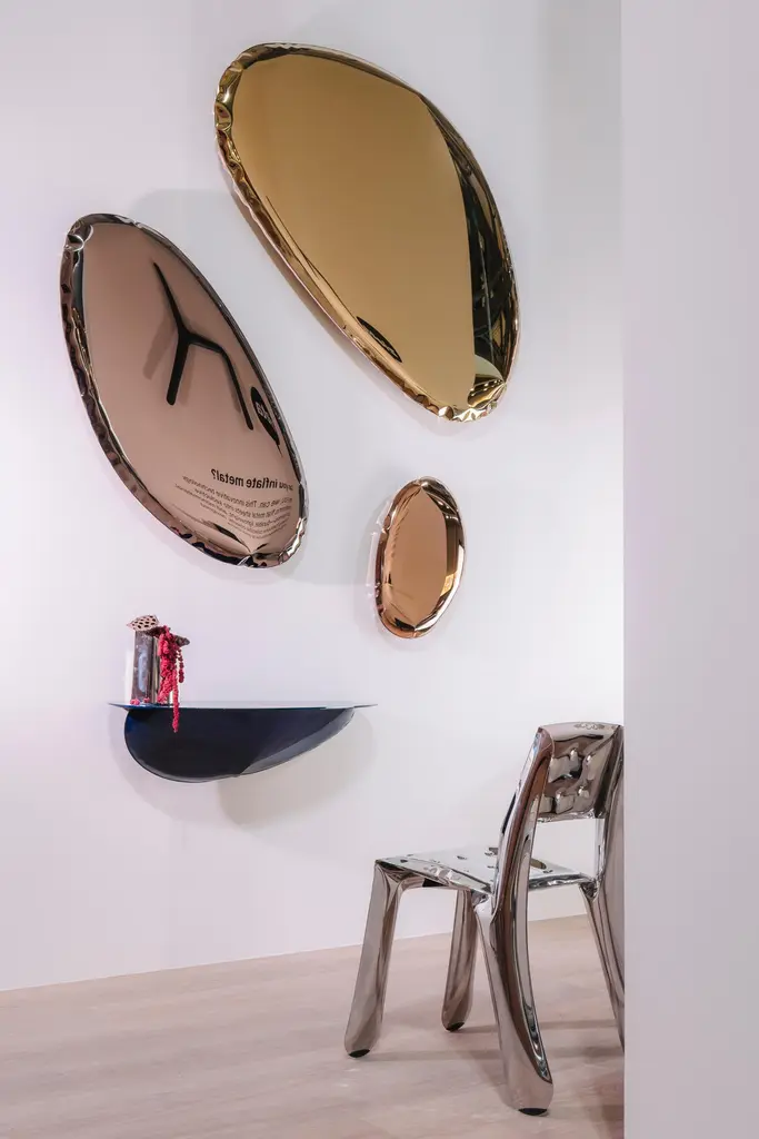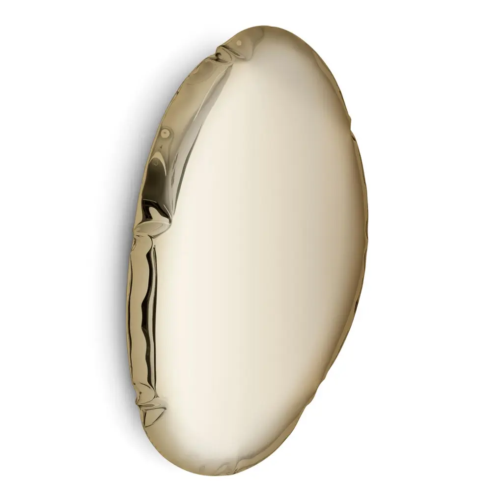 "Tafla O5" contemporary mirror by ZietaOriginal Zieta mirror, delivered with certificate. Collection: AURUM (2021)Material: Polished stainless steelFinish: Lacquer - Classic goldSize: 60 cmZieta is best known for his collection of stools “Plopp” made through the technology FIDU. With the same principle Zieta Prozessdesign conceived mirror collections made of stainless steel called “Tafla”, “Rondo” and “Rondel”. Two laser-cut metal sheets are first welded together before air is injected between them until they separate from each other forming a three-dimensional object.The 'Tafla O' collection has a glossy steel finish inspired by drops of water. Its shape makes the mirror modern and contemporary. The 'AURUM' collection presents Tafla O mirrors in warmer colours, such as light gold, classic gold and rose gold.