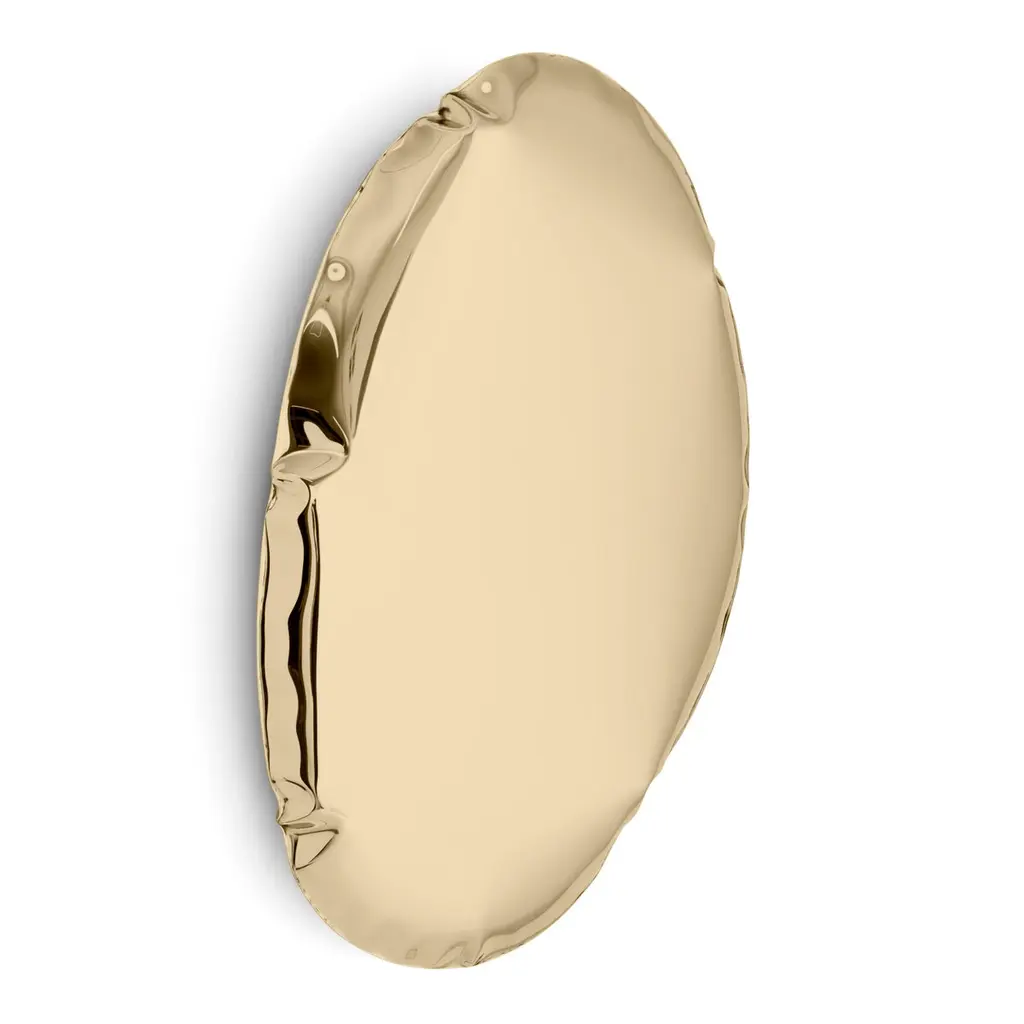 "Tafla O5" contemporary mirror by ZietaOriginal Zieta mirror, delivered with certificate. Collection: AURUM (2021)Material: Polished stainless steelFinish: Lacquer - Light goldSize: 60 cmZieta is best known for his collection of stools “Plopp” made through the technologist FIDU. With the same principle Zieta Studio conceived mirror collections made of stainless steel called “Tafla”, “Rondo” and “Rondel”. Two laser-cut metal sheets are first welded together before air is injected between them until they separate from each other forming a three-dimensional object.Aurum Collection is an outcome of Zieta’s experiment with lacquered steel – the polished inox surface is covered with semi-transparent lacquer that covers the object and at the same time uncovers its natural beauty. It is a collection of Zieta Studio’s classic mirrors such as RONDO and TAFLA, that come in three colours: Light Gold, Classic Gold and Rose Gold.Light Gold is the lightest, delicate gold, in which the cool hue of the polished steel shines through the warm shade of the varnish.Classic Gold is dedicated for those who love the warm golden hue – it is the colour of the traditional jewelry.Last but not least, the Rose Gold features the delicately rosey golden colour. Feminine, subtle, unconventional.