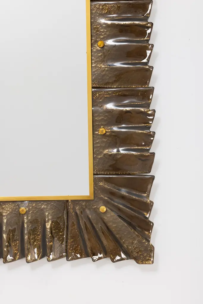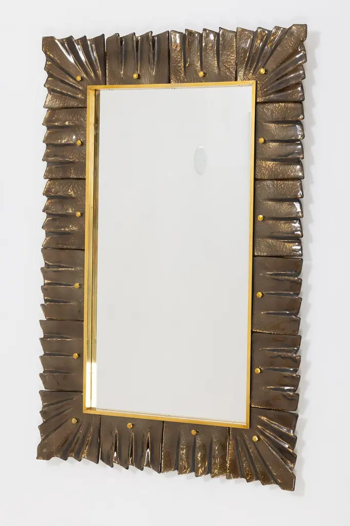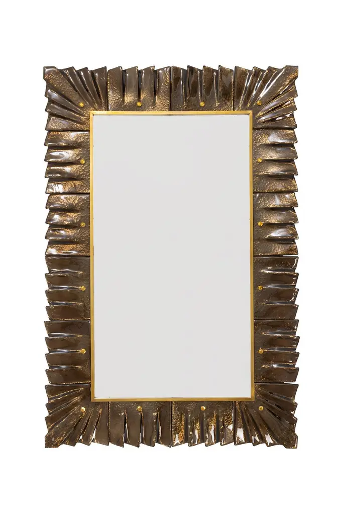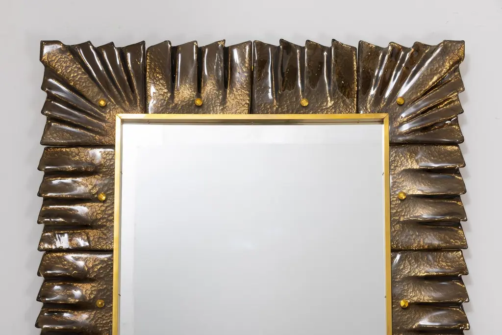 Rectangular amber, bronze Murano glass framed mirror, in stockMirror plate surrounded with undulating glass tiles in bronze/amber color held by brass cabochons. Handcrafted by a team of artisans in Venice, Italy. Can be easily hung vertically or horizontally with metal hanging bracket on back. Weight Lbs. 50.We offer a wide variety of colors and dimensions in addition to this piece, please inquire if of interest.Ready to ship from our Miami gallery