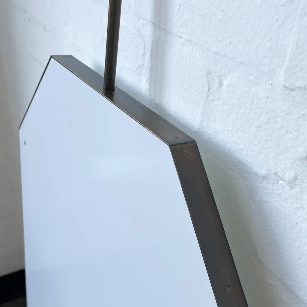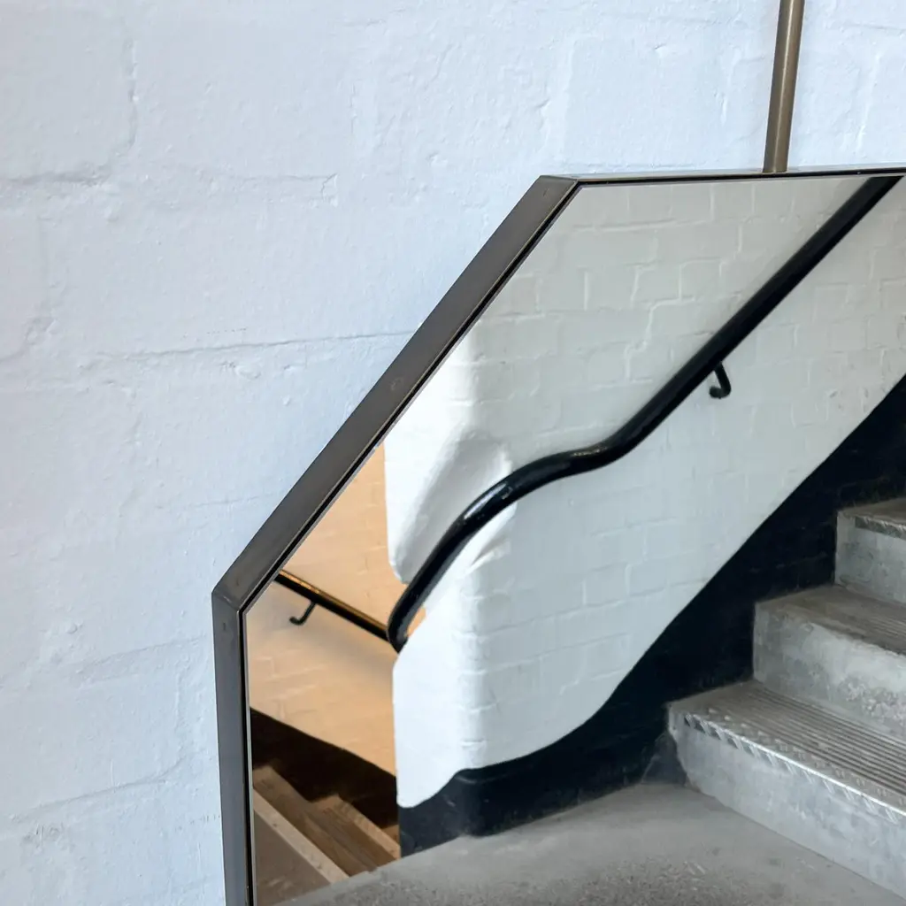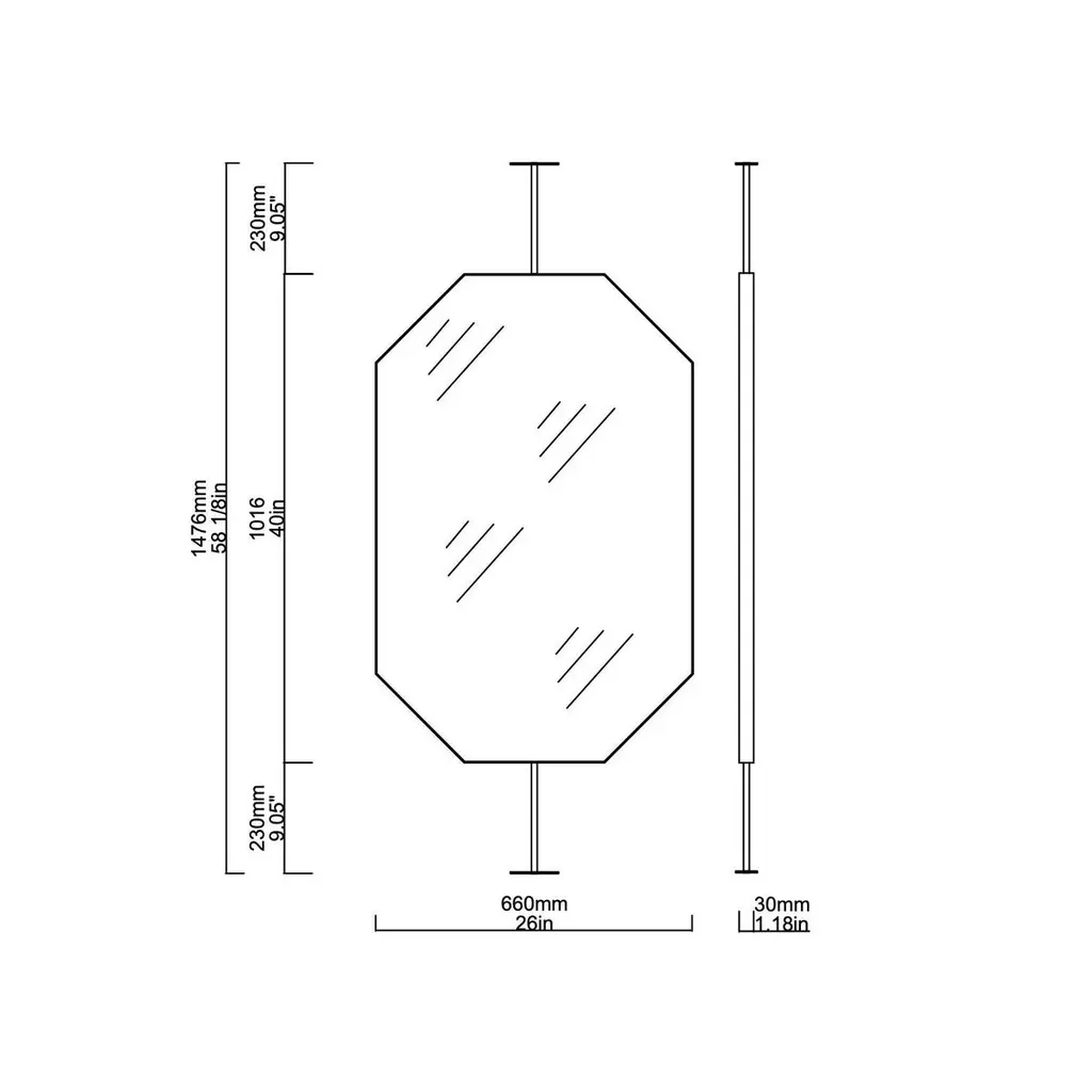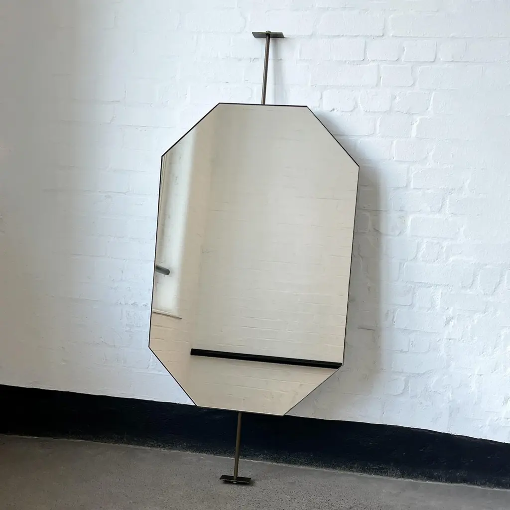 Octagonal countertop to ceiling attached mirror framed with exquisite solid brass, finished with a bronze patina handcrafted in our workshop by our talented team. Designed and made in London, UK.Dimensions:66cm x 101.6cm x 3cm (Drop 23cm, Rise 23cm ) / 26in x 40in x 1.18in (Drop 9in, Rise 9in)Overall height: 147.6cm / 58.1inMirror drop and mirror rise: Customisable – Price may be adjusted if drop greater than the height of the mirror. Please contact us for further information.The high quality finish of our suspended mirrors extends to their backings, which are made from a powder coated panel available in black or white. Backings can also be upgraded to a finish that matches the frame (as illustrated in the pictures) or can be substituted by a second mirror, making your mirror double sided.The ceiling plate is supplied with a cover hiding the screws to complete the minimalist design of the mirror.The Neska™ signature bronze patina finish of our frames is a highly skilled and handcrafted process. Carried out by our talented craftsmen, this artistic finish is created from the base metal itself to achieve the natural look of aged brass. This makes the finish of each frame original and unique as no two frames can be identical. Any sample or images provided to obtain your approval on the desired finish or on our website or any other promotional material are therefore for guidance only.This mirror is fully customisable. Shipped safely and insured worldwide. All our mirrors are made on demand. Fabrication lead time for this particular mirror is approximately 6 to 7 weeks. Our mirrors are always shipped by courier express. Shipping via courier express typically requires 1 to 2 days to the UK, or 2 to 7 days outside the UK depending on the destination.Available options:• double sided mirror• backing in a finish that matches the frame• frame finishes: brass (brushed, polished or with a bronze patina), copper, stainless steel, blackened metal, powder coated aluminium in a range of standard or bespoke colours• full frame that extends to the front of the mirror• mirror tints: standard silver, black, bronze, blue, rose gold / peach• back-illumination creating a halo effect• front-illumination around the periphery of the mirror• ON/OFF sensor switch• demister pad• bevelA presentation illustrating the options above is also available on demand. Please contact us for a quote for any bespoke specification or added options.IMPORTANT NOTE: This mirror is intended to be fitted onto a countertop and must be attached to the ceiling. Ceiling suspended mirrors or countertop mirrors are also available on demand.ORDERS OF MULTIPLE MIRRORS OF THE SAME TYPE: Please contact us to receive a Packing and Shipping quote when ordering multiple mirrors of the same type. An order for multiple mirrors of the same type may not be accepted without extra packing and shipping fees. Thank you.