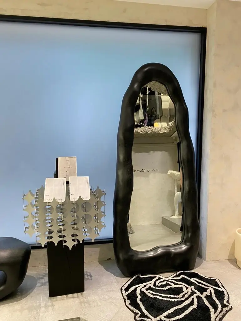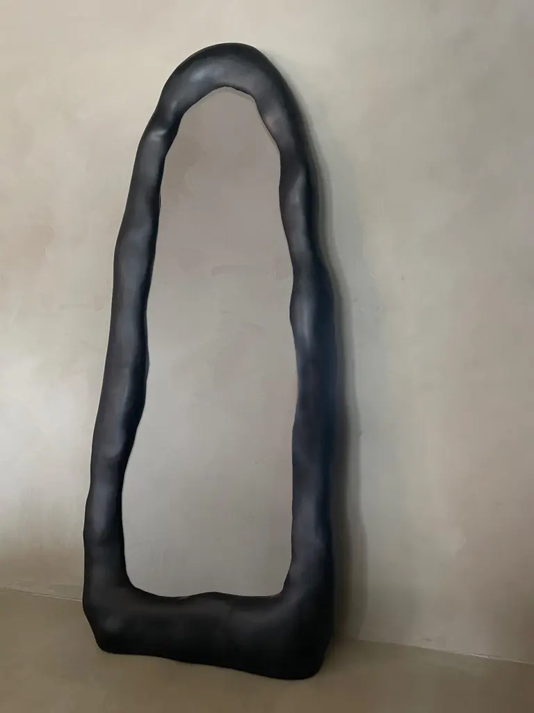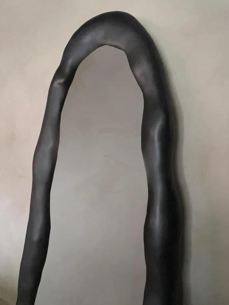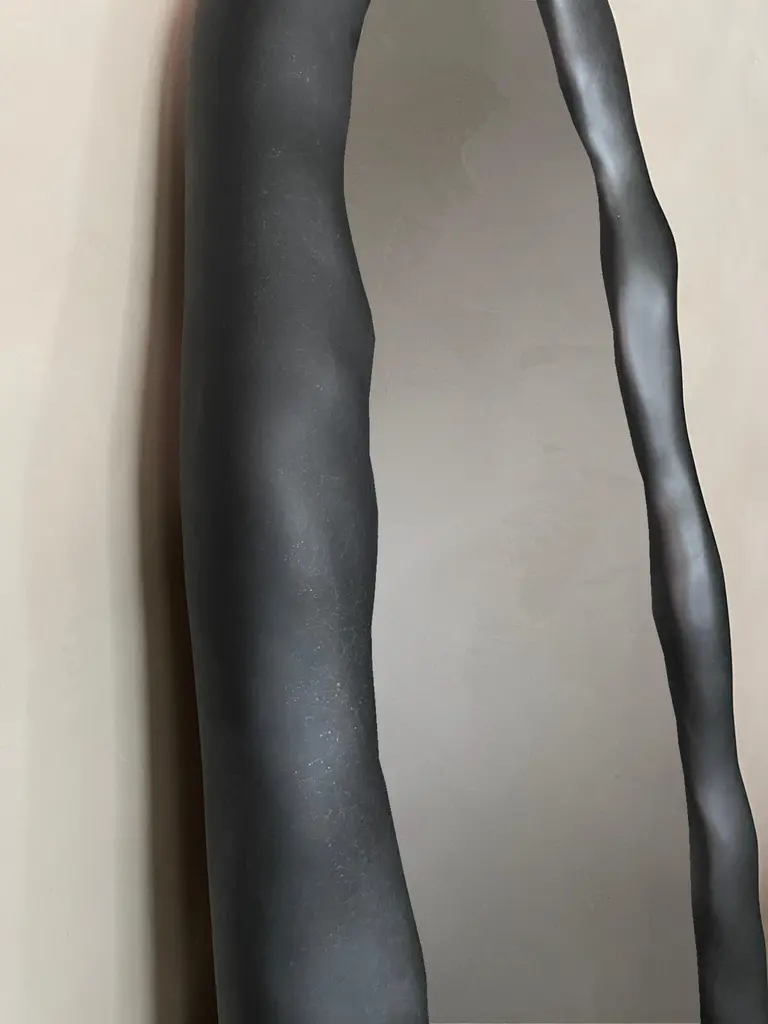 Black knead mirror by karMaterials: FiberglassDimensions: W 80 x D 22 x H 193 cmKnead mirror preserves the handmade traces of clay-kneading, and the hand-polishedtexture captures the aesthetic and emotion of creation. The mirror is narrowed from thebottom to the top, and the bottom is beveled flat for stability when placed against the wall.When decorating our showroom, we realized that the mirror is an essential part of thedecor. Just as people nowadays concern more with the unique taste and spirit of thefurniture than only its practicality, the mirror could become a significant piece of artwork in the space, rather than simply reflecting one’s appearance.Knead mirror adds fun and a sense of beauty to any space, whether it is placed in a clothing store or one’s own home, and it can present the owner’s aesthetics and personality.Kar- is the root of Sanskrit Karma, meaning karmic repetition. We seek the cause and effect in aesthetics, inspired from the past, the present, and the future, and we create.The creation journey base on sensibility, we aim to convey emotion through the creation. From the very first kneading, the designer's current emotion, either joy or sorrow, affects the strength and trace on the clay. The overall edges and the lines are inornate and plainness, representing a true emotion, "not by intention".Due to the use of this organic material, the finish will have irregularities, those are not imperfections but part of the visual will of the designers and makers.