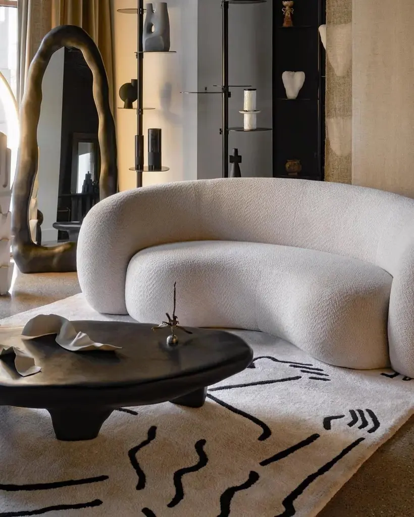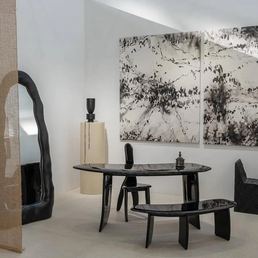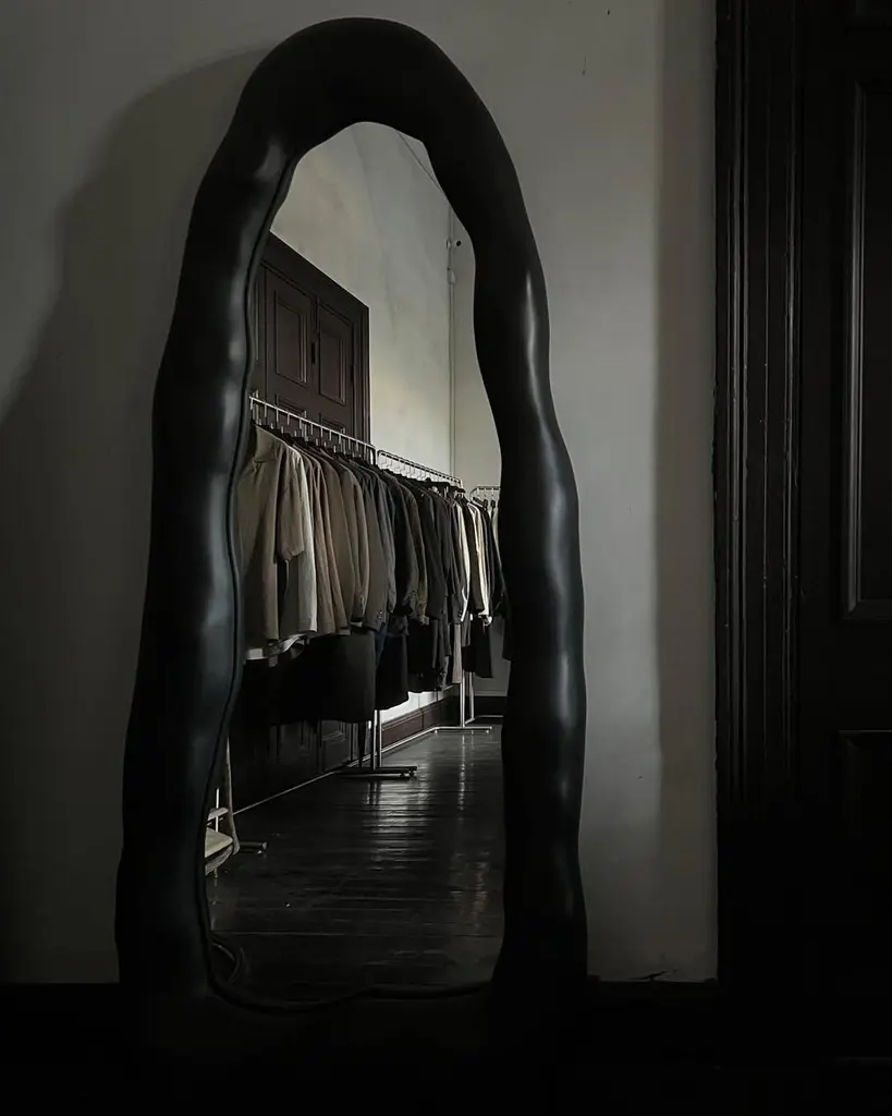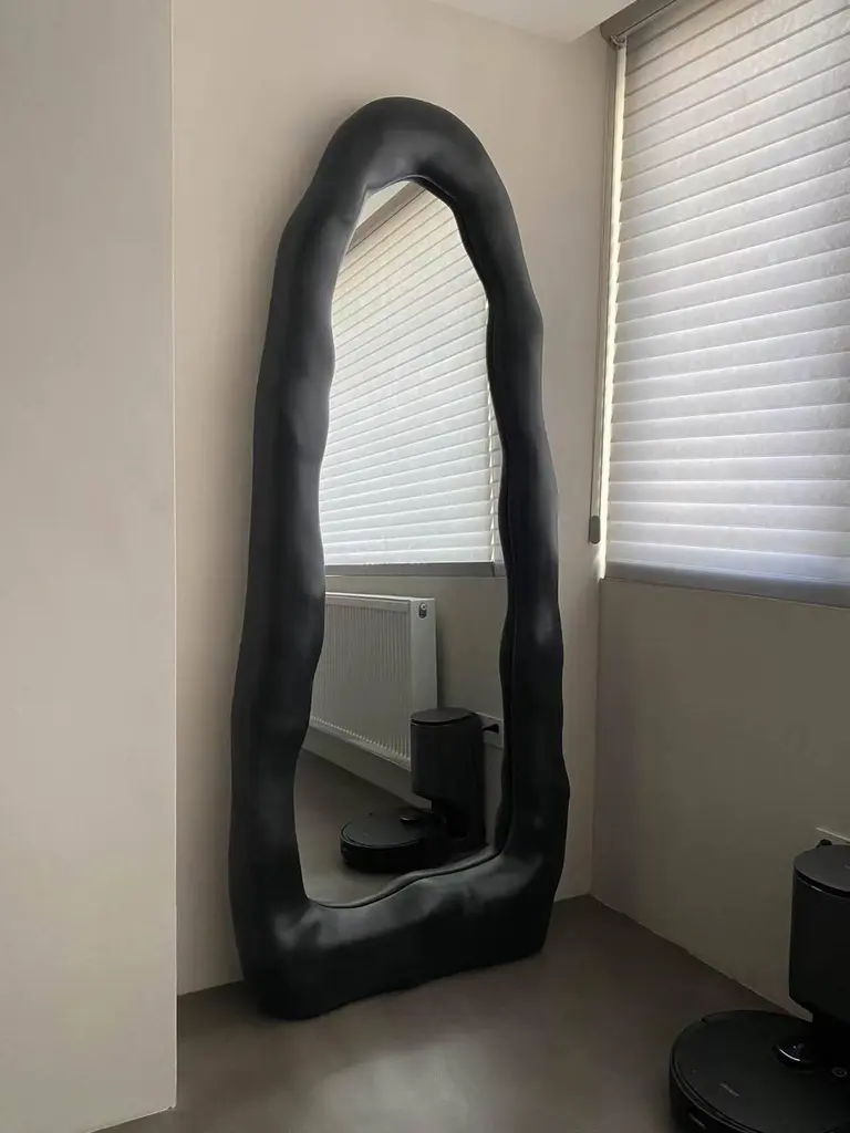 Black knead mirror by karMaterials: FiberglassDimensions: W 80 x D 22 x H 193 cmKnead mirror preserves the handmade traces of clay-kneading, and the hand-polishedtexture captures the aesthetic and emotion of creation. The mirror is narrowed from thebottom to the top, and the bottom is beveled flat for stability when placed against the wall.When decorating our showroom, we realized that the mirror is an essential part of thedecor. Just as people nowadays concern more with the unique taste and spirit of thefurniture than only its practicality, the mirror could become a significant piece of artwork in the space, rather than simply reflecting one’s appearance.Knead mirror adds fun and a sense of beauty to any space, whether it is placed in a clothing store or one’s own home, and it can present the owner’s aesthetics and personality.Kar- is the root of Sanskrit Karma, meaning karmic repetition. We seek the cause and effect in aesthetics, inspired from the past, the present, and the future, and we create.The creation journey base on sensibility, we aim to convey emotion through the creation. From the very first kneading, the designer's current emotion, either joy or sorrow, affects the strength and trace on the clay. The overall edges and the lines are inornate and plainness, representing a true emotion, "not by intention".Due to the use of this organic material, the finish will have irregularities, those are not imperfections but part of the visual will of the designers and makers.