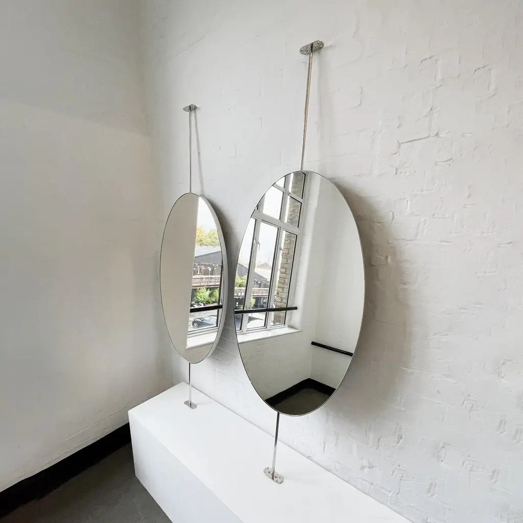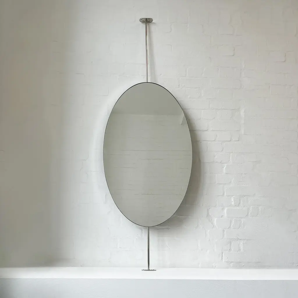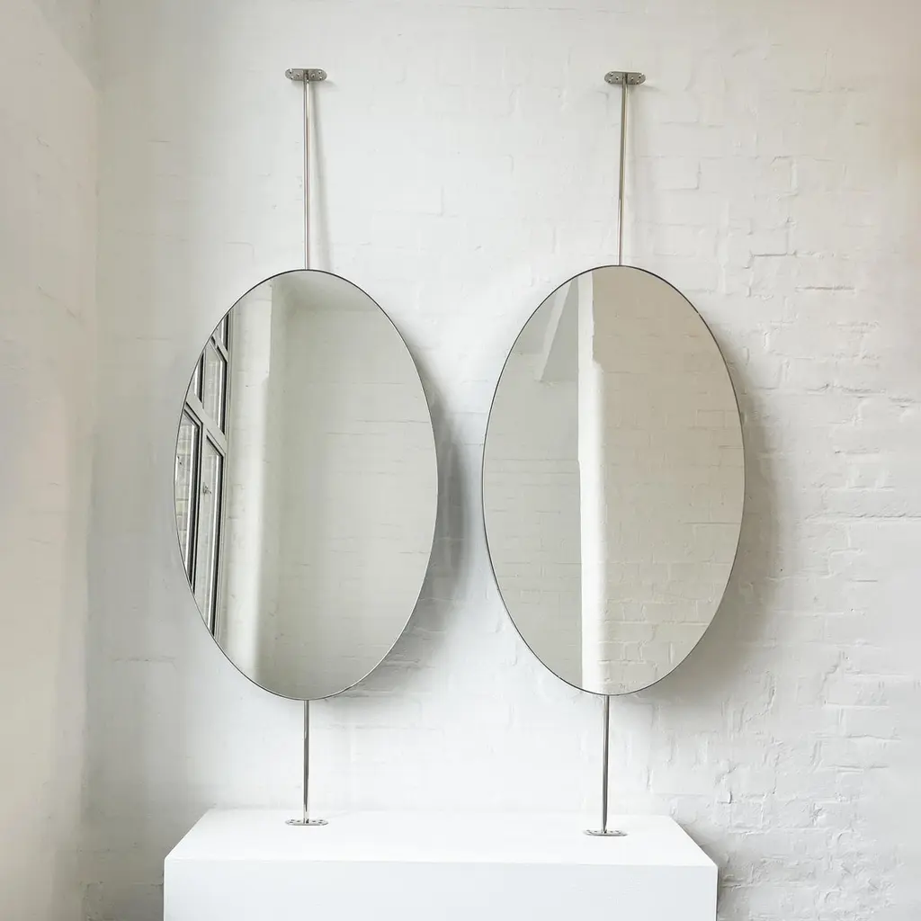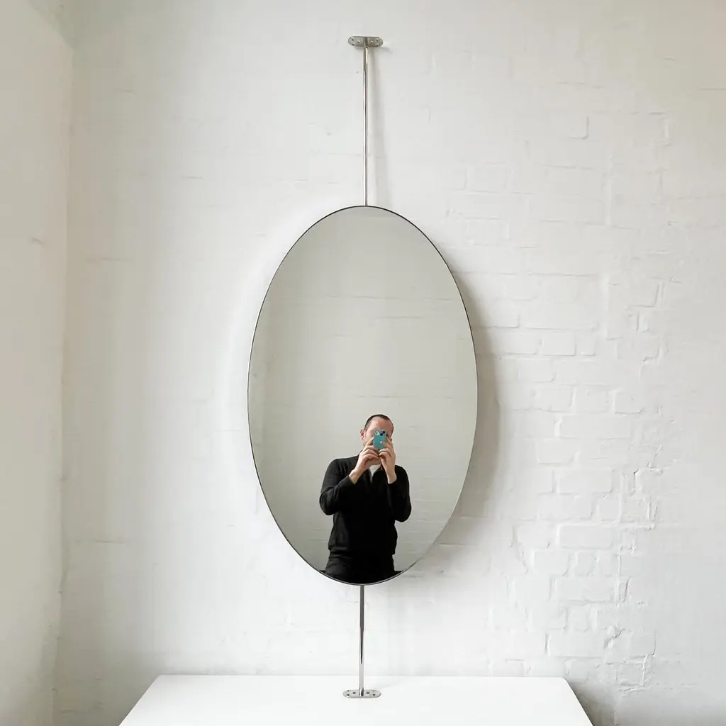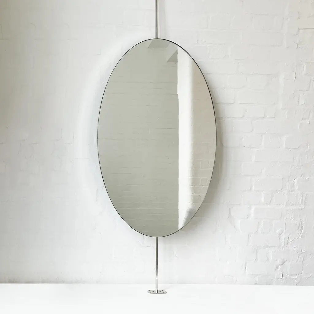 Ovalis™ countertop to ceiling attached oval mirror with an exquisite nickel plated frame. Designed and handcrafted in London, UK. This mirror is fully customisable.Dimensions:W 62cm x H 120cm x Overall Depth 10cm (Drop 51cm, Rise 30cm )W 47.2in x H 24.41in x Overall Depth 3.94in (Drop 20.1in, Rise 11.8in)Overall height: 201cm / 79.1inThe mirror dimensions, drop and rise are fully customisable. Please contact us for further information.The high quality finish of our suspended mirrors extends to their backings, which are made from a powder coated panel available in black or white. Backings can also be upgraded to a finish that matches the frame or can be substituted by a second mirror, making your mirror double sided.The ceiling plate is supplied with a cover hiding the screws to complete the minimalist design of the mirror.This mirror is fully customisable. Shipped safely and insured worldwide. All our mirrors are made on demand. Fabrication lead time for this particular mirror is approximately 6 to 7 weeks. Our mirrors are always shipped by courier express. Shipping via courier express typically requires 1 to 2 days to the UK, or 2 to 7 days outside the UK depending on the destination.Available options:• double sided mirror• backing in a finish that matches the frame• frame finishes: brass (brushed, polished or with a bronze patina), copper, stainless steel, blackened metal, powder coated aluminium in a range of standard or bespoke colours• full frame that extends to the front of the mirror• mirror tints: standard silver, black, bronze, gold, blue, rose gold / peach• back-illumination creating a halo effect• front-illumination around the periphery of the mirror• ON/OFF sensor switch• demister pad• bevelA presentation illustrating the options above is also available on demand. Please contact us for a quote for any bespoke specification or added options.IMPORTANT NOTES:- This mirror is intended to be fitted onto a countertop and must be attached to the ceiling. Ceiling suspended mirrors or countertop mirrors are also available on demand.- Prices on the website do not include taxes and / or applicable import duties for deliveries outside the United Kingdom.ORDERS OF MULTIPLE MIRRORS OF THE SAME TYPE: Please contact us to receive a Packing and Shipping quote when ordering multiple mirrors of the same type. An order for multiple mirrors of the same type may not be accepted without extra packing and shipping fees. Thank you.