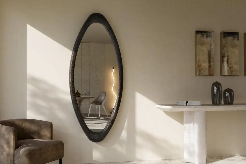 Experience the elegance of this wall Mirror, an oval masterpiece crafted to redefine any environment. Its resin frame boasts a unique 'Volcanic' finish, imparting both texture and refinement. Versatility is key with its ample proportions, offering the choice of vertical grandeur or horizontal expansiveness. Immerse yourself in the allure of this Mirror's enchanting aesthetic and impeccable artistry, and elevate your decor to new heights.Custom sizes available upon request. Contact us for color and size customization. We do our best to expedite production and to ship and deliver product within the listed lead time, however current lead times might be longer due to global shipping backlog and delays. These delays are out of our control and cannot be a reason to cancel an order.