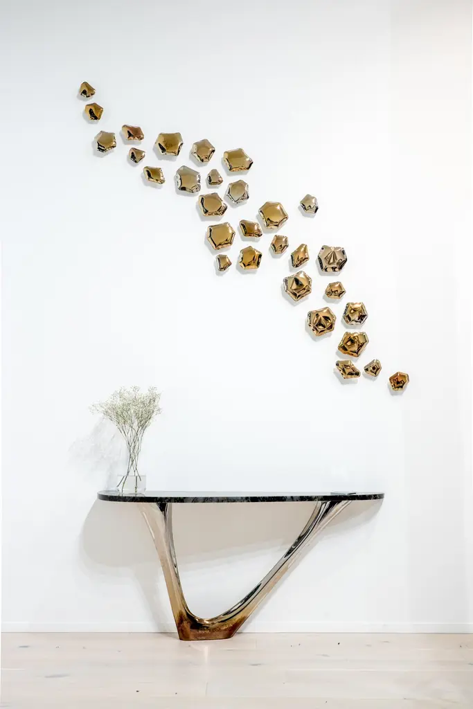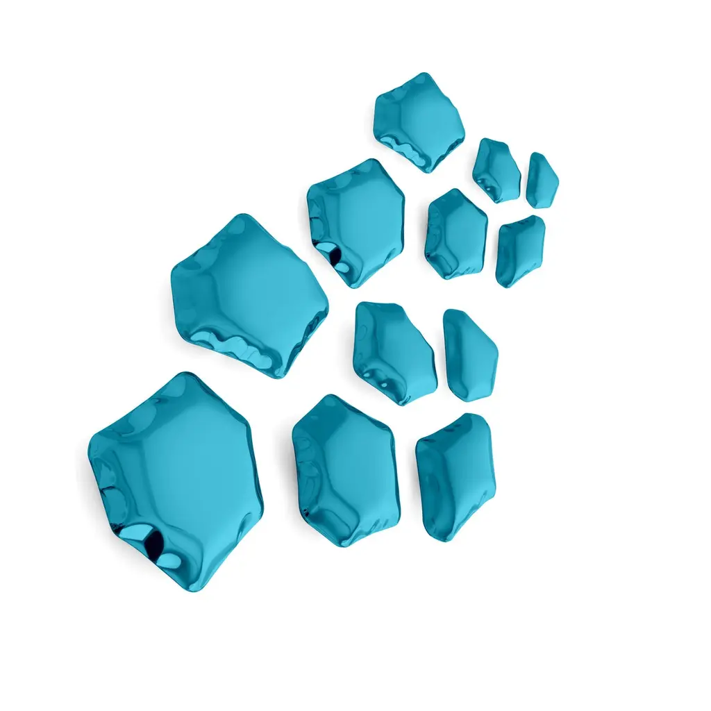 Set of 12 Kamyki mirrors by ZietaMounted sculptureColor : SapphireDimensions [cm]:Ø 7- 20 cm6 different formsDimensions of the set :H. 86 cmW. 102 cmD. 6 cm The Gradient Collection KAMYKI wall decor from Gradient Collection is a series of geometric objects of various sizes and shapes made of steel in FiDU technology. They resemble irregular stones or pieces of shattered glass offer and can be arranged on the wall in many ways. You can mix KAMYKI of various sizes within one chosen finish – sapphire or emerald – or you can mix them according to your needs and fantasy.KAMYKI come in different diameters from 7 to 20 cm and are available in sets of 6, 12 and 18 pieces.The Gradient collection combines an exceptional depth and unparalleled reflections of the colorized surfaces. Soft transitions between colors provide the viewers intensive visual experiences. A change of point of view leads to a change in color perception. Mirrors from the Gradient series are made of stainless steel, polished to a mirror finish and covered with a special lacquer, creating on their surface a unique composition of colors with exceptional depth and unparalleled reflections.