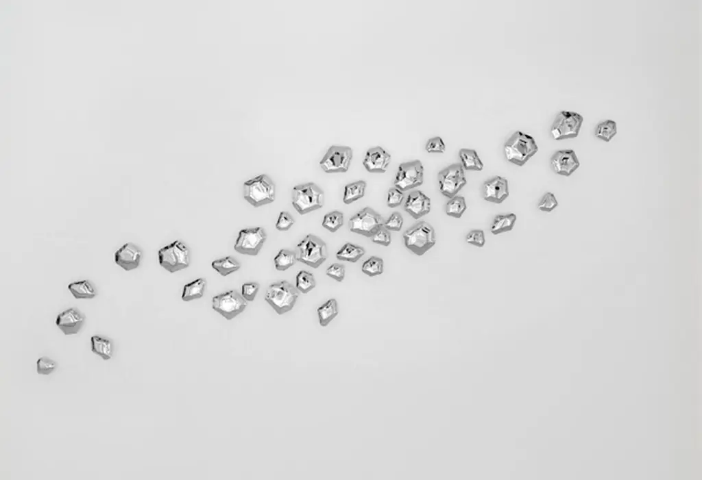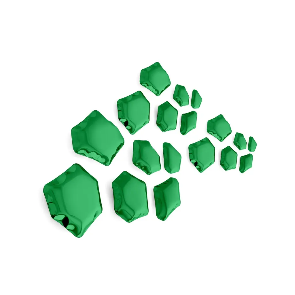 Set of 18 Kamyki Mirrors by ZietaMounted sculptureColor : EmeraldDimensions [cm]:Ø 7- 20 cm6 different formsThe Gradient Collection KAMYKI wall decor from Gradient Collection is a series of geometric objects of various sizes and shapes made of steel in FiDU technology. They resemble irregular stones or pieces of shattered glass offer and can be arranged on the wall in many ways. You can mix KAMYKI of various sizes within one chosen finish – sapphire or emerald – or you can mix them according to your needs and fantasy.KAMYKI come in different diameters from 7 to 20 cm and are available in sets of 6, 12 and 18 pieces.The Gradient collection combines an exceptional depth and unparalleled reflections of the colorized surfaces. Soft transitions between colors provide the viewers intensive visual experiences. A change of point of view leads to a change in color perception. Mirrors from the Gradient series are made of stainless steel, polished to a mirror finish and covered with a special lacquer, creating on their surface a unique composition of colors with exceptional depth and unparalleled reflections.
