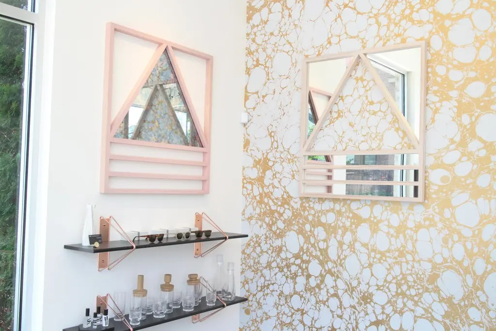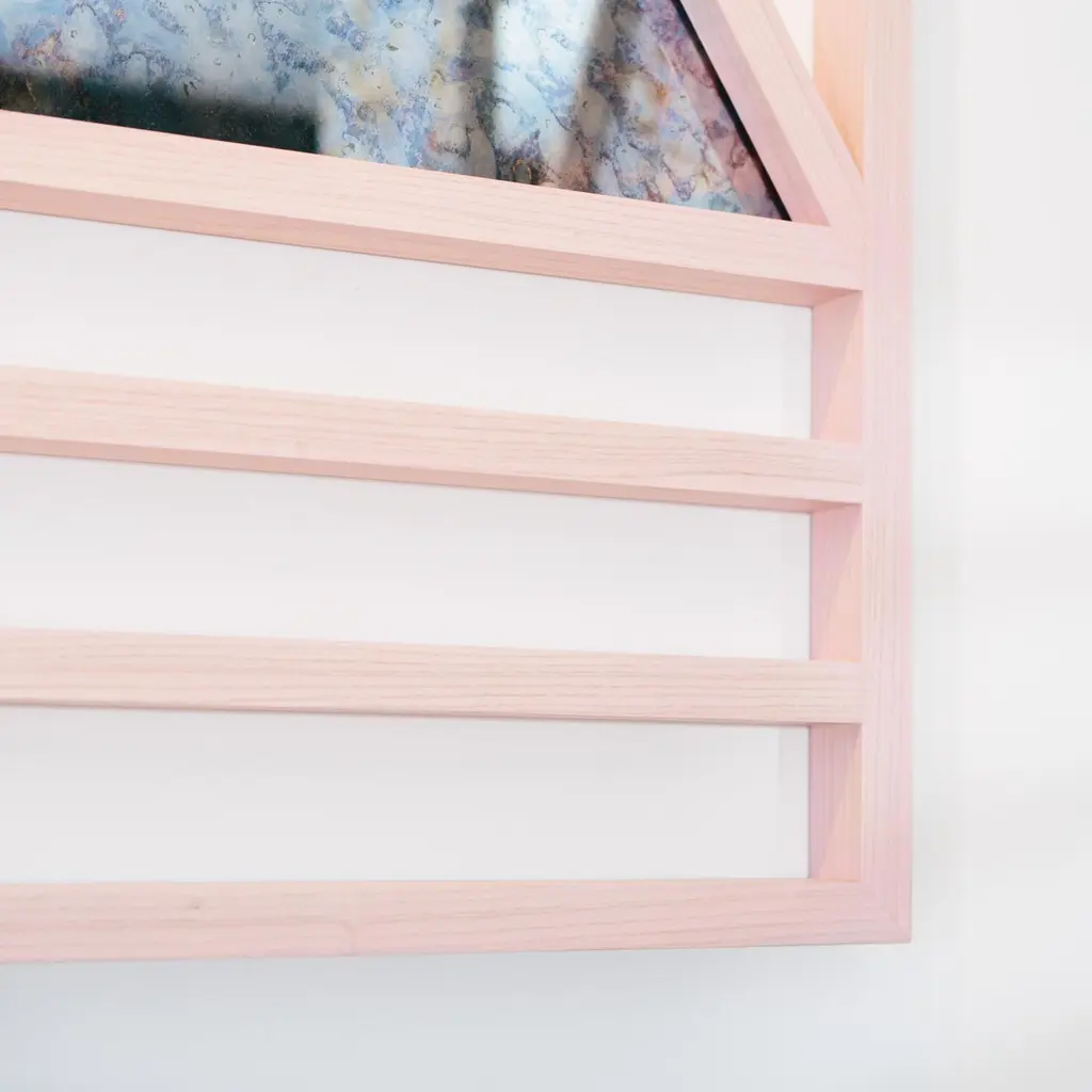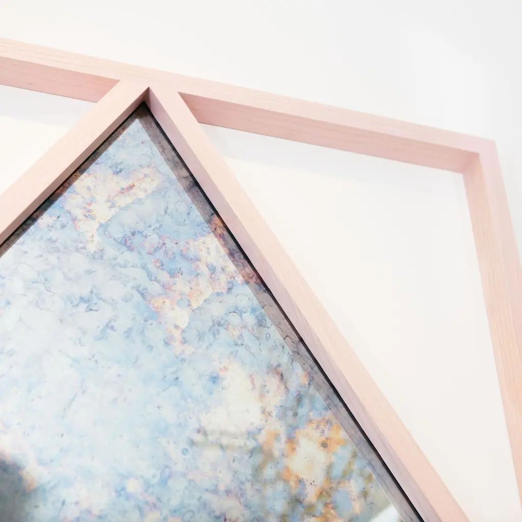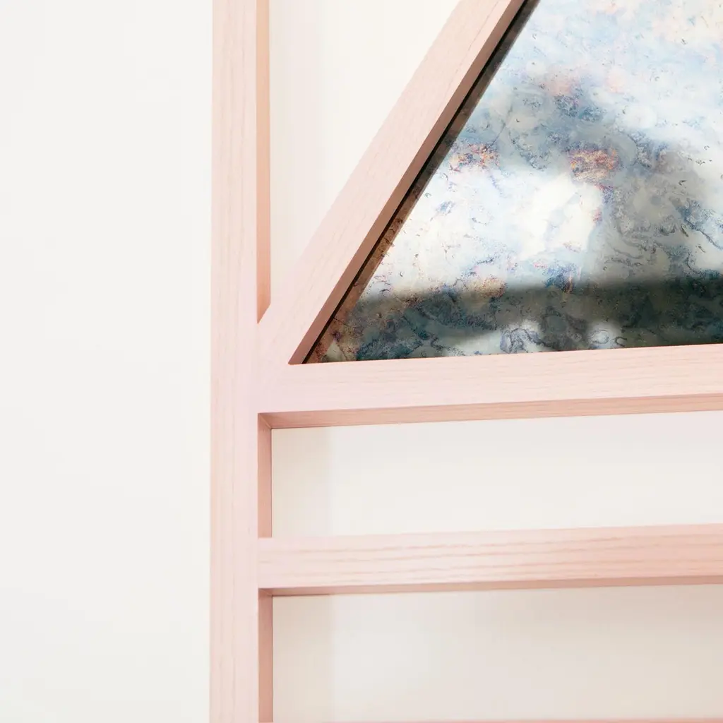 The "Simplex Hydrangea" mirror is from the 2016 collection of Alex Drew & No One. Inspired by traditional craftsmanship while incorporating a modern edge, AD & NO's work plays on light, textures, and form.Each piece is handcrafted by Alex Rosenhaus and Drew Arrison in Detroit, MI."Simplex Hydrangea" Mirror, 2016.Shown in pink-washed solid ash with a lacquer finish. The mirror is in a floral antiqued custom finish.