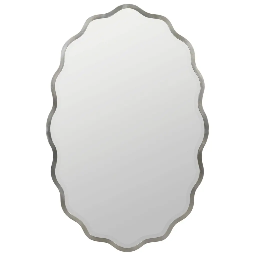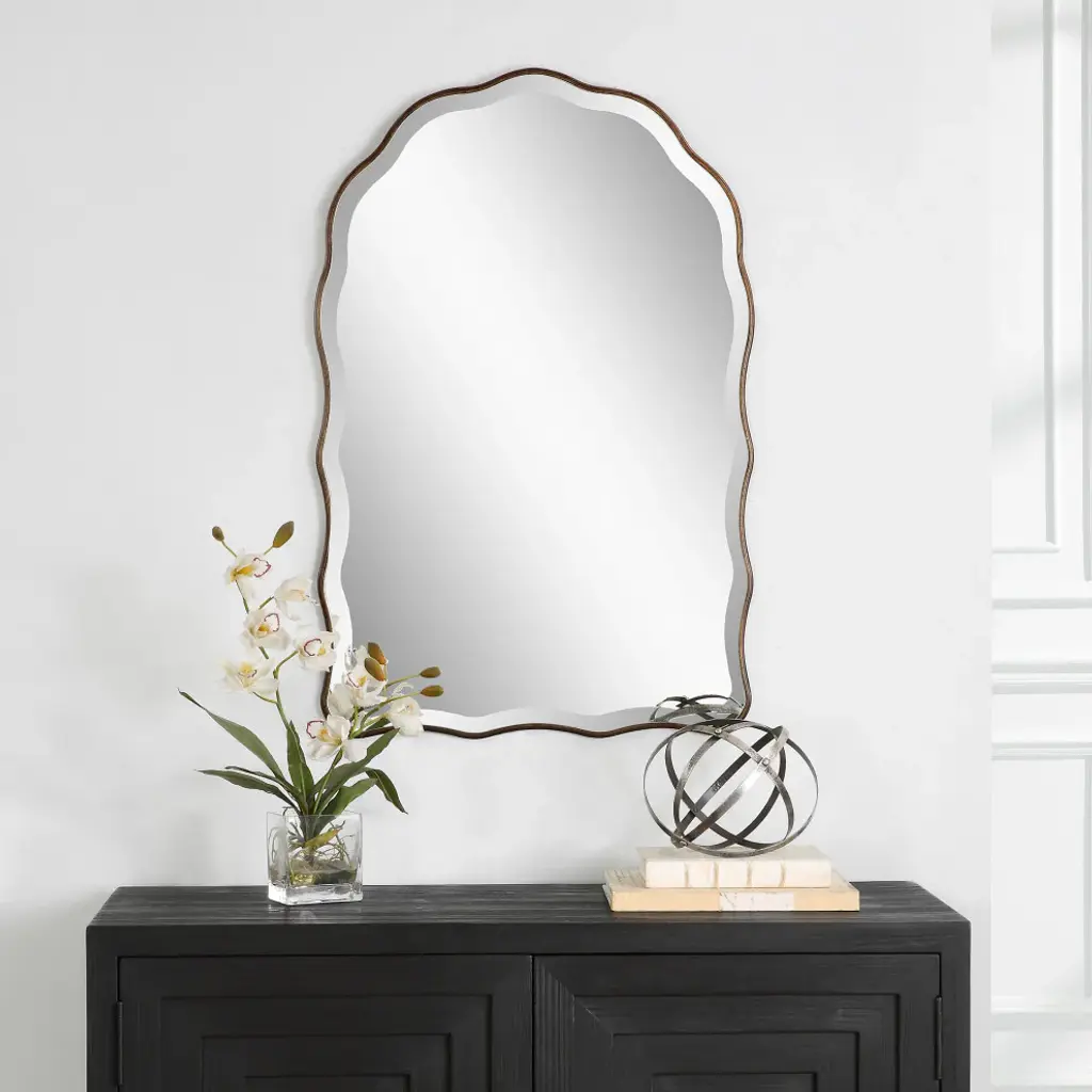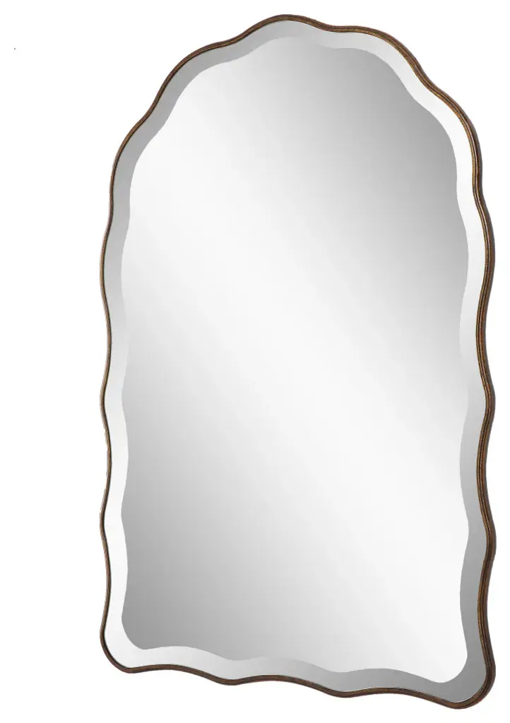Scalloped edges define this beautiful arch top mirror, giving it a more feminine and delicate appearance. The frame is finished in an antique bronze with gold highlights and surrounds a 1" beveled mirror.