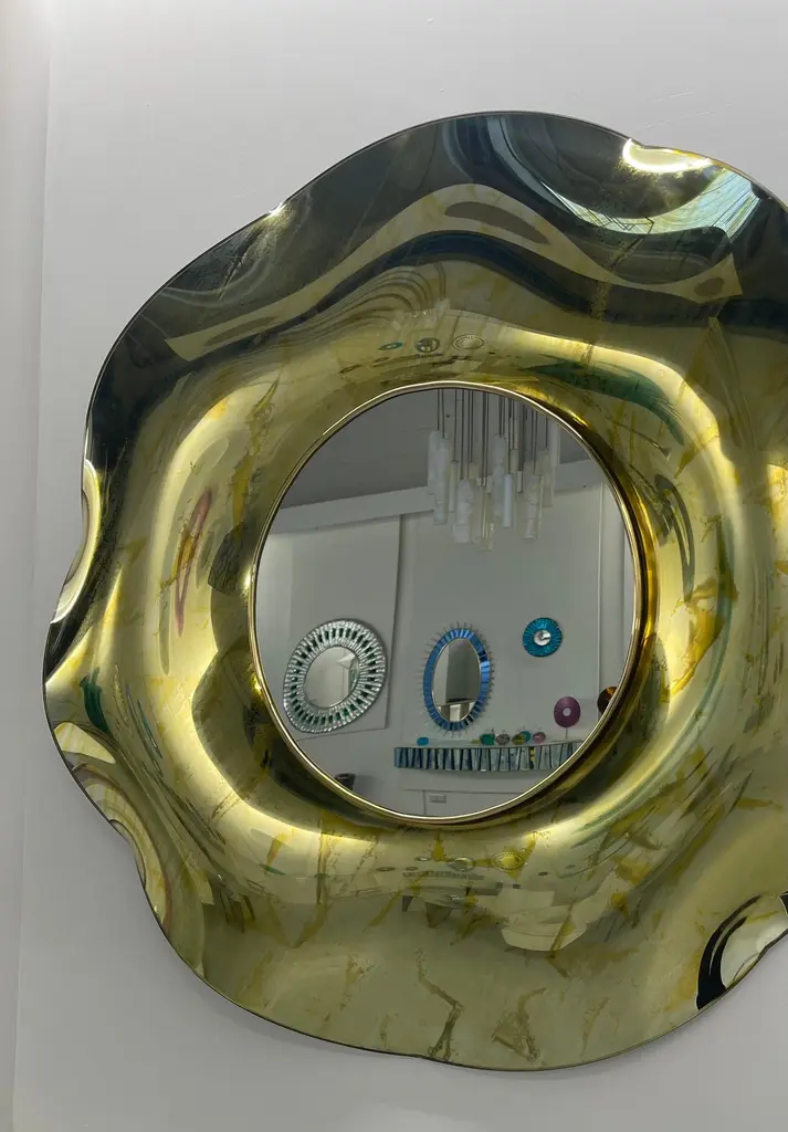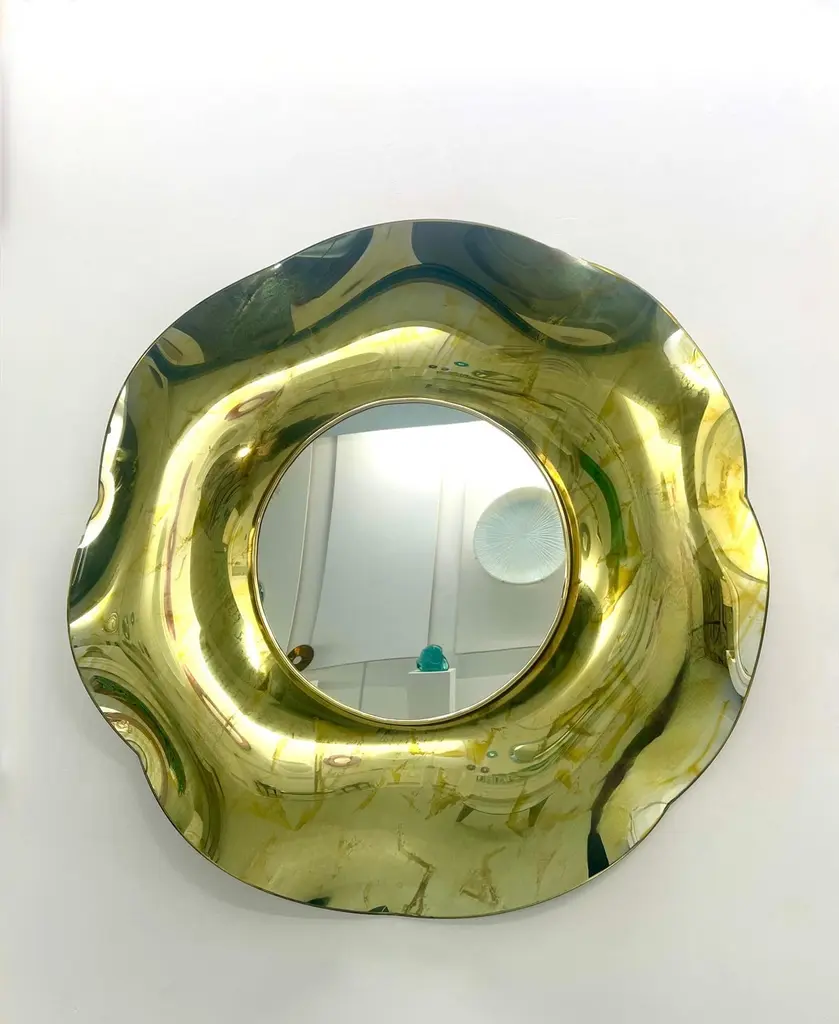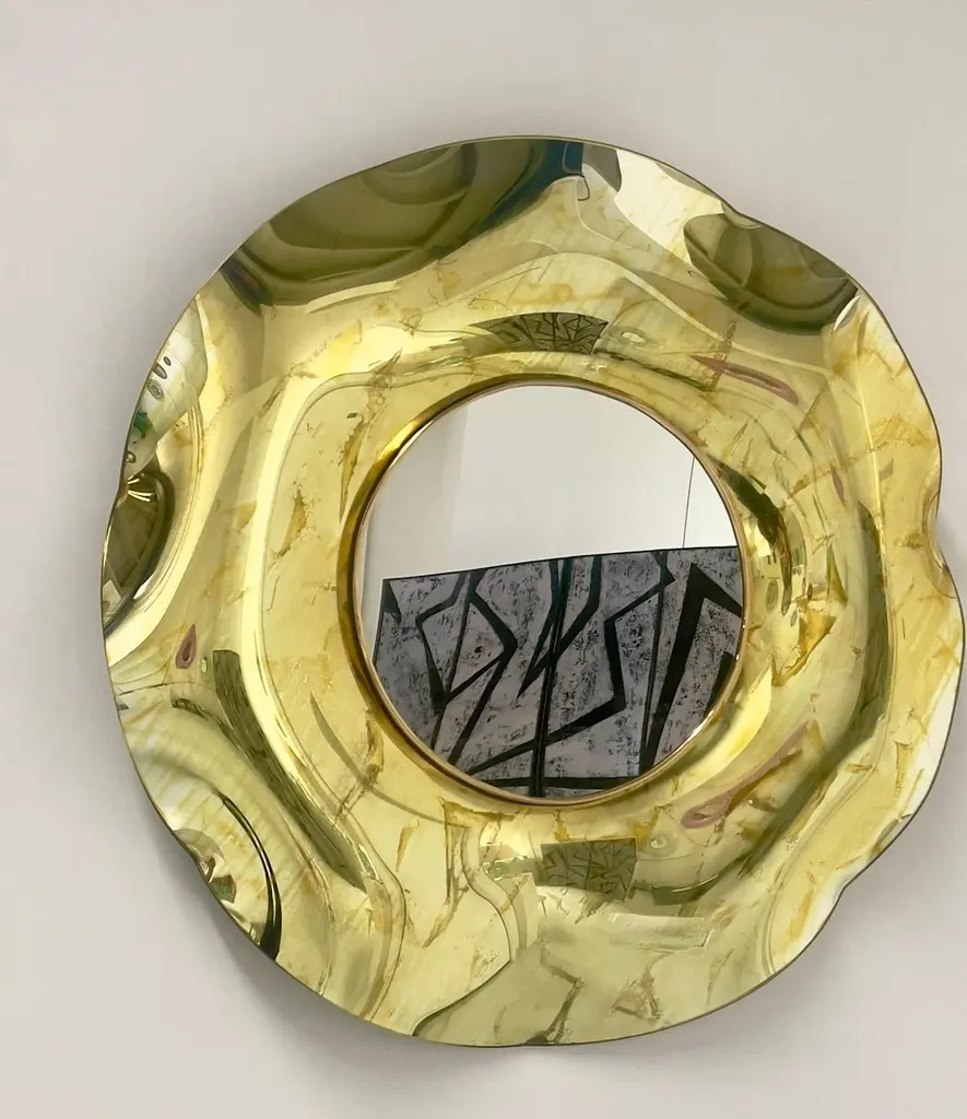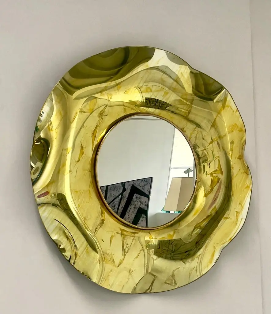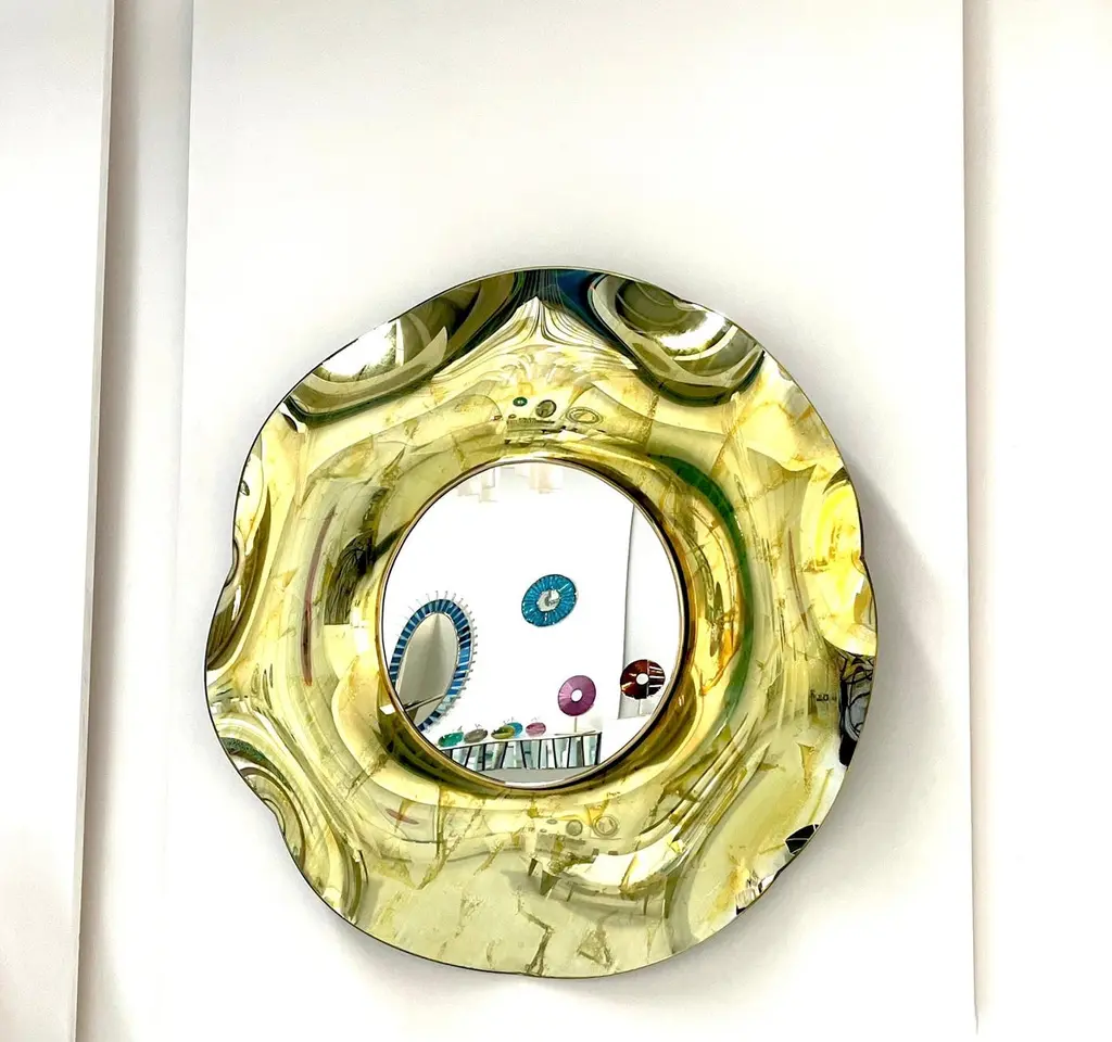 The ‘Undulate’ wavy mirror is an artistic object of pure art and italian design. The crystal has been hand-worked and expertly curved by the artist. The support structure is made of wood and brass. Its circular shape and its harmonious curves give lightness and elegance.The finish is an intense gold color with random tone-on-tone 'spots' which in some places have the effect of bubbles.. Each mirror is signed. Every imperfection is to be considered a value and not a defect, a guarantee of the extreme naturalness and craftsmanship of our product.These items are handmade and will not be all exactly the same