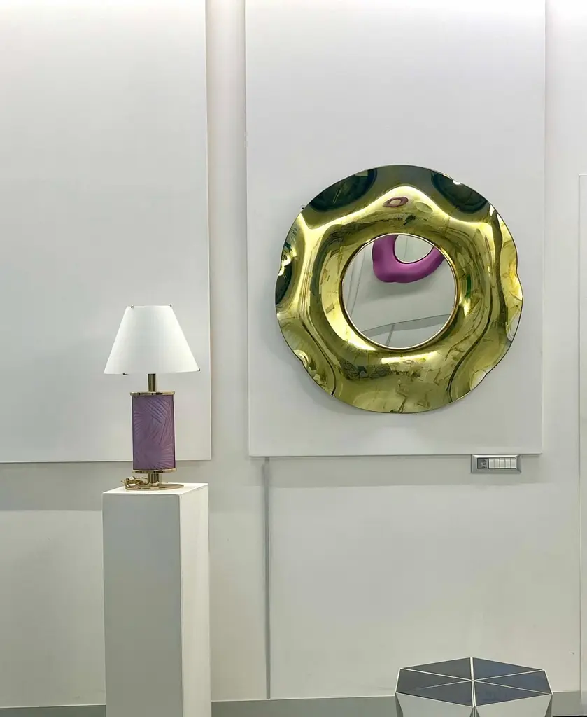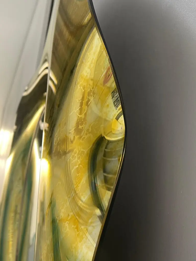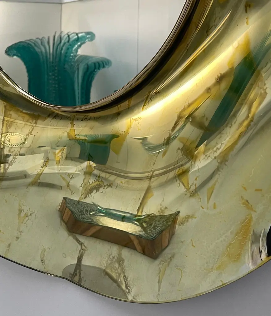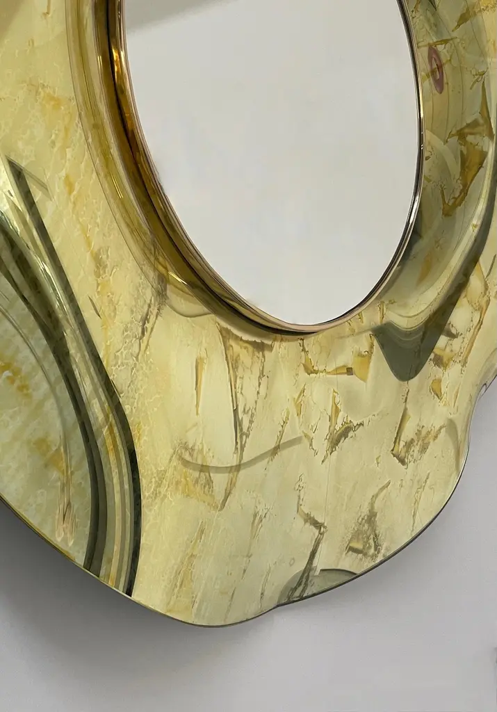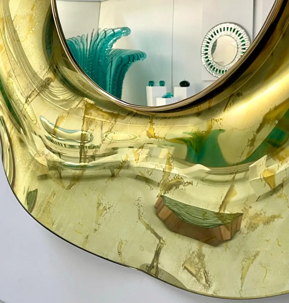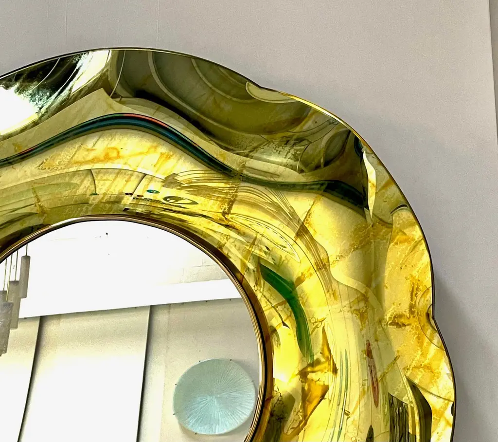 The ‘Undulate’ wavy mirror is an artistic object of pure art and italian design. The crystal has been hand-worked and expertly curved by the artist. The support structure is made of wood and brass. Its circular shape and its harmonious curves give lightness and elegance.The finish is an intense gold color with random tone-on-tone 'spots' which in some places have the effect of bubbles.. Each mirror is signed. Every imperfection is to be considered a value and not a defect, a guarantee of the extreme naturalness and craftsmanship of our product.These items are handmade and will not be all exactly the same