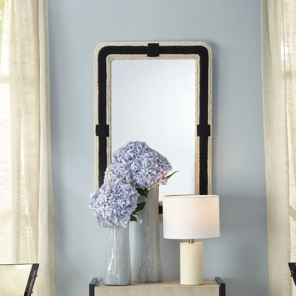 We add a little French chic to a classically nautical look to create this jaunty wall mirror. The frame is intricately braided cotton-jute rope, with rows of black and off-white that contrast stylishly. The finished back has hanging loops that allow it to be displayed horizontally or vertically to suit your interior