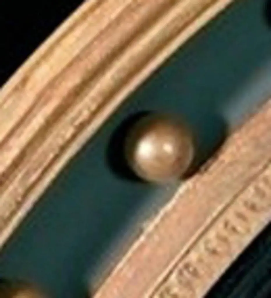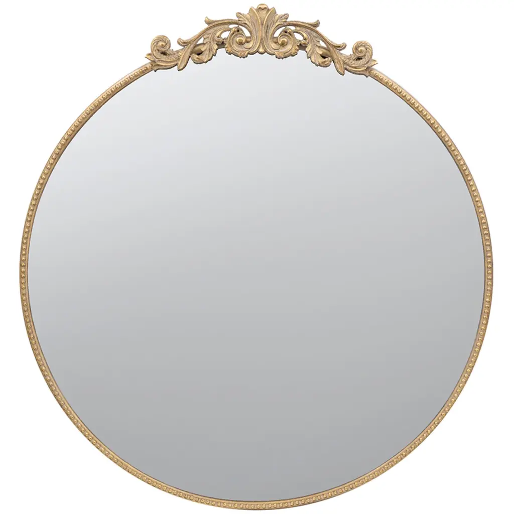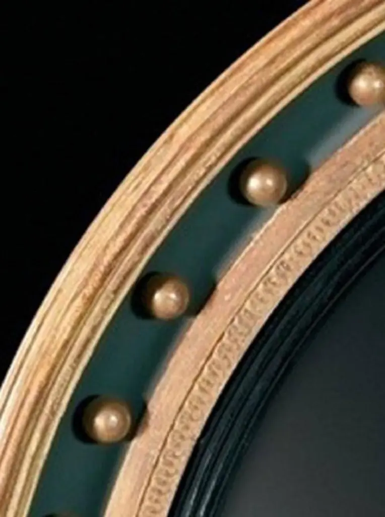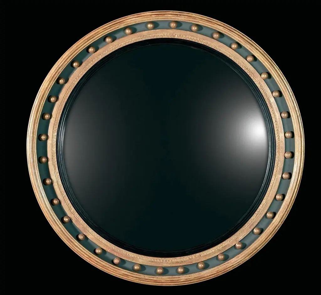 This plain, carved, giltwood and ebonized convex looking round mirror glass has a moulded inner frame and a compound moulded outer frame with decorative gilded balls punctuating the bronzed ground.Suitable for the bedroom, hall, lounge, or dining room.We are currently working to a 30-36 week lead time.
