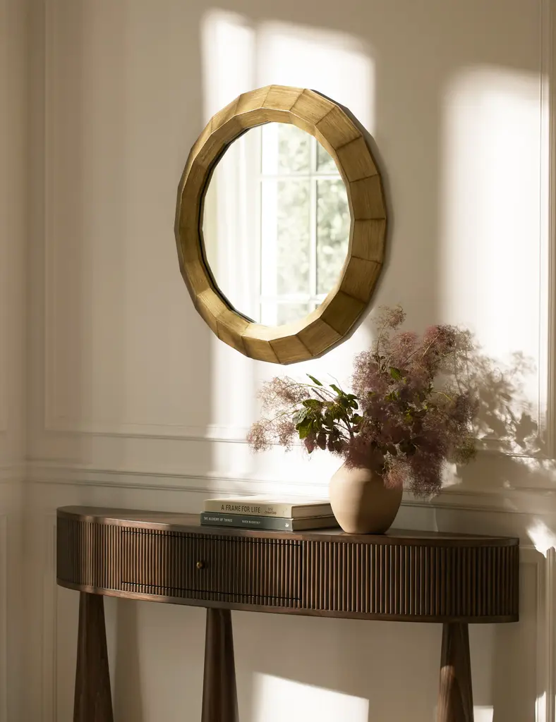 Our Copeland mirror is the perfect piece to refresh your edit. This handcrafted resin-framed mirror features a subtle grain with angular lines adding depth and dimension to the round design. Use this mirror to enhance the sense of space and light in a room while creating a stylish focal point.