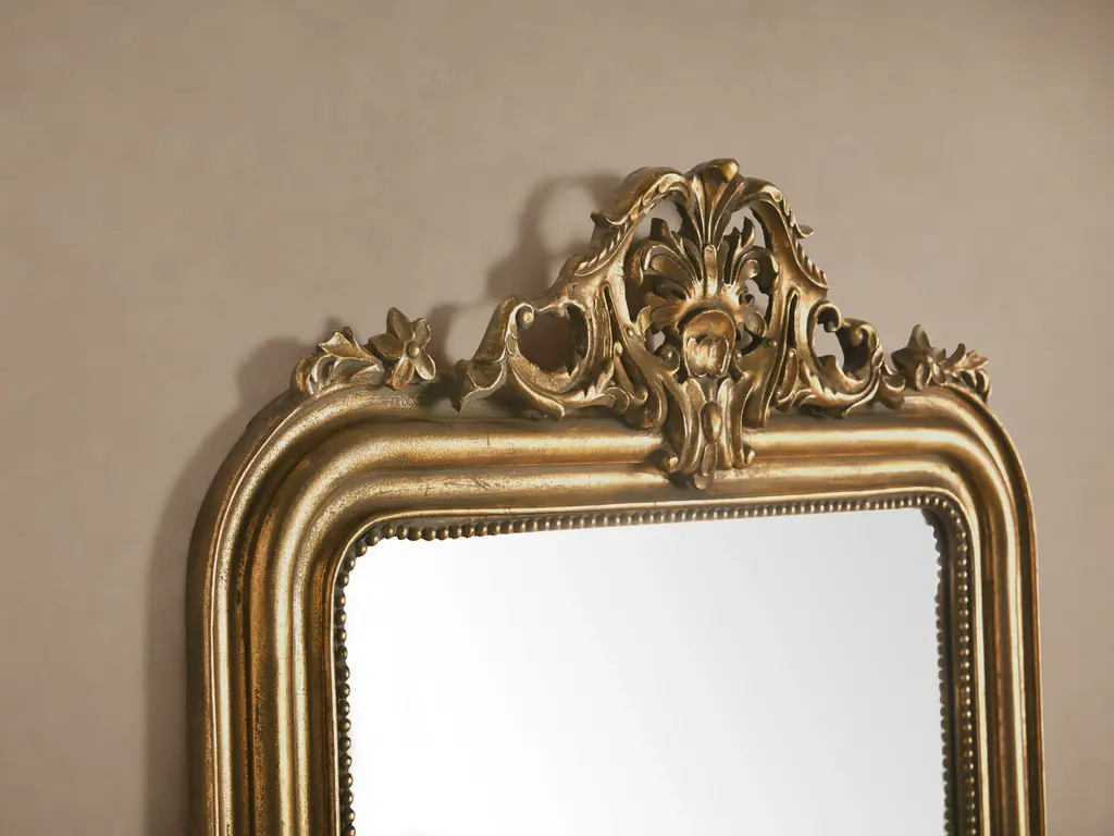 Inspired by antique French design, our Copenhagen Wall Mirror is framed in decorative molding with a warm aged gold finish. Scrolling details at the mirror’s peak add an elegant flourish that complements both classic and contemporary décor.