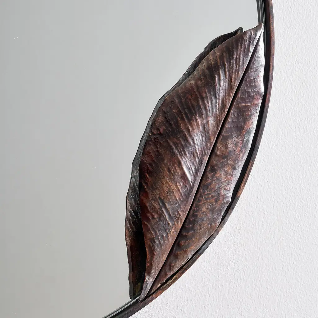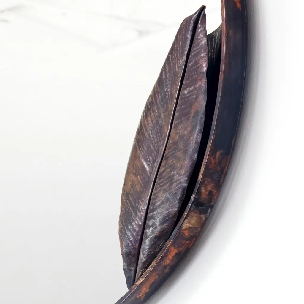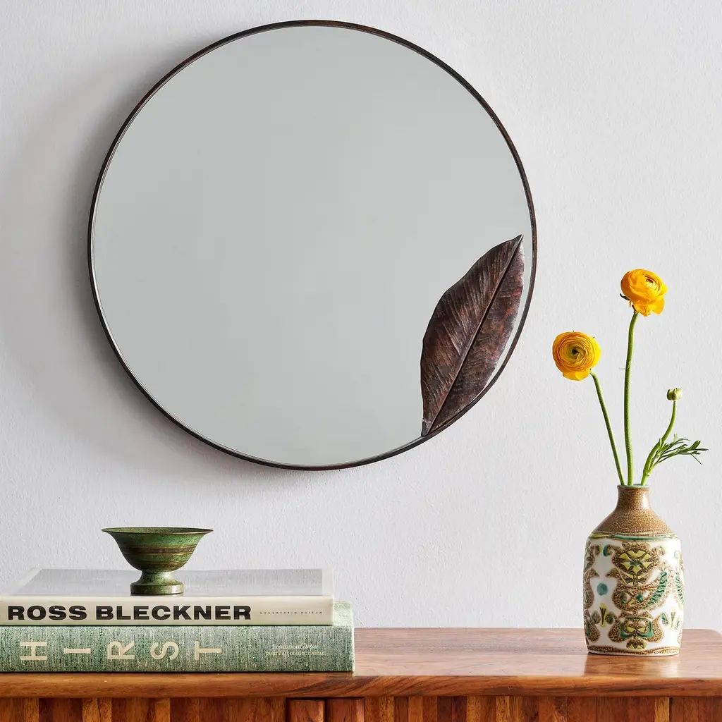 Handcrafted of copper, this Copper Leaf Round Mirror features a single folded leaf gently arching over the glass. Inspired by botanical form and crafted with precision, this piece is both functional and deeply expressive, a reflection of nature’s quiet strength, reimagined for the interior landscapes. Whether styled in an entryway, powder room, or layered gallery wall, this mirror anchors spaces with calm sophistication and a signature handmade touch.Our finishes are applied by hand rather than by machine and are influenced by various elements such as time, touch, and climate, which give each piece its own unique character. Each piece is unique, with slight variations, due to the artisan nature of our handcrafted finishing process. Handmade in the U.S.A., the lead time for the standard size is 6-8 weeks plus shipping.