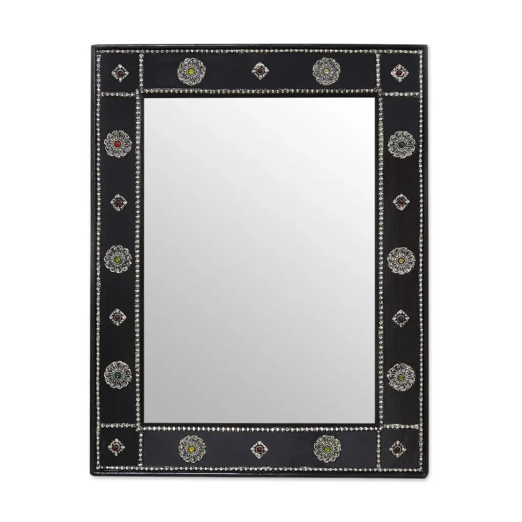 Depicted in repoussé, Buddha meditates serenely. Khalid Ali creates a sensation of total tranquility with the beautiful wall mirror. He crafts the frame of mango wood, adding floral details in embossed copper bathed in nickel.