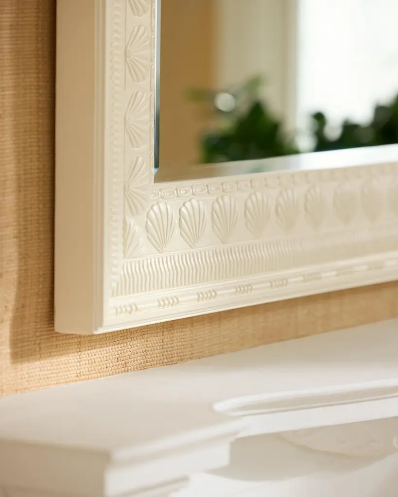 La rivage. An antique finish, a painted frame. Delicate shells adorn a white canvas. An accent from the shore.