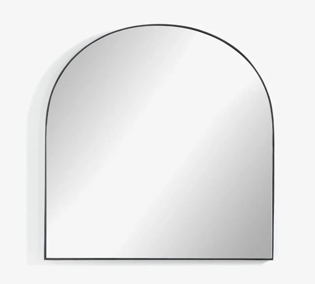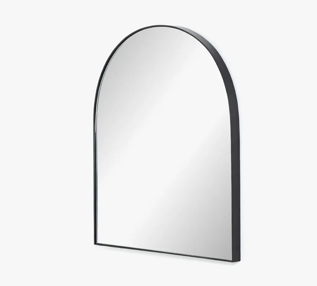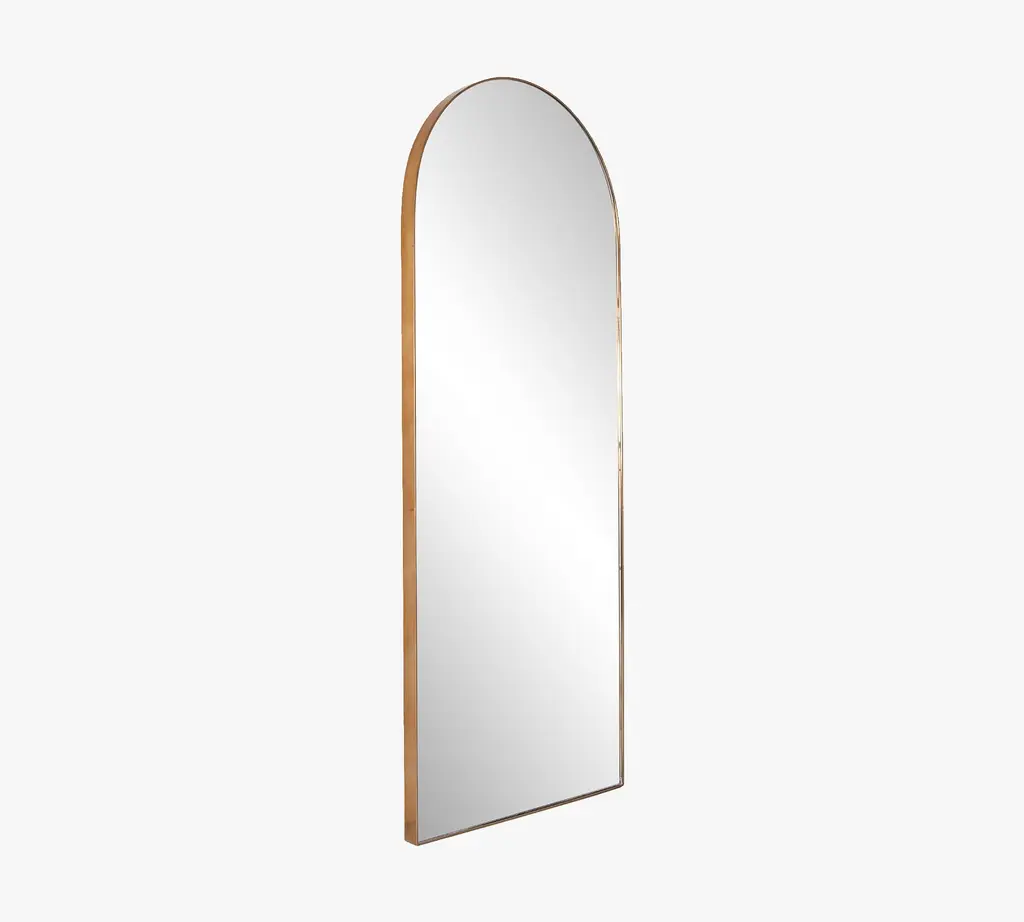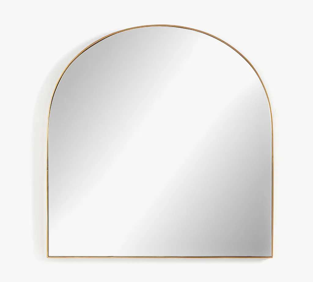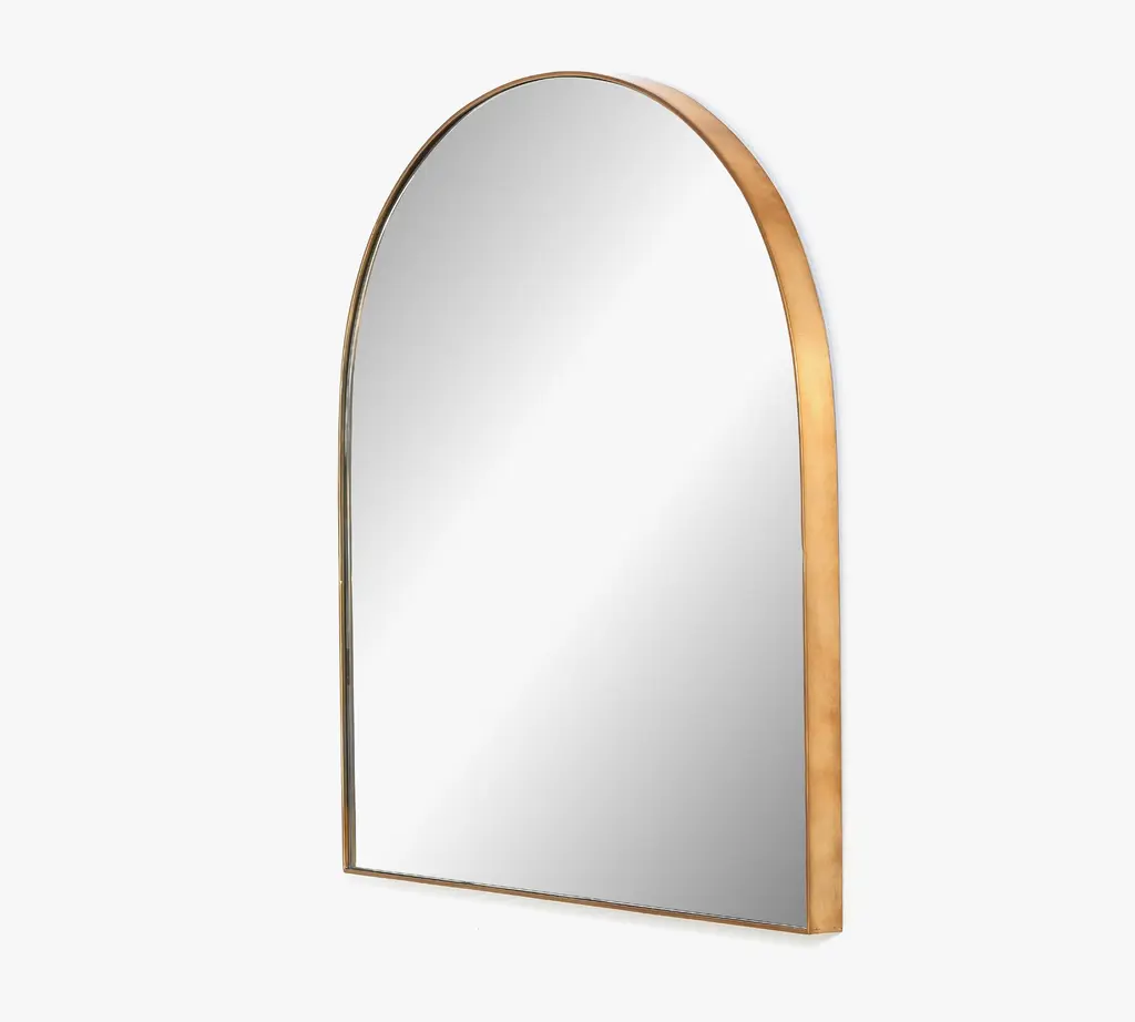 A beautifully arched mirror with a brass-finished aluminum frame has tonal warmth and architectural definition. Whether over the dresser, mingling with a gallery wall, or as an entryway accent, the curved design naturally softens any space.