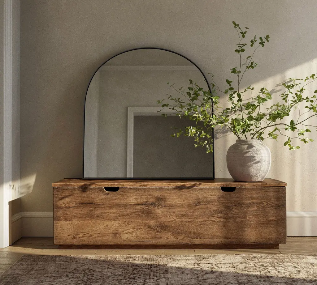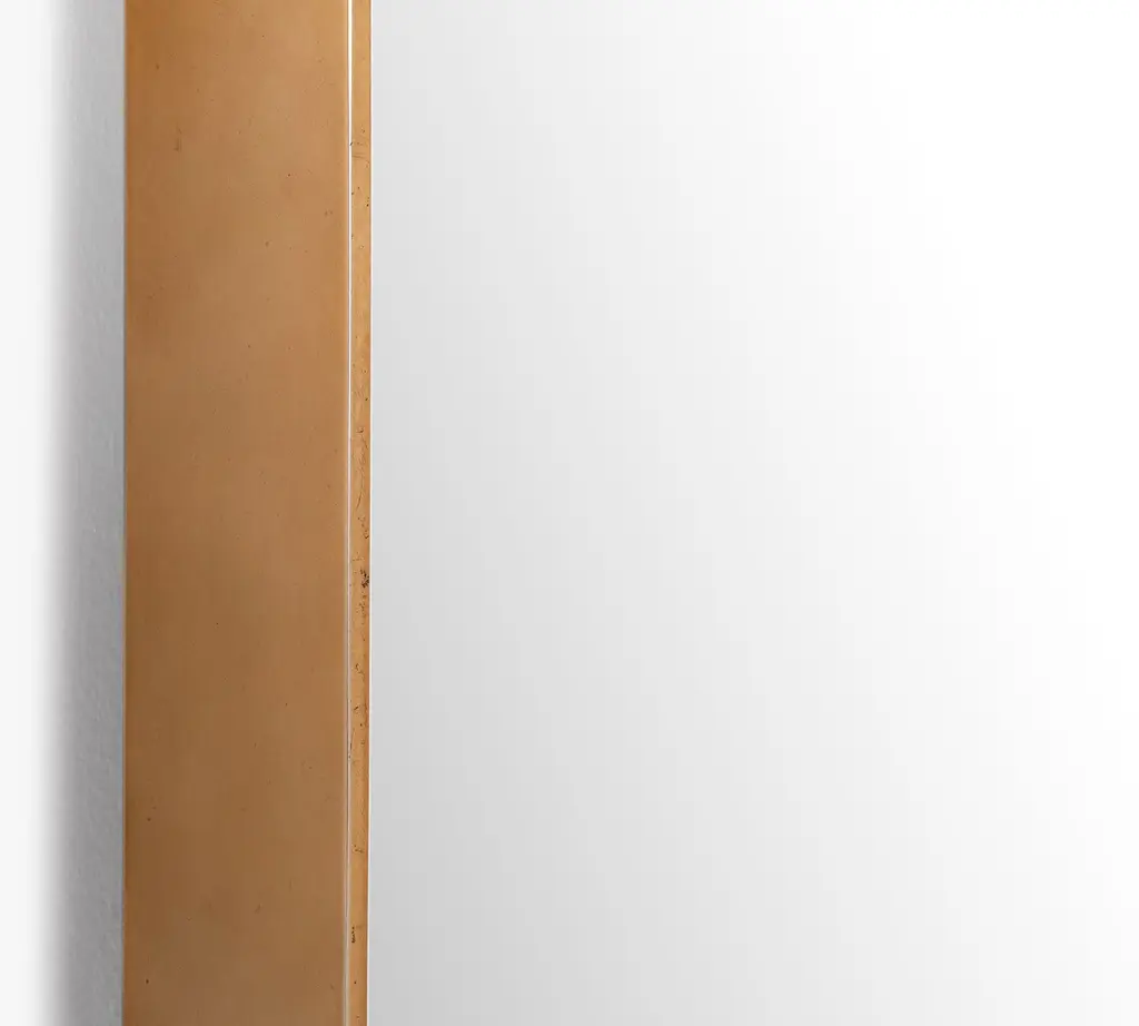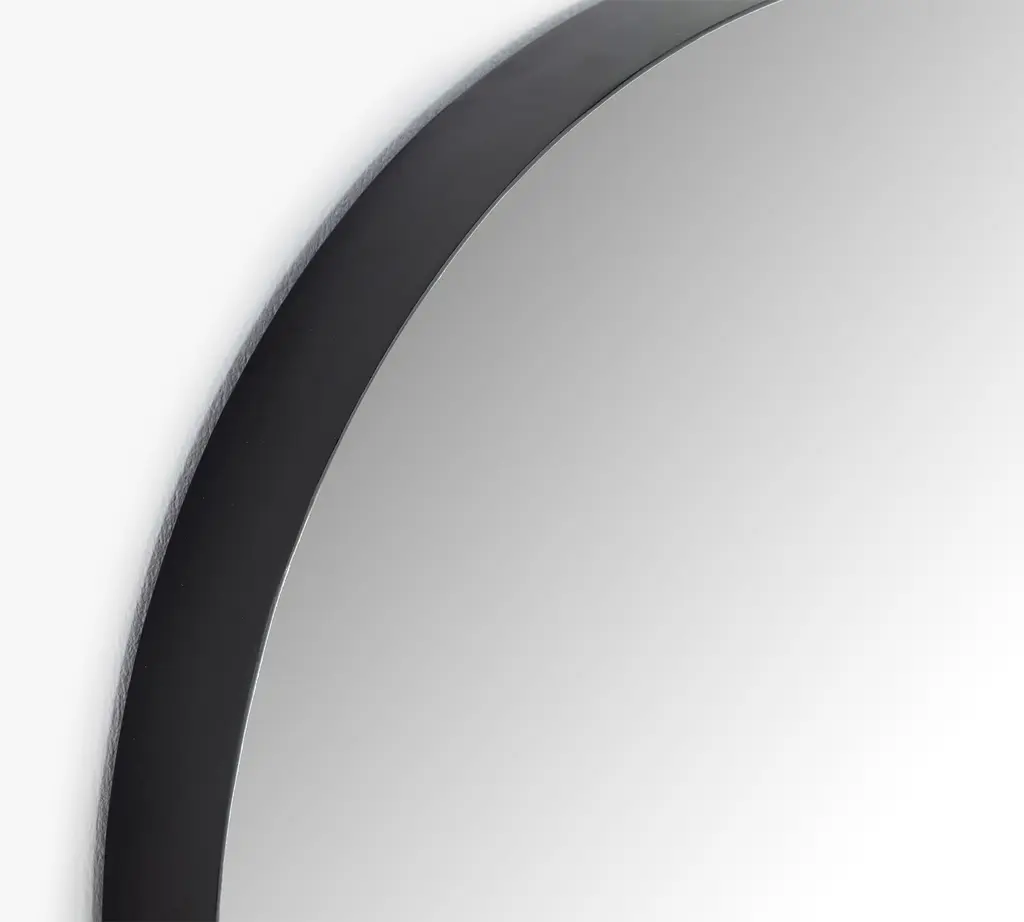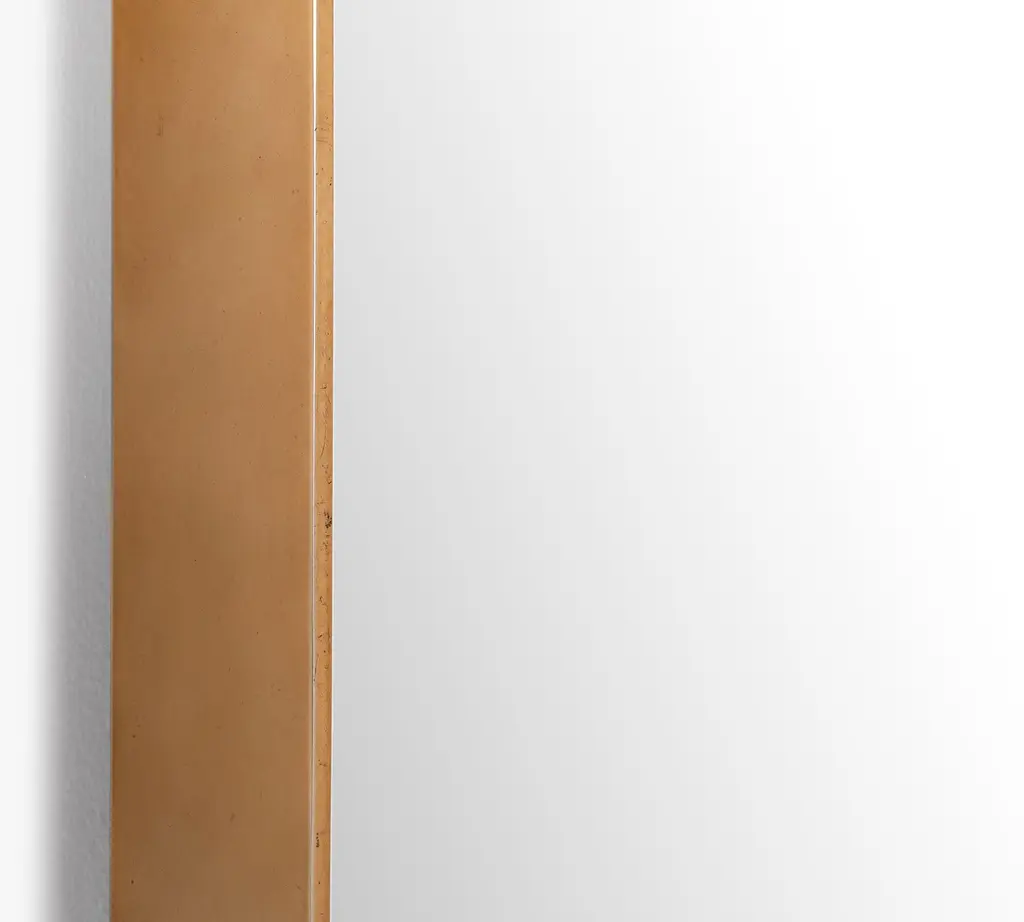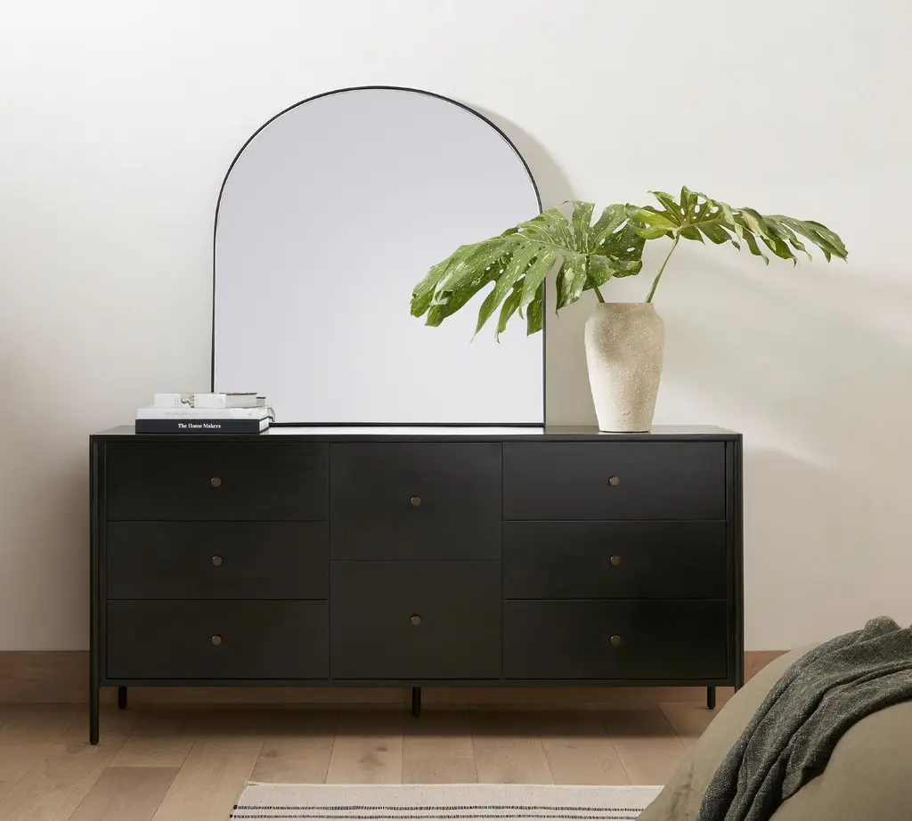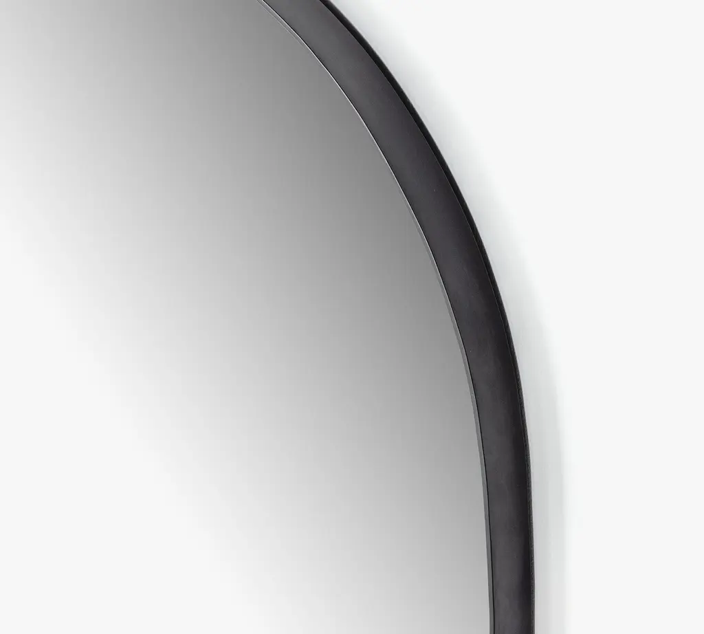 A beautifully arched mirror with a brass-finished aluminum frame has tonal warmth and architectural definition. Whether over the dresser, mingling with a gallery wall, or as an entryway accent, the curved design naturally softens any space.