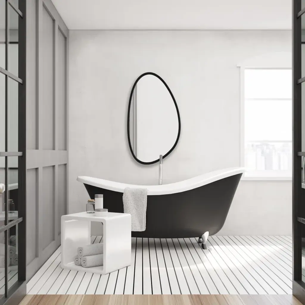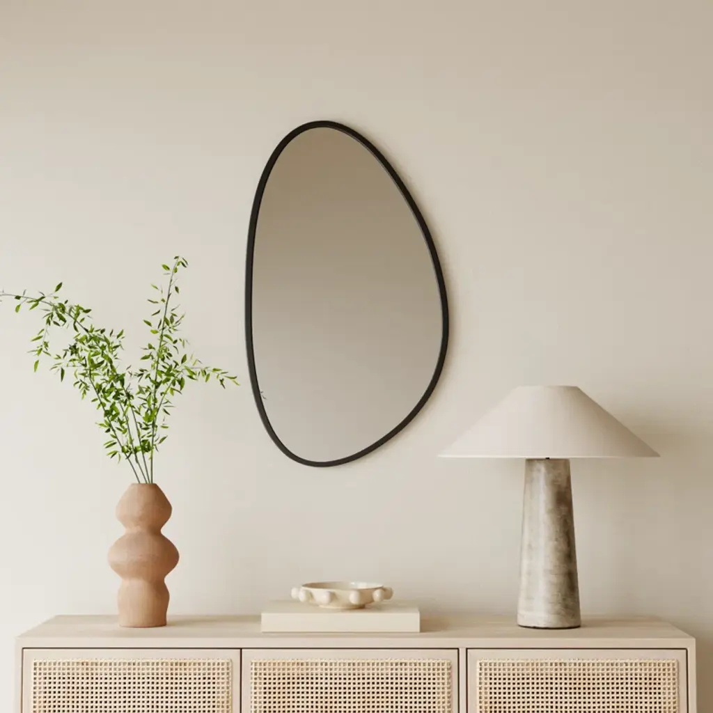 This asymmetrical frame will add a sense of uniqueness to any room. Perfect for a powder room or in the master bath, the choices are numerous. The frame is made of an engineered polymer and has a matte black finish. For even more options, it can be hung three ways - two ways vertically and one way horizontally.