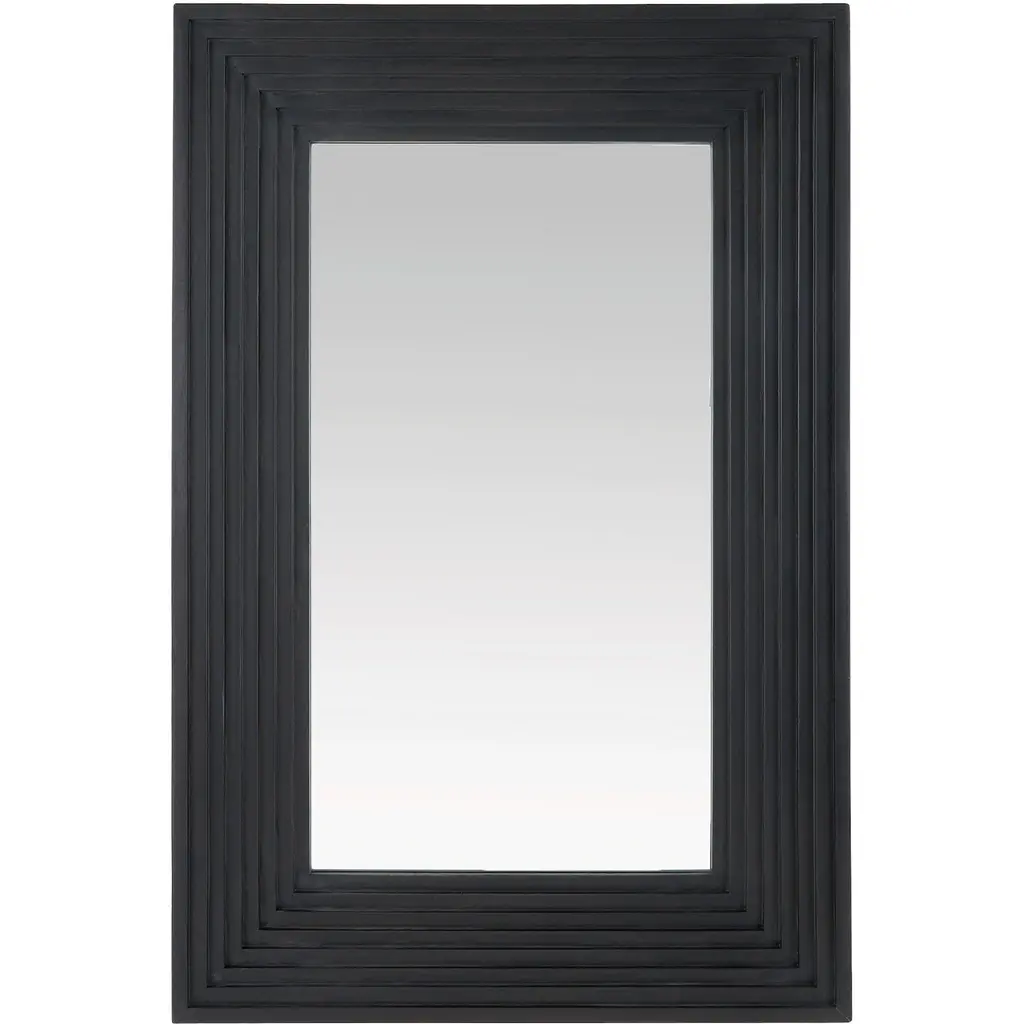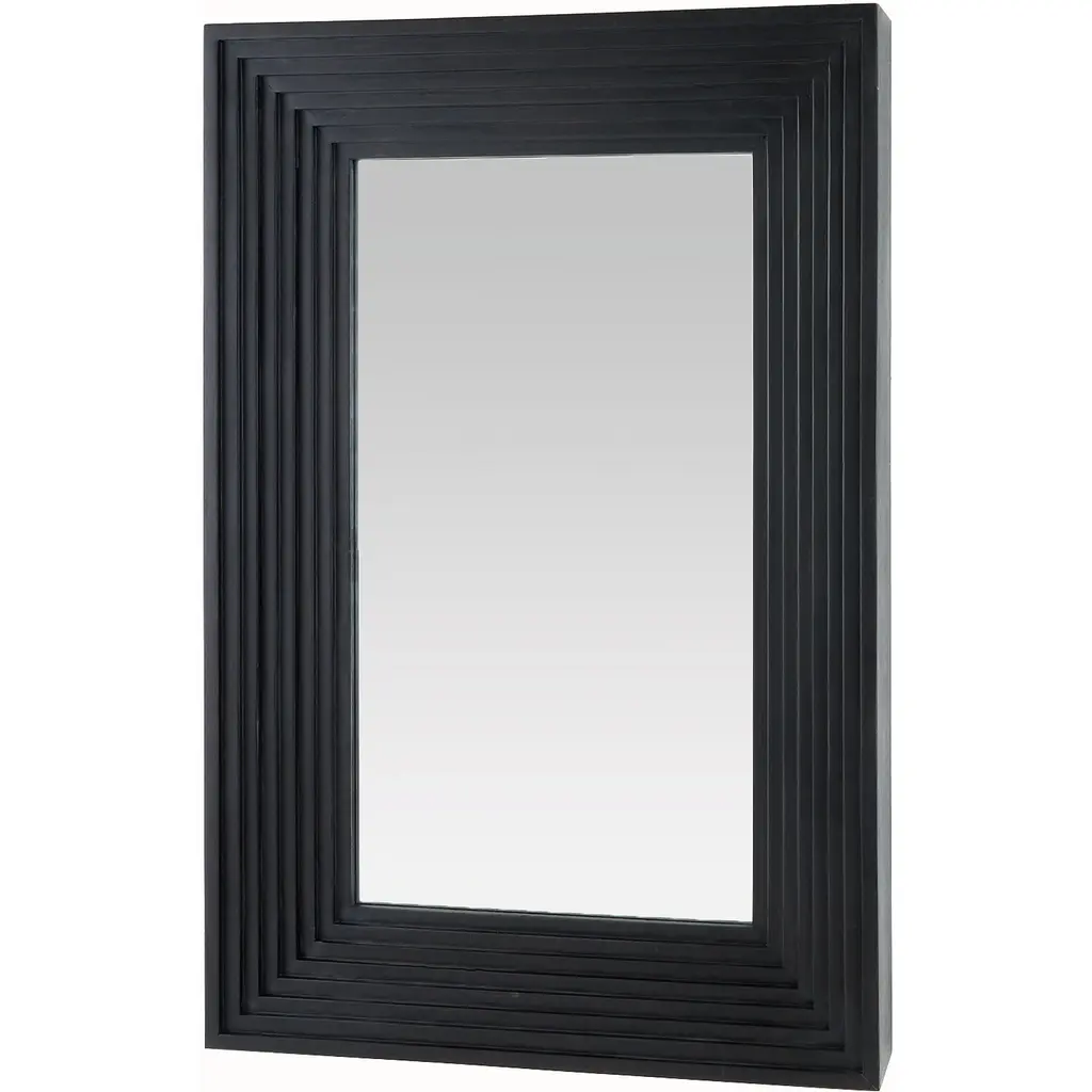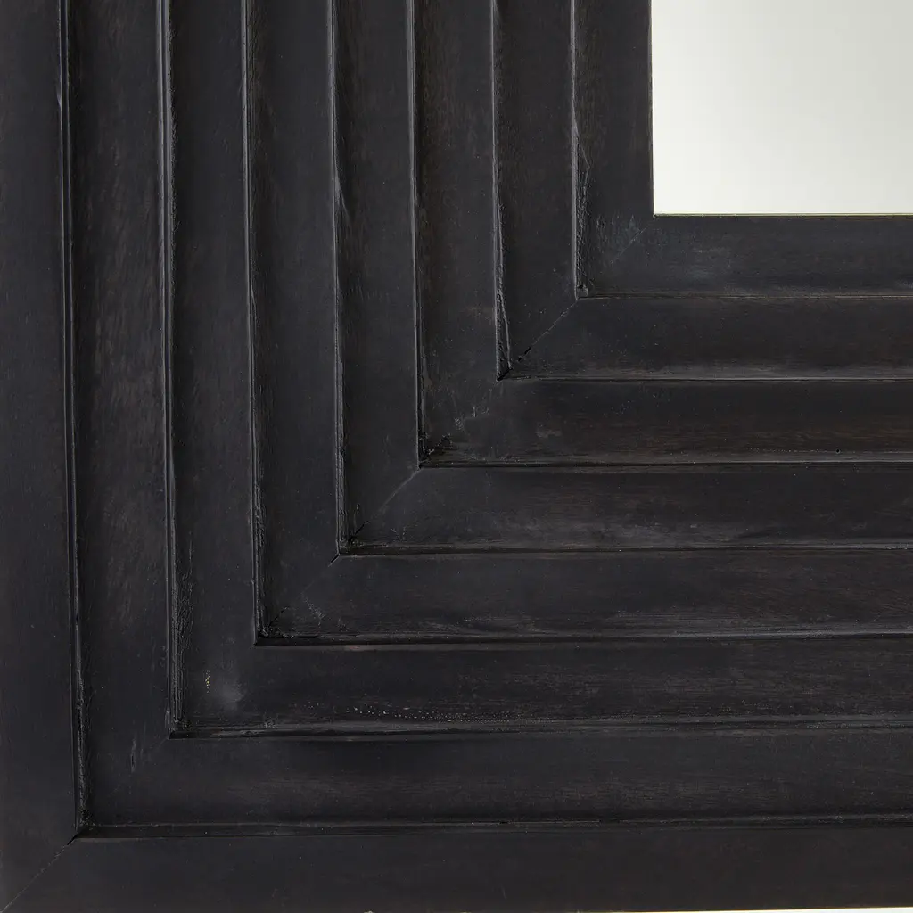 A minimal rectangular mirror is framed with stepped, muscular detailing carved to draw the eye. Crafted of mango wood of a rich ebony hue, our inverted style was designed to be hung horizontally or vertically. Accented with a secure cleat attachment at the back. Finish will vary.