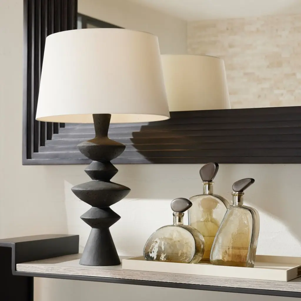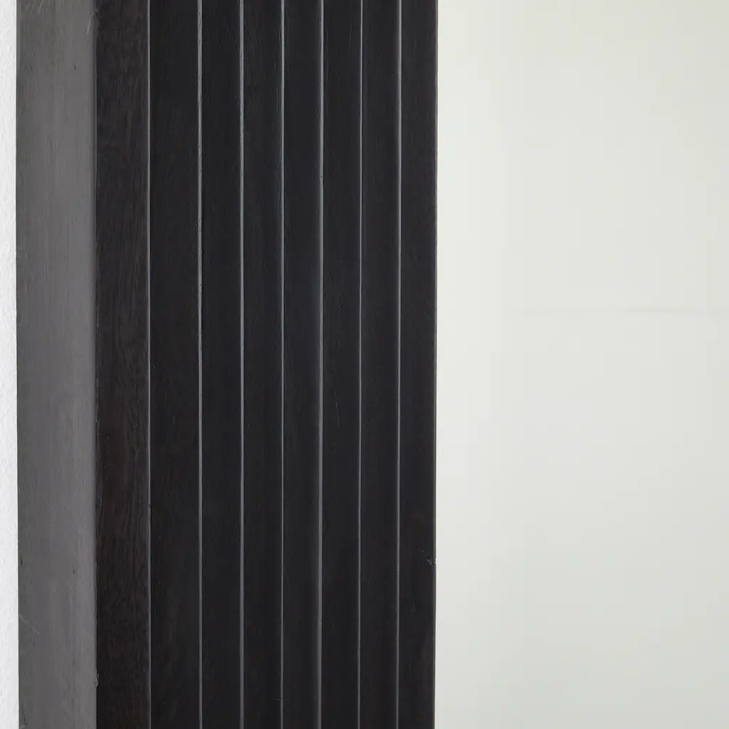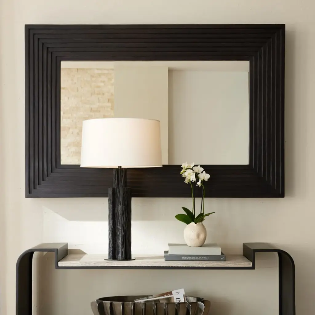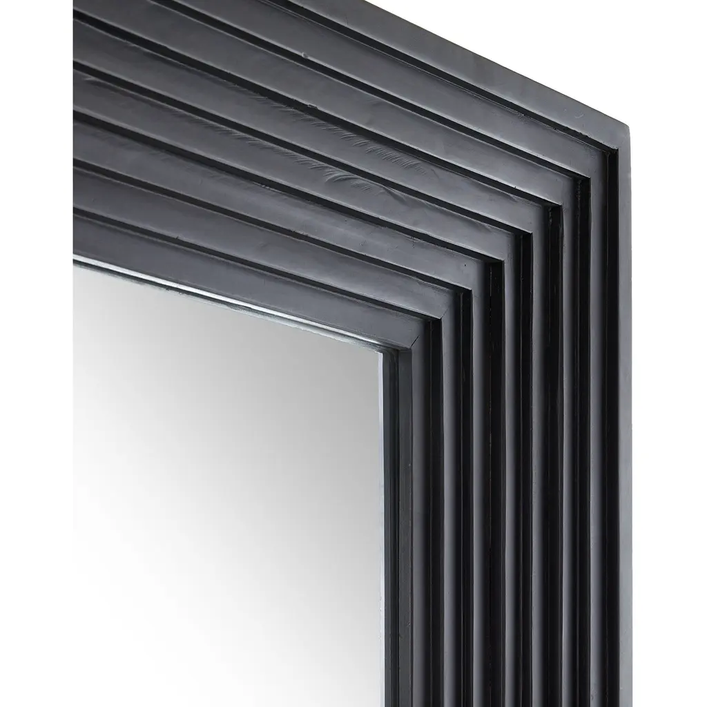 A minimal rectangular mirror is framed with stepped, muscular detailing carved to draw the eye. Crafted of mango wood of a rich ebony hue, our inverted style was designed to be hung horizontally or vertically. Accented with a secure cleat attachment at the back. Finish will vary.