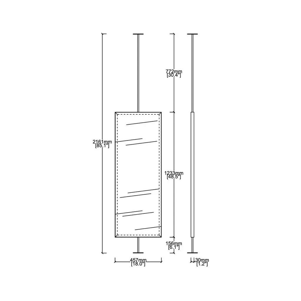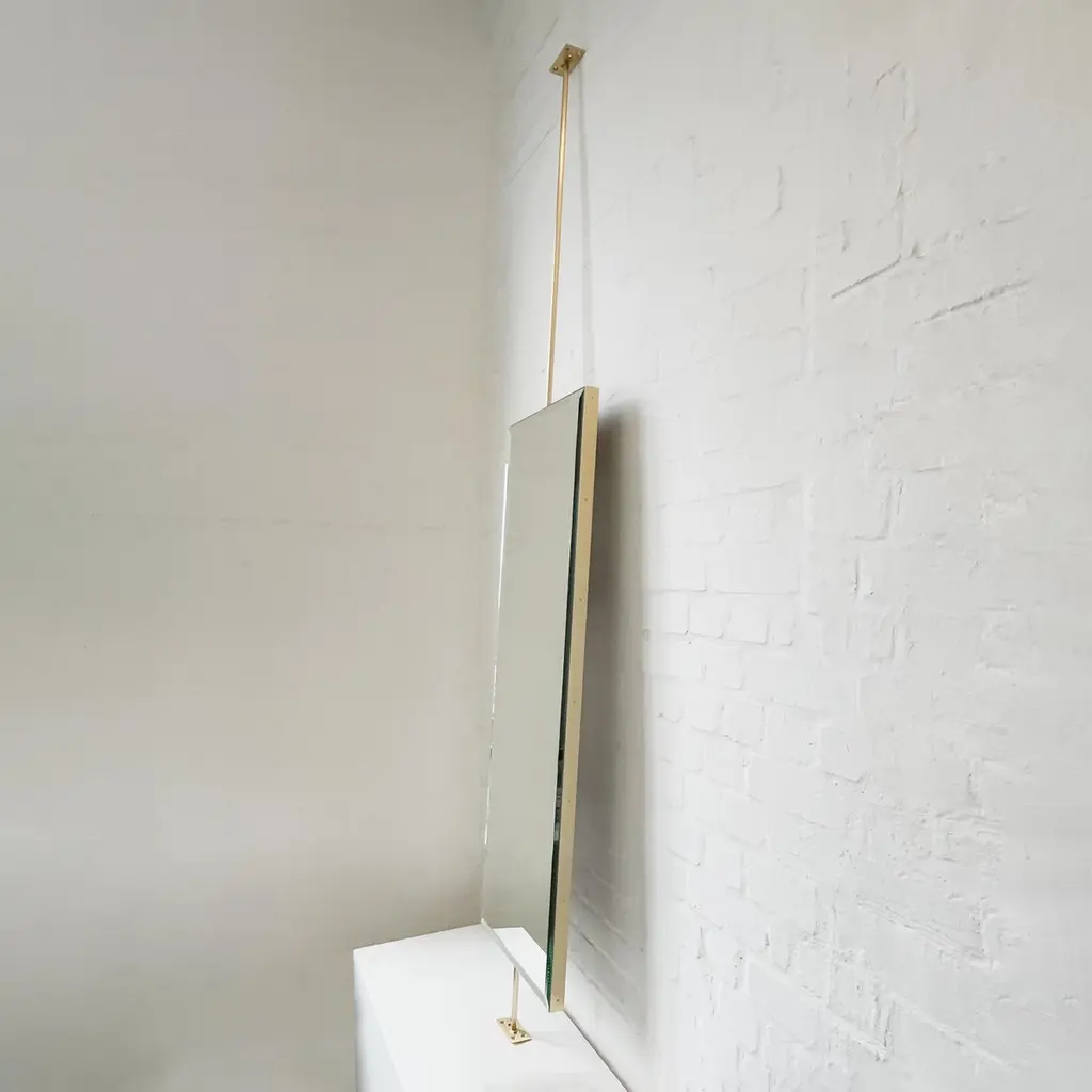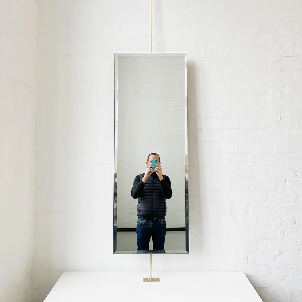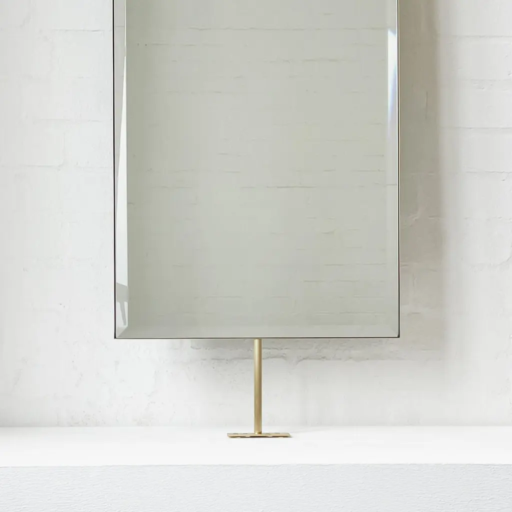 Quadris™ countertop to ceiling attached rectangular bevelled mirror with an elegant solid brushed brass minimalist frame. This mirror is fully customisable. Designed and handcrafted in London, UK.Dimensions:H 123.3cm x W 45.7cm x D 3cm (Drop 111.7cm, Rise 15cm)H 48.5in x W 18cm x D 1.2in (Drop 44in, Rise 6.1in)Overall height: 218.6cm / 86.1inThe mirror dimensions, drop and rise are fully customisable. Please contact us for further information.The high quality finish of our suspended mirrors extends to their backings, which are made from a powder coated panel available in black or white. Backings can also be upgraded to a finish that matches the frame or can be substituted by a second mirror, making your mirror double sided.The ceiling plate is supplied with a cover hiding the screws to complete the minimalist design of the mirror.This mirror is fully customisable. Shipped safely and insured worldwide. All our mirrors are made on demand. Fabrication lead time for this particular mirror is approximately 6 to 7 weeks. Our mirrors are always shipped by courier express. Shipping via courier express typically requires 1 to 2 days to the UK, or 2 to 7 days outside the UK depending on the destination.Available options:• double sided mirror• backing in a finish that matches the frame• frame finishes: brass (brushed, polished or with a bronze patina), copper, stainless steel, blackened metal, powder coated aluminium in a range of standard or bespoke colours• full frame that extends to the front of the mirror• mirror tints: standard silver, black, bronze, gold, blue, rose gold / peach• back-illumination creating a halo effect• front-illumination around the periphery of the mirror• ON/OFF sensor switch• demister padA presentation illustrating the options above is also available on demand. Please contact us for a quote for any bespoke specification or added options.IMPORTANT NOTES:- This mirror is intended to be fitted onto a countertop and must be attached to the ceiling. Ceiling suspended mirrors or countertop mirrors are also available on demand.- Prices on the website do not include taxes and / or applicable import duties for deliveries outside the United Kingdom.ORDERS OF MULTIPLE MIRRORS OF THE SAME TYPE: Please contact us to receive a Packing and Shipping quote when ordering multiple mirrors of the same type. An order for multiple mirrors of the same type may not be accepted without extra packing and shipping fees. Thank you.