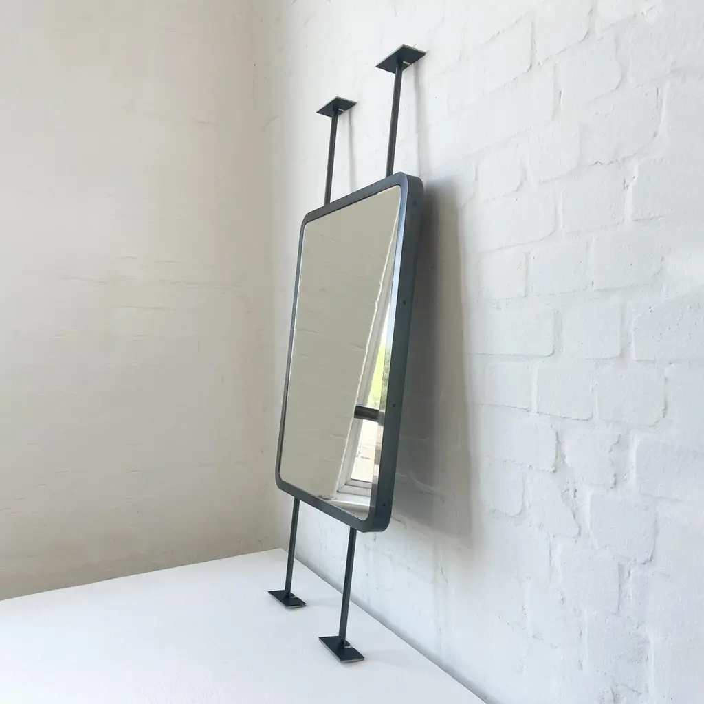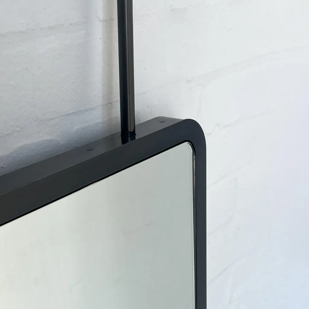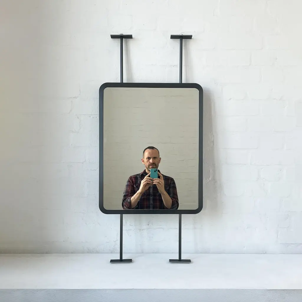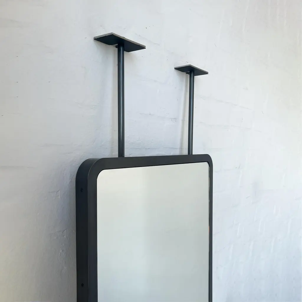 Contemporary countertop to ceiling attached Quadris™ rectangular mirror with a handcrafted blackened stainless steel full frame. Designed and made in London, UK. This mirror is fully customisable.Dimensions:H 61cm x W 48.3cm x D 3cm (Drop 22.2cm, Rise 22.2cm)H 24.2in x W 19.02in x D 1.2in (Drop 8.74in, Rise 8.74in)Overall height: 110.52cm / 41.42inThe mirror dimensions, drop and rise are fully customisable. Please contact us for further information.Mirror backing. The high quality finish of our countertop and suspended mirrors extends to their backings, which are made from a powder coated panel available in black or white. Backings can also be upgraded to a finish that matches the frame or can be substituted by a second mirror, making your mirror double sided.The ceiling plate is supplied with a cover hiding the screws to complete the minimalist design of the mirror.Shipped safely and insured worldwide. All our mirrors are made on demand. Fabrication lead time for this particular mirror is approximately 6 to 7 weeks by courier express, which typically requires 1 to 2 days to the UK, or 2 to 7 days outside the UK depending on the destination.Available options:• double sided mirror• backing in a finish that matches the frame• frame finishes: brass (brushed, polished or with a bronze patina), copper, stainless steel, blackened metal, powder coated aluminium in a range of standard or bespoke colours• minimalist frame• mirror tints: standard silver, black, bronze, gold, blue, rose gold / peach• back-illumination creating a halo effect• front-illumination around the periphery of the mirror• ON/OFF sensor switch• demister pad• bevelA presentation illustrating the options above is also available on demand. Please contact us for a quote for any bespoke specification or added options.IMPORTANT NOTES:- This mirror is intended to be fitted onto a countertop and must be attached to the ceiling. Ceiling suspended mirrors or countertop mirrors are also available on demand.ORDERS OF MULTIPLE MIRRORS OF THE SAME TYPE: Please contact us to receive a Packing and Shipping quote when ordering multiple mirrors of the same type. An order for multiple mirrors of the same type may not be accepted without extra packing and shipping fees. Thank you.