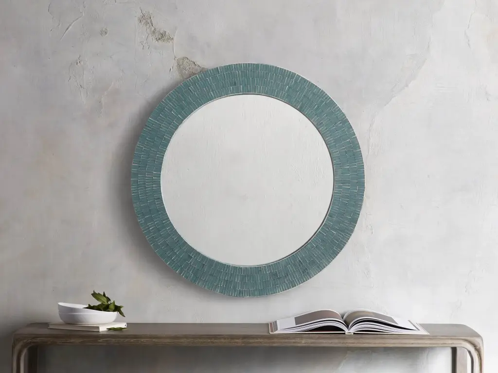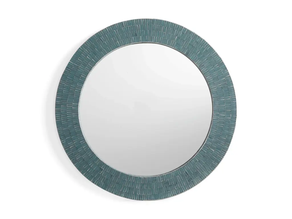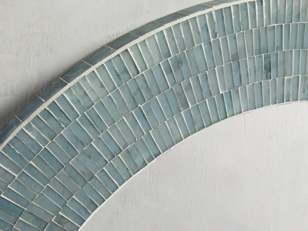 Soft and elegant hues of sage and grey coalesce with mother of pearl in this magnificent mirror’s mosaic frame. Intricately handcrafted by Indian artisans, this stunning accent piece is decorated with individually inlaid tiles.