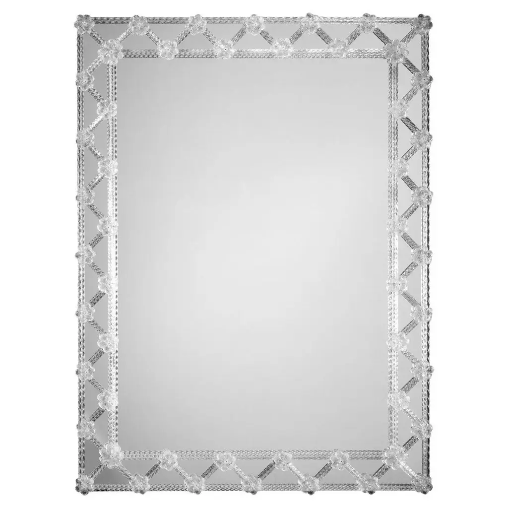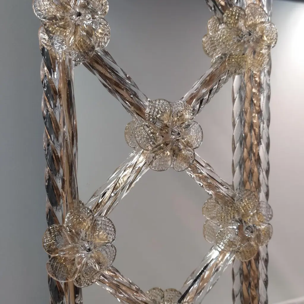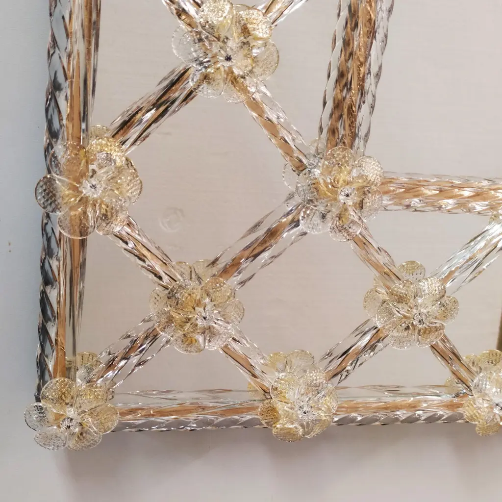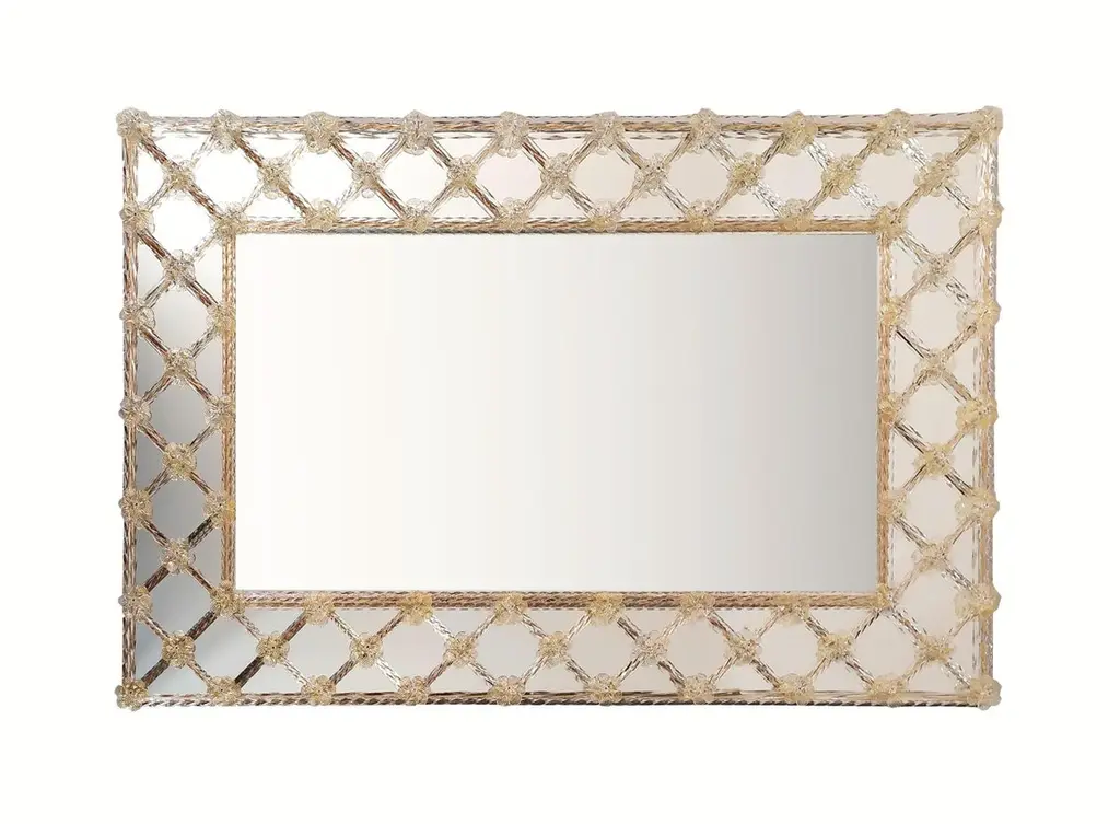 Lussuoso specchio classico rettangolare in vetro di murano, in stile veneziano, rivisitato dagli esperti maestri muranesi che hanno saputo trasformare questo specchio, per renderlo più contemporaneo,Realizzato interamente a mano dai Fratelli Tosi nell'Isola di Murano.La cornice perimetrale dello specchio è in specchio chiaro con canne in vetro di murano in cristallo su fondo oro, canne che formano rombi centrali alla cornice, con finitura di roselline in cristallo di Murano con foglia oro 24Kt, lo specchio è personalizzabile nelle misure e nei colori.