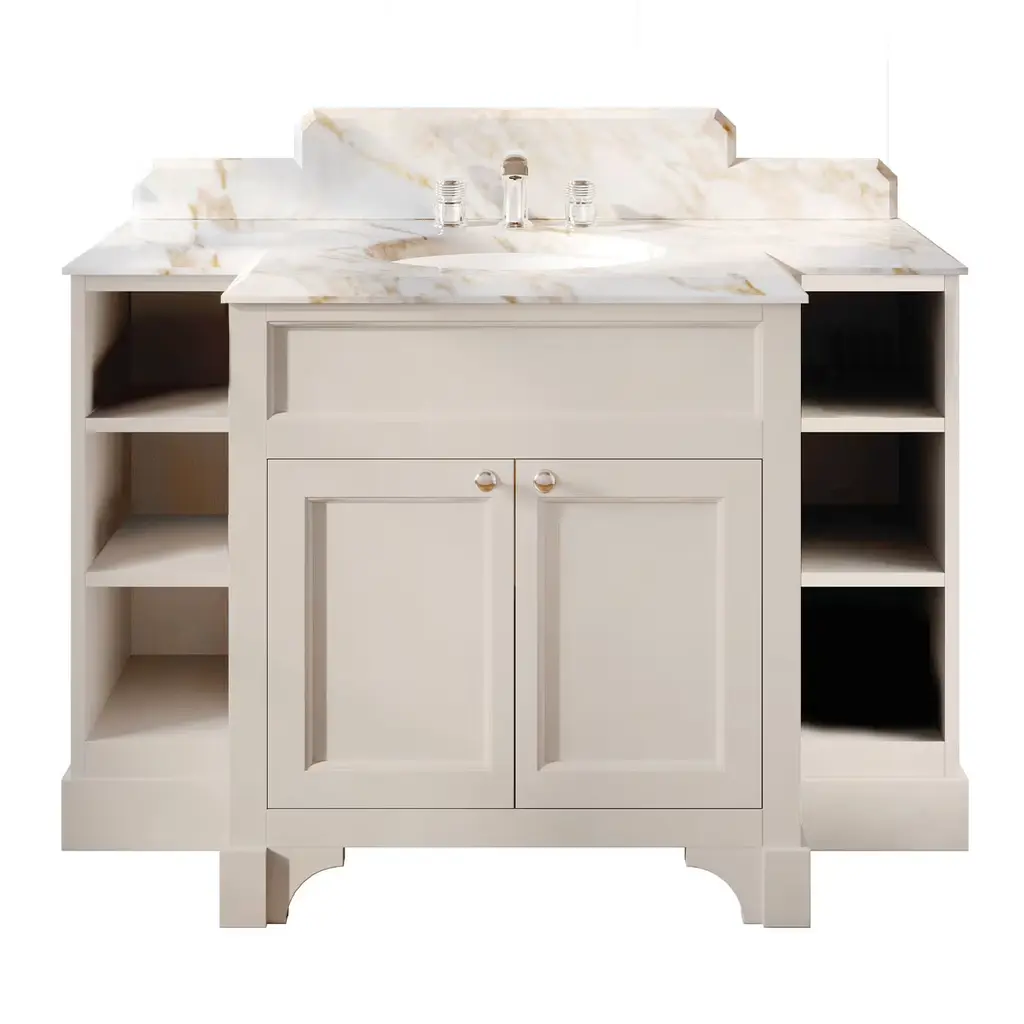 Whether it’s “his and hers” or “all yours,” this double vanity makes space for two while imparting enviable style on your powder room. Crafted from birch wood, it showcases a sleek silhouette and hardware with a chrome finish, while a carrara marble top offers a touch of glamour with its soft gray veining. Four drawers and a pair of cabinets offer plenty of spots to stash bathroom essentials, while the included mirror and faucet round out your bathroom’s look.