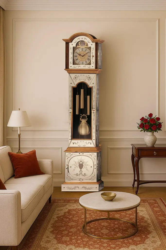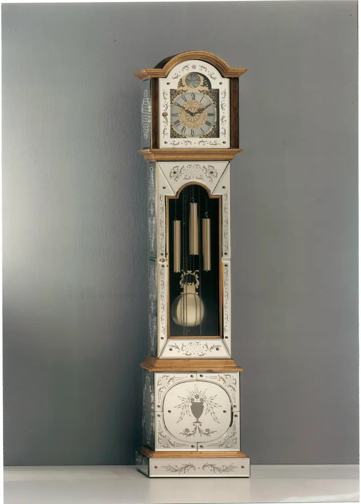 This marvelous and luxurious Grand Saloon clock named "Cronos" after the Greek God of Time, has mounted on a walnut-colored varnished wooden case with 24 Kt gold leaf frames a mechanical gear made in Germany, the case then is covered all in beveled mirror, engraved and silvered all by hand, another example of the wide range of products created by Murano-based Fratelli Tosi.This product, like all of Fratelli Tosi's handcrafted products, can also be customized in size and color to meet the varied requests of its customers.