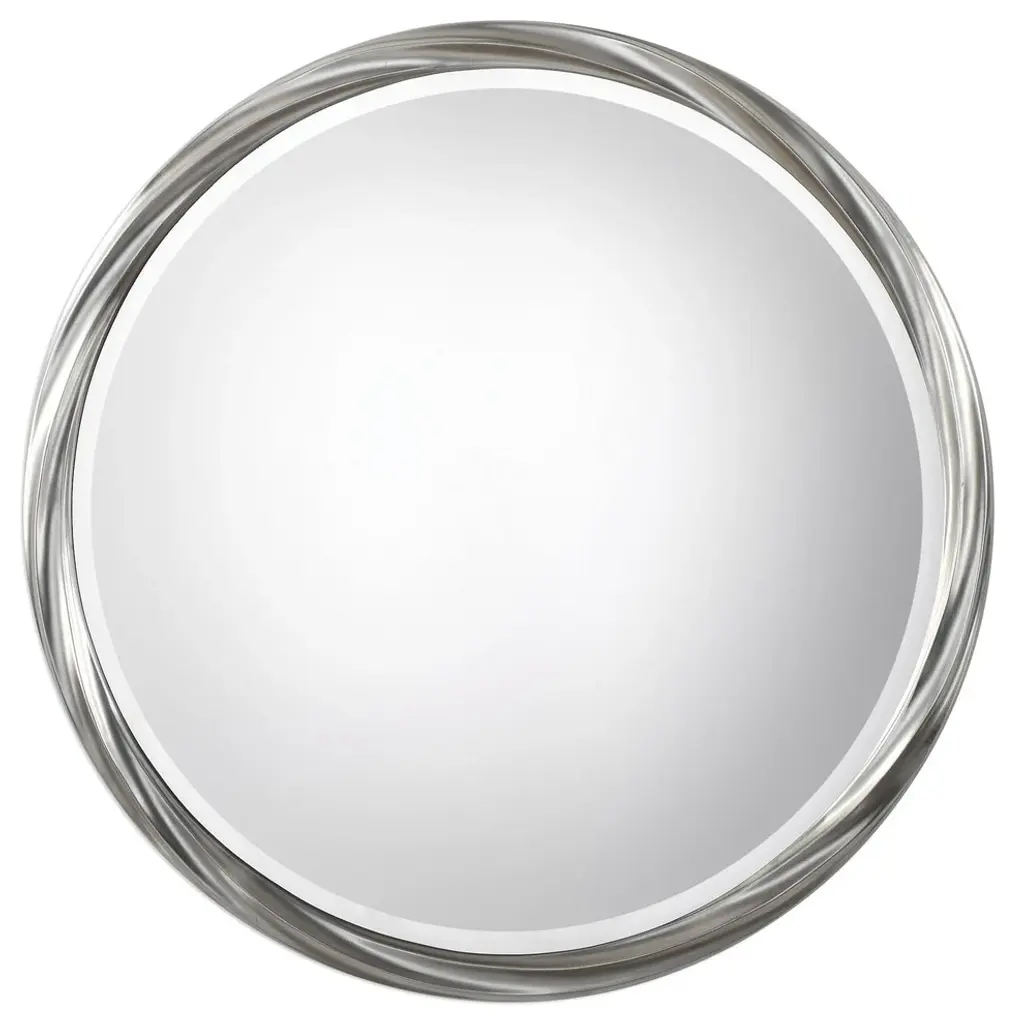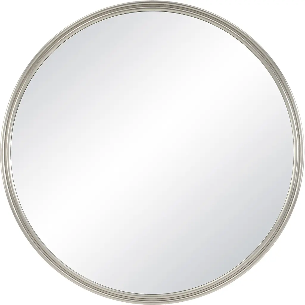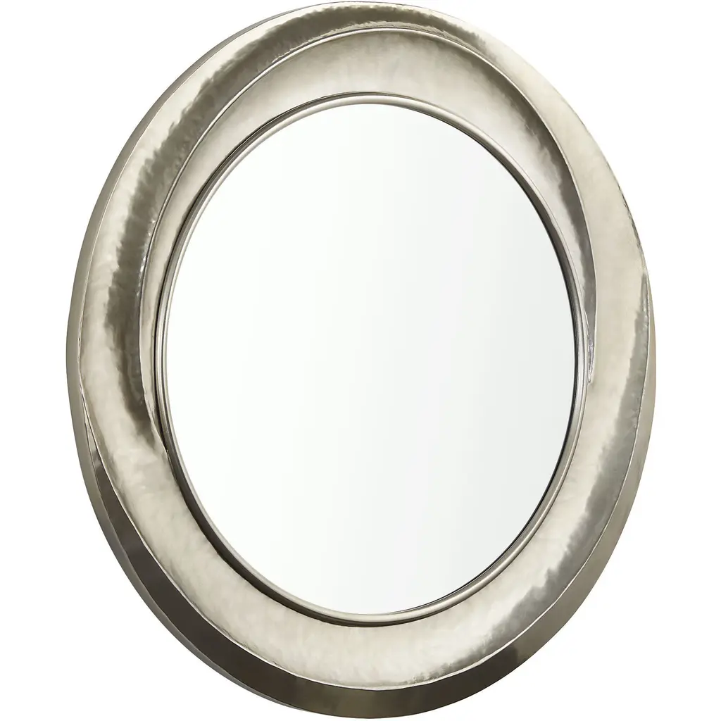 The Cuff Mirror showcases a classic, timeless look that elevates an interior space through seductive curves and opulent tones. This aluminum piece in a Nickel finish displays a circular silhouette, reminiscent of a stylish metal cuff. The mirror is affixed with French cleats and displayed in a horizontal orientation.