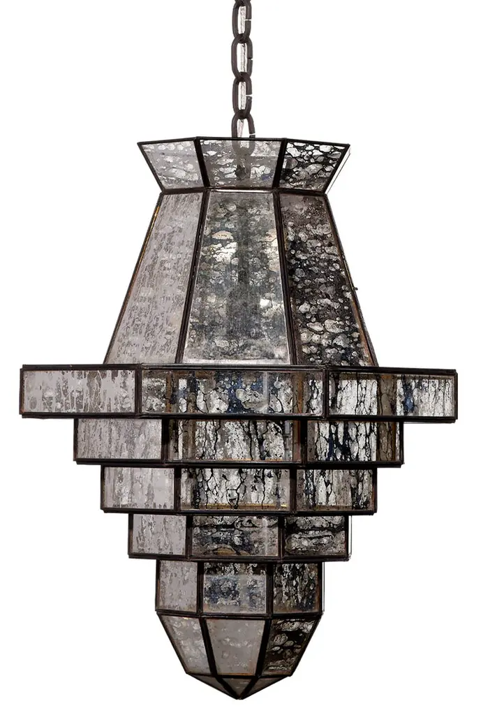 The Buckminster Semi-Flush Mount is composed of Raj mirrored squares, which are framed in wrought iron in a hand-finished Pyrite bronze. This mirrored chandelier was inspired by R. Buckminster Fuller's geodesic dome.