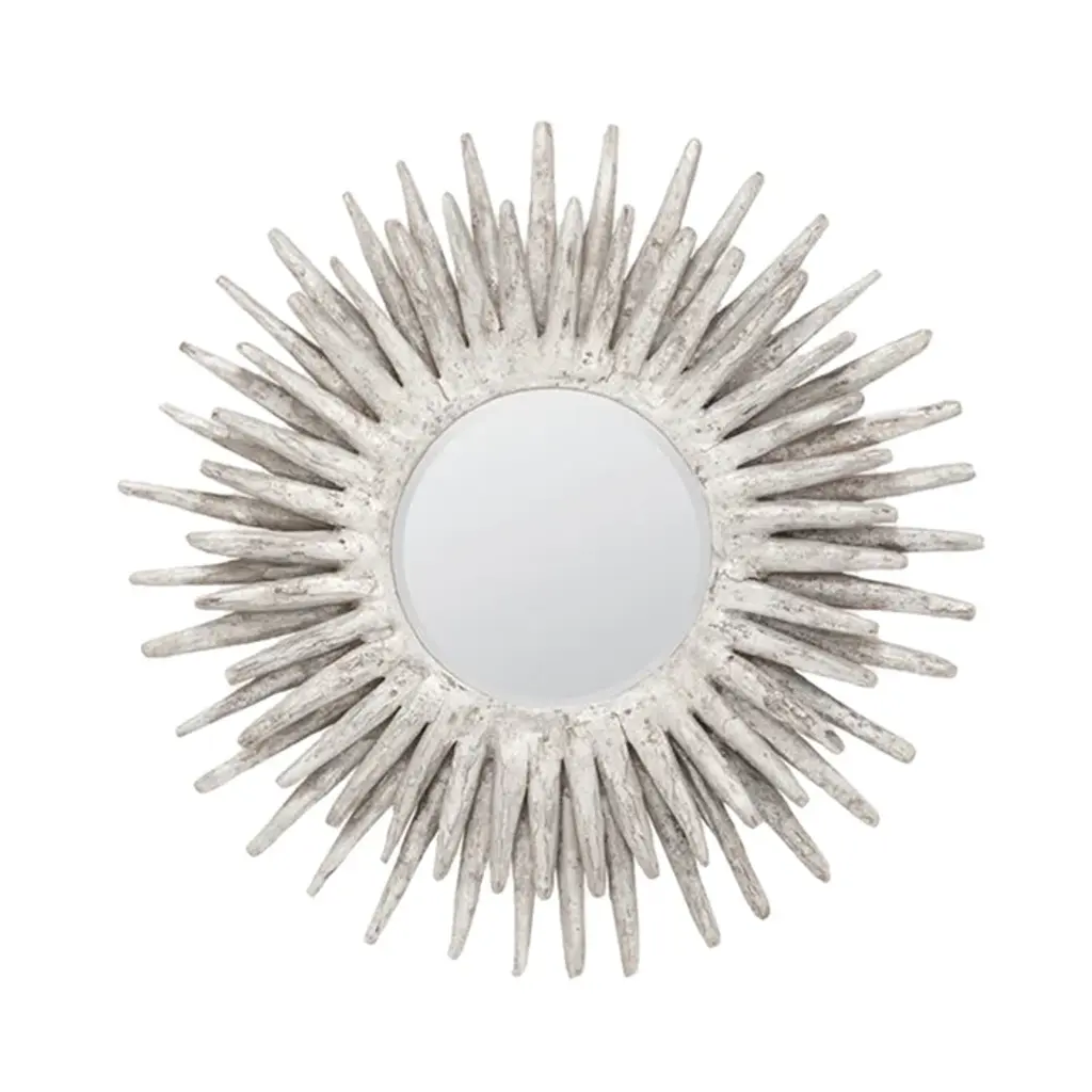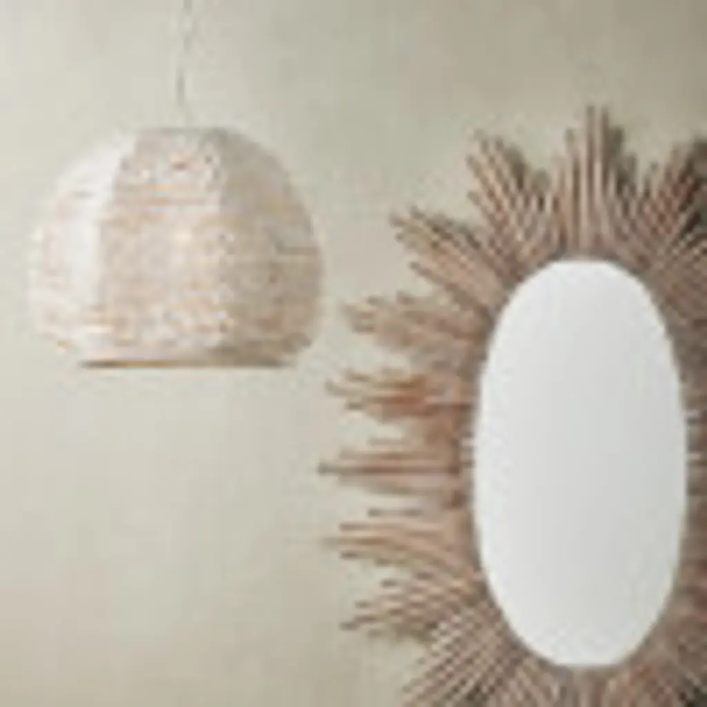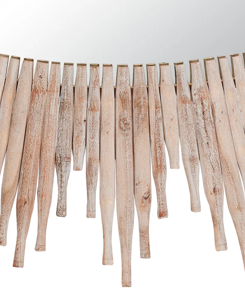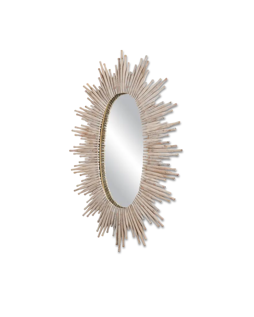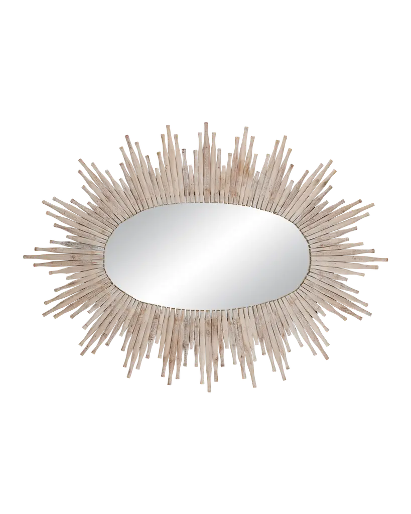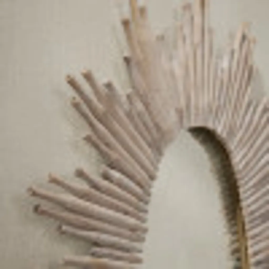 With a shape that celebrates the classic starburst mirror, the Chadee Oval Whitewash Mirror offers a twist on the tried-and-true design with its undulating rays rendered in whitewashed reclaimed wood. The rays are made of tiny rolling pins that were used to flatten chapati bread, then bleached. The whitewashed mirror will be more versatile than formal starburst designs with its casual vibe. Wipe clean with a soft, dry cloth or static duster. Always avoid the use of harsh chemicals or abrasive cleaners as they may cause damage to the item's finish. Due to the use of natural materials, handmade craftsmanship, or hand finishing, expect some color variances. Hand crafted pieces may have slight size differences.