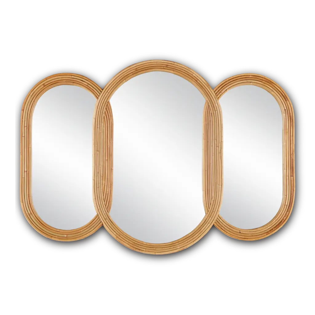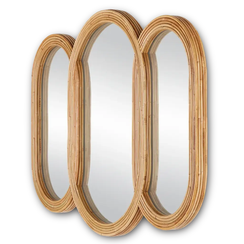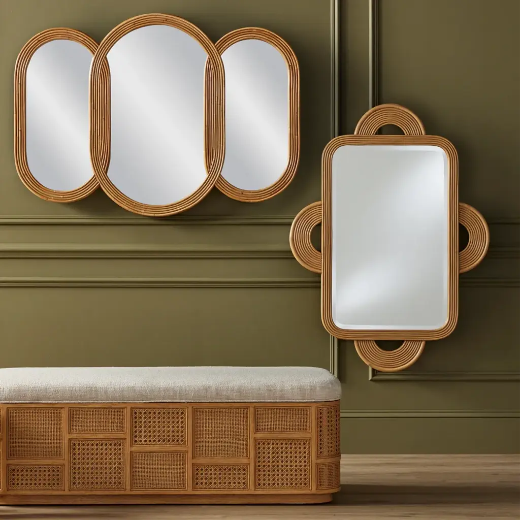 The Triboa Mirror is handmade of arurog, the rounded shapes extremely difficult to achieve with such a strong material. The natural color variations of the reeds enliven the tan decorative mirror with patina. A finely designed detail is how the layers of the natural material thicken the frame around the mirrored glass. This treatment brings depth to the artisanal piece and illustrates the painstaking efforts our craftspeople put into our designs. Additional Materials: Glass, Wood Care Instructions: Wipe with clean cloth
