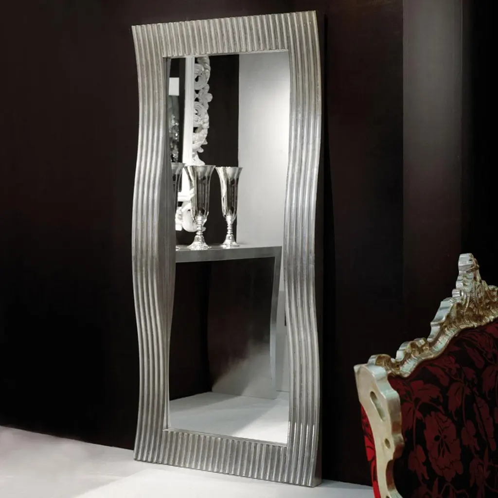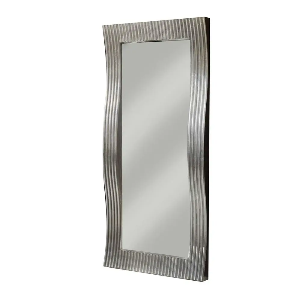 This mirror features a curved frame with a wave motif. When combined with the mirror's reflective surface, it creates a sensation of dynamic movement reminiscent of an extremely elegant, sophisticated fun house. Its long, vertical, full-length shape makes it perfect for an entranceway or bedroom.