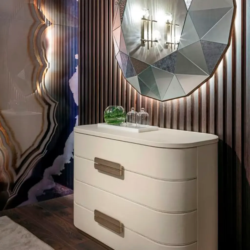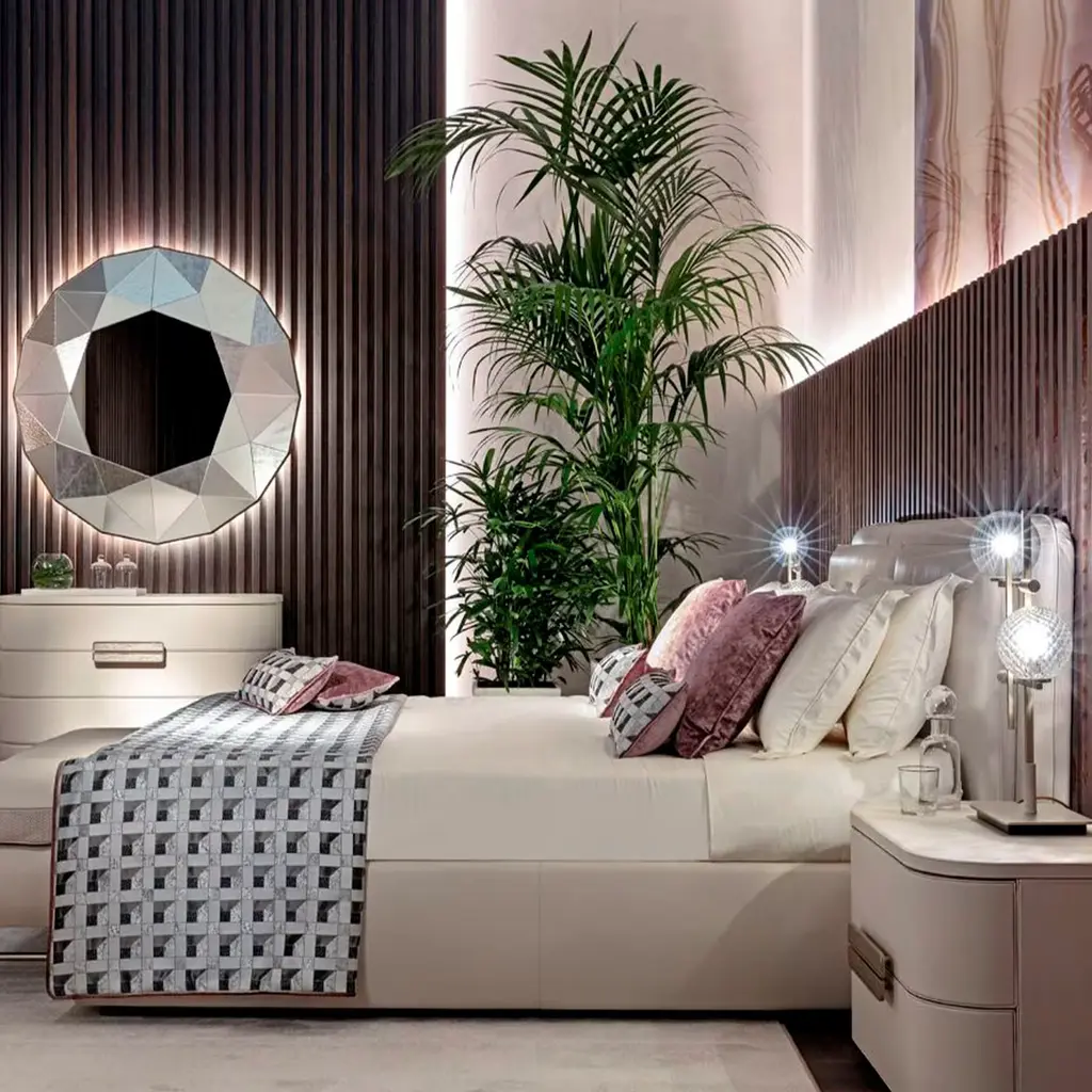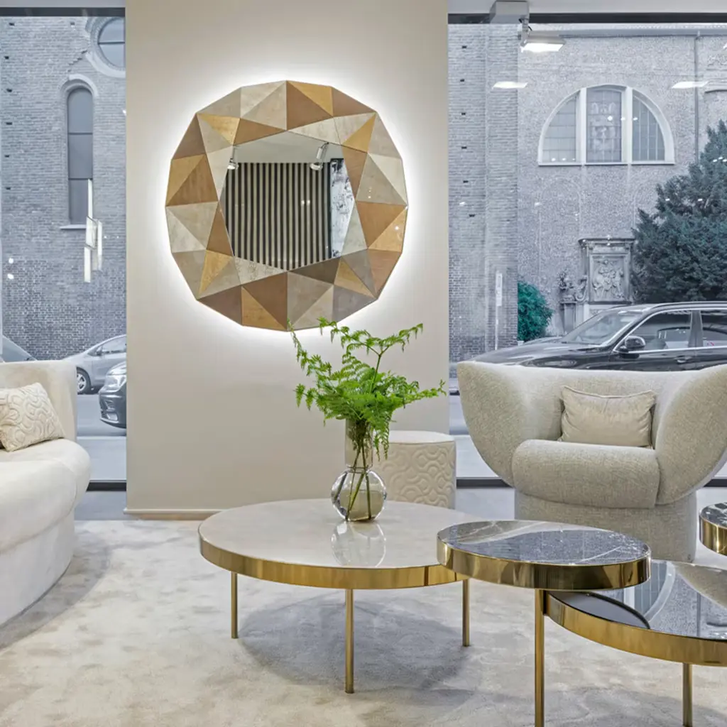 A jewel-mirror that recalls the shape of a diamond. Its numerous facets, decorated in foam glass elements, are further enhanced by the back lighting. Classy and elegant.