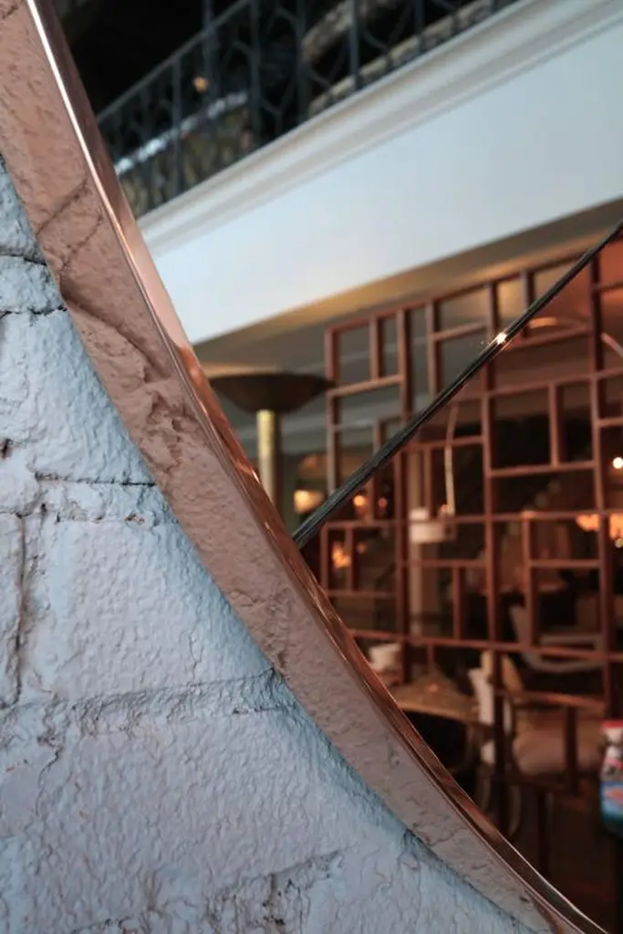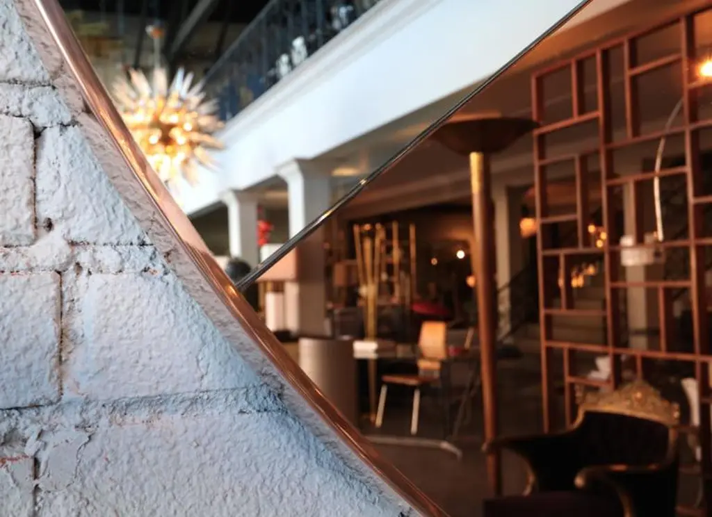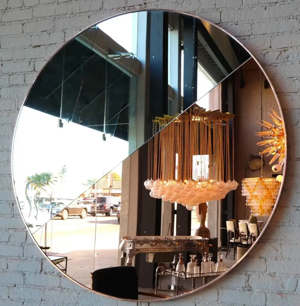 Custom round mirror with half silver and half apricot peach with a copper frame. Made in Los Angeles by Adesso Imports. Can be hung with line horizontally, vertically or diagonally. Can be done in different sizes and finishes.