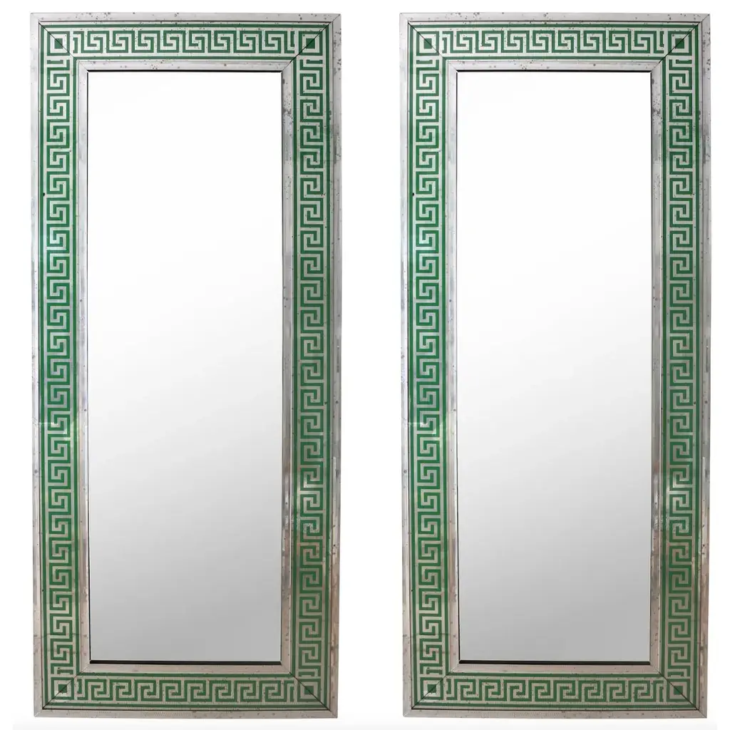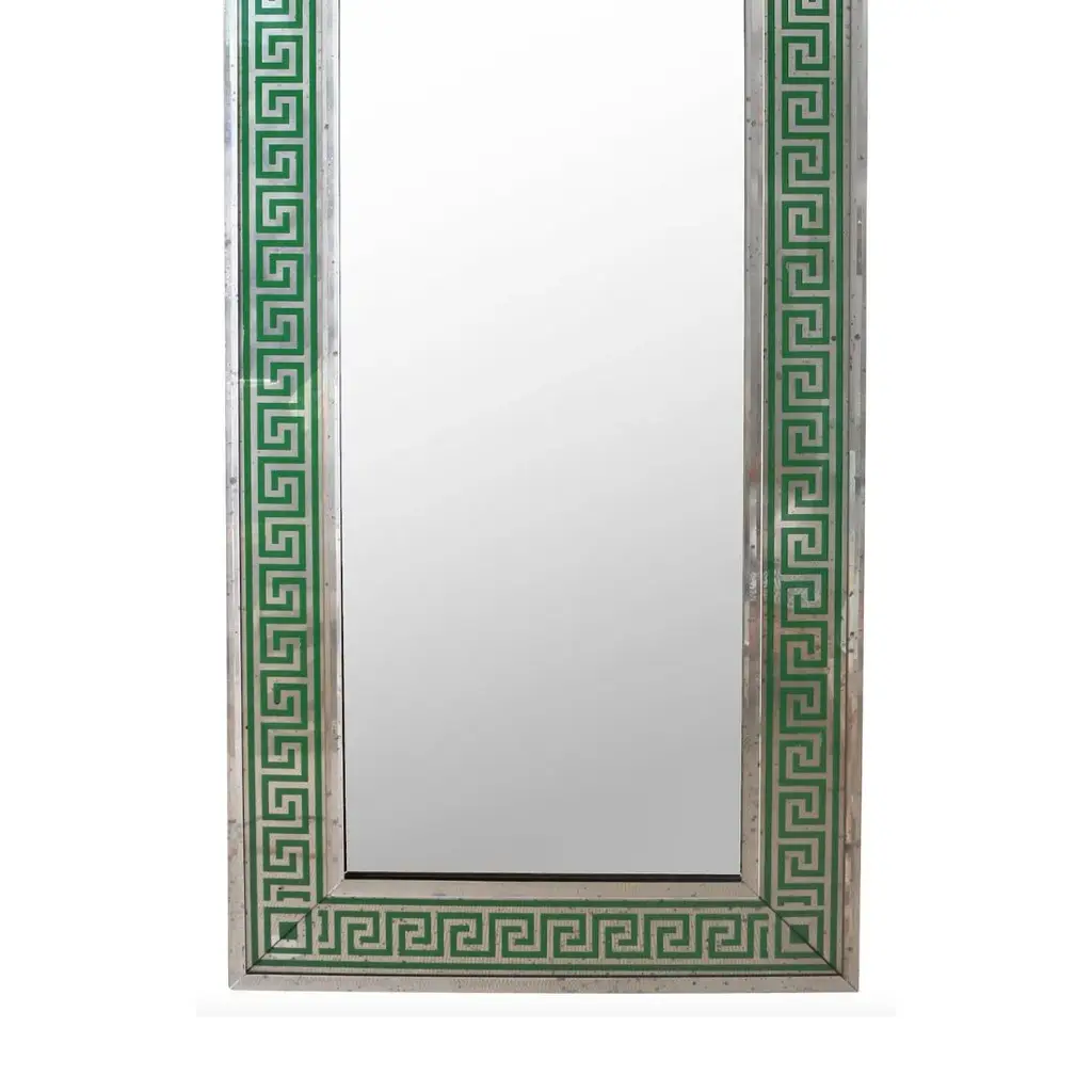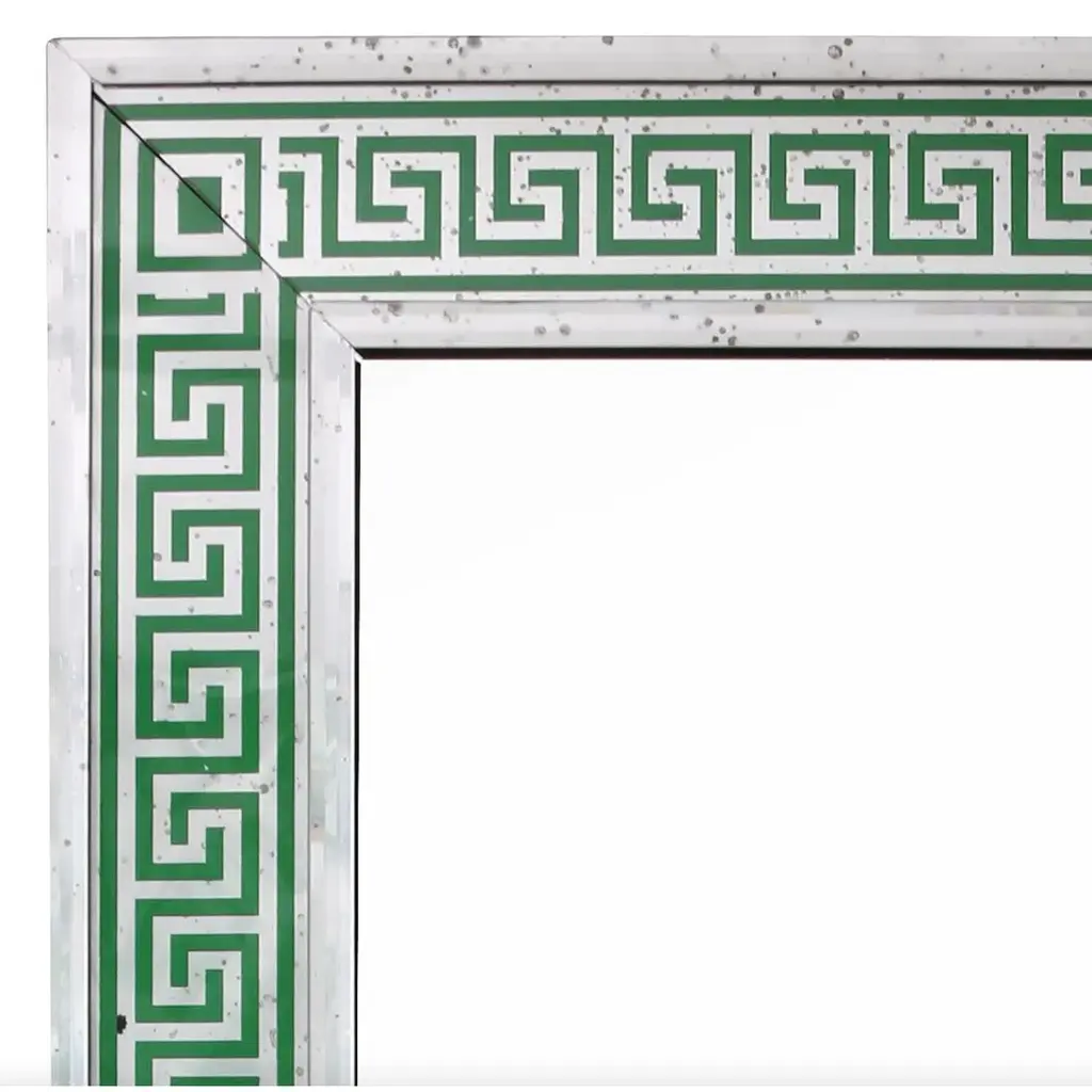 This custom oversized rectangular mirror features a striking green frame adorned with a classic Greek key pattern, symbolizing timeless elegance and geometric precision. The bold, intricate design of the frame adds a sophisticated touch, while the green hue offers a fresh and modern twist on a traditional motif. The generous size of the mirror enhances its visual impact, making it a statement piece that can add depth and light to any space. Ideal for both contemporary and eclectic interiors, it balances classic design elements with a bold, custom aesthetic There are two available if interested. The piece measures as follows, 35"W x 1"D x 80"H.