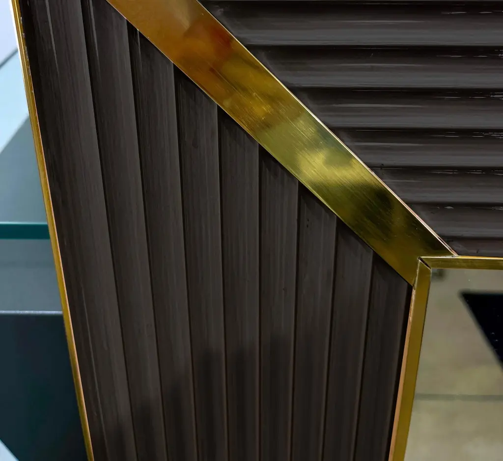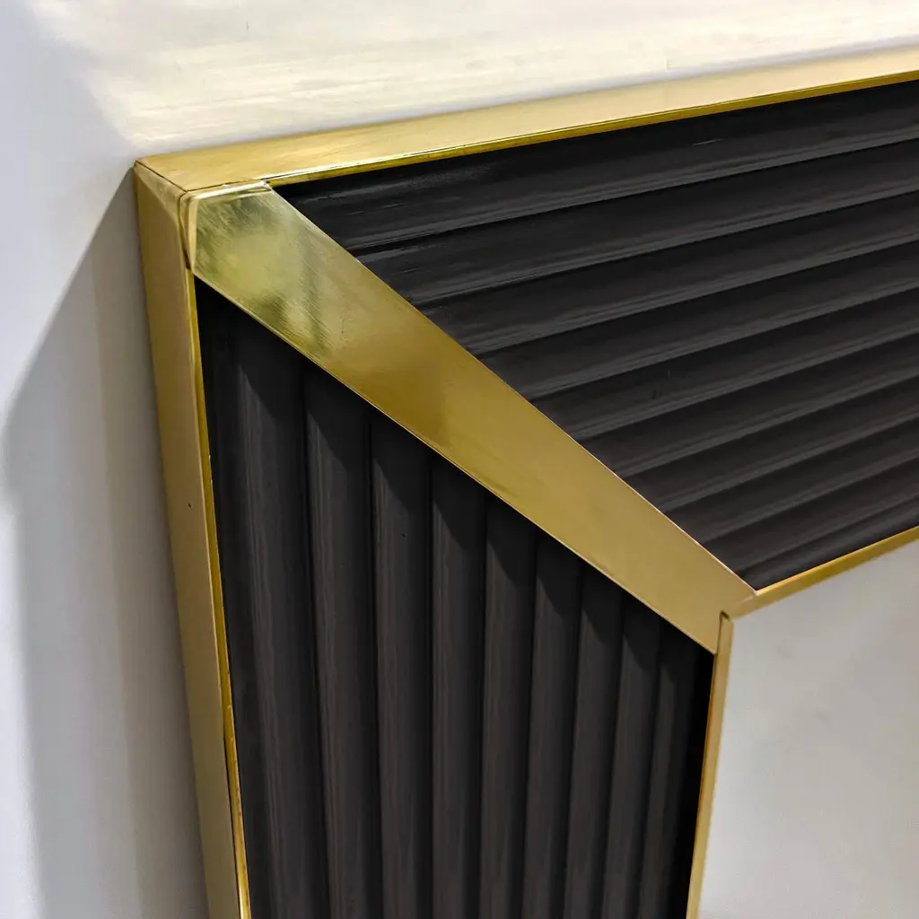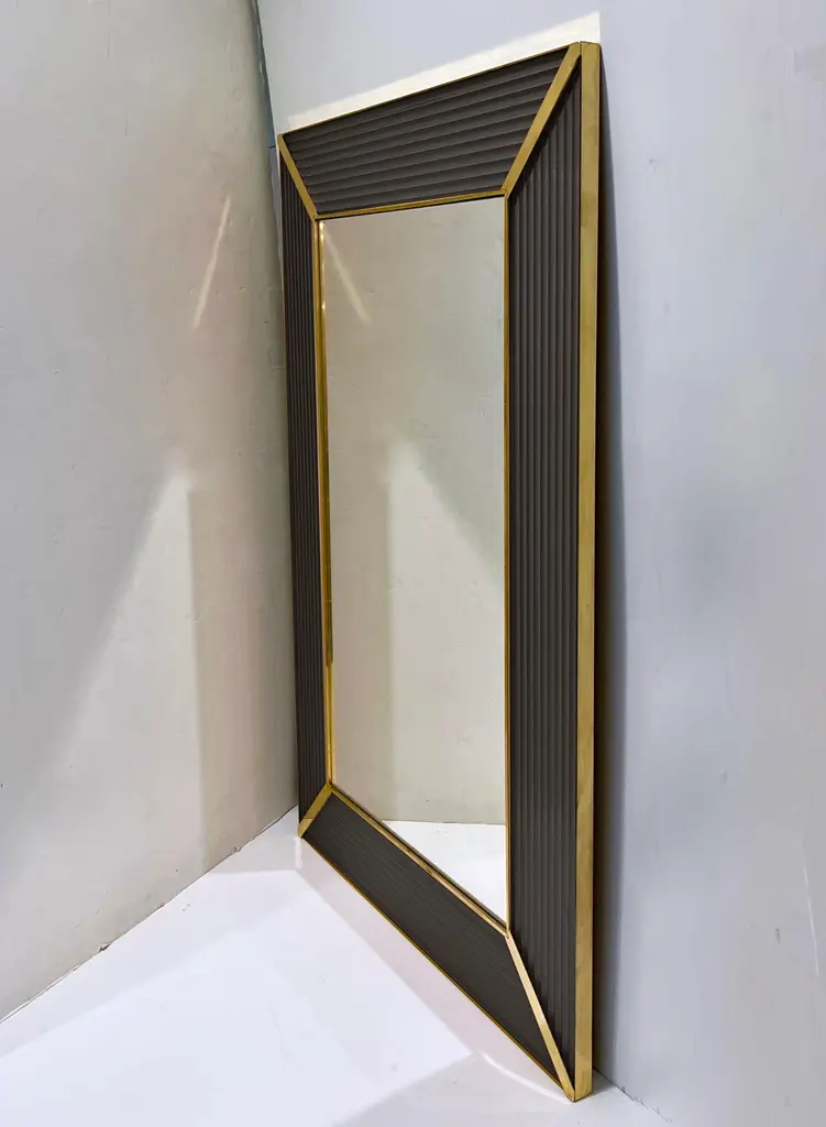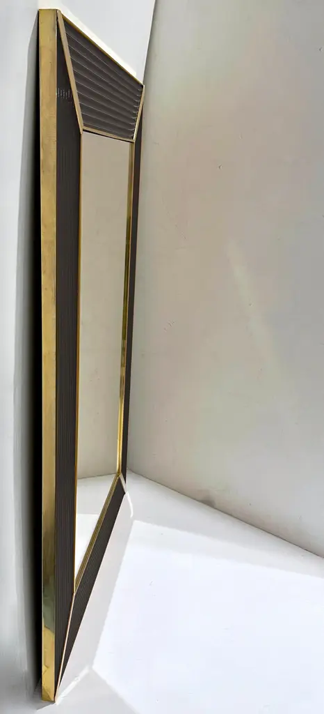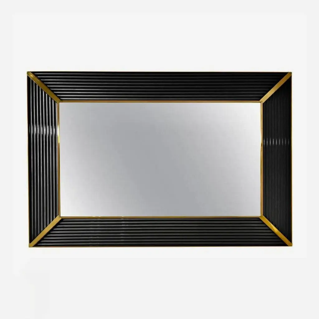 Choose your color to bring your personality into your space! Cosulich Interiors & Antiques’ biggest aspiration, through this Contemporary Collection, is to communicate the power of colors to trigger personal healthy environments through your own narrative.This Couture Design rectangular wall mirror, custom made in Italy, is framed with a thick border in high quality blown Murano art glass in black color, artistically decorated with a minimalist Art Deco style ribbed pattern that catches the light. High quality of execution with the wood back enclosed in a handcrafted brass border and the mirror plate edged with a brass border. The corners are highlighted with a brass detail which adds to its depth. The glass can be in any color of the RAL K7 Classic Color Gloss Chart. Contact us with your requirements.Width of frame: 5.7 inches