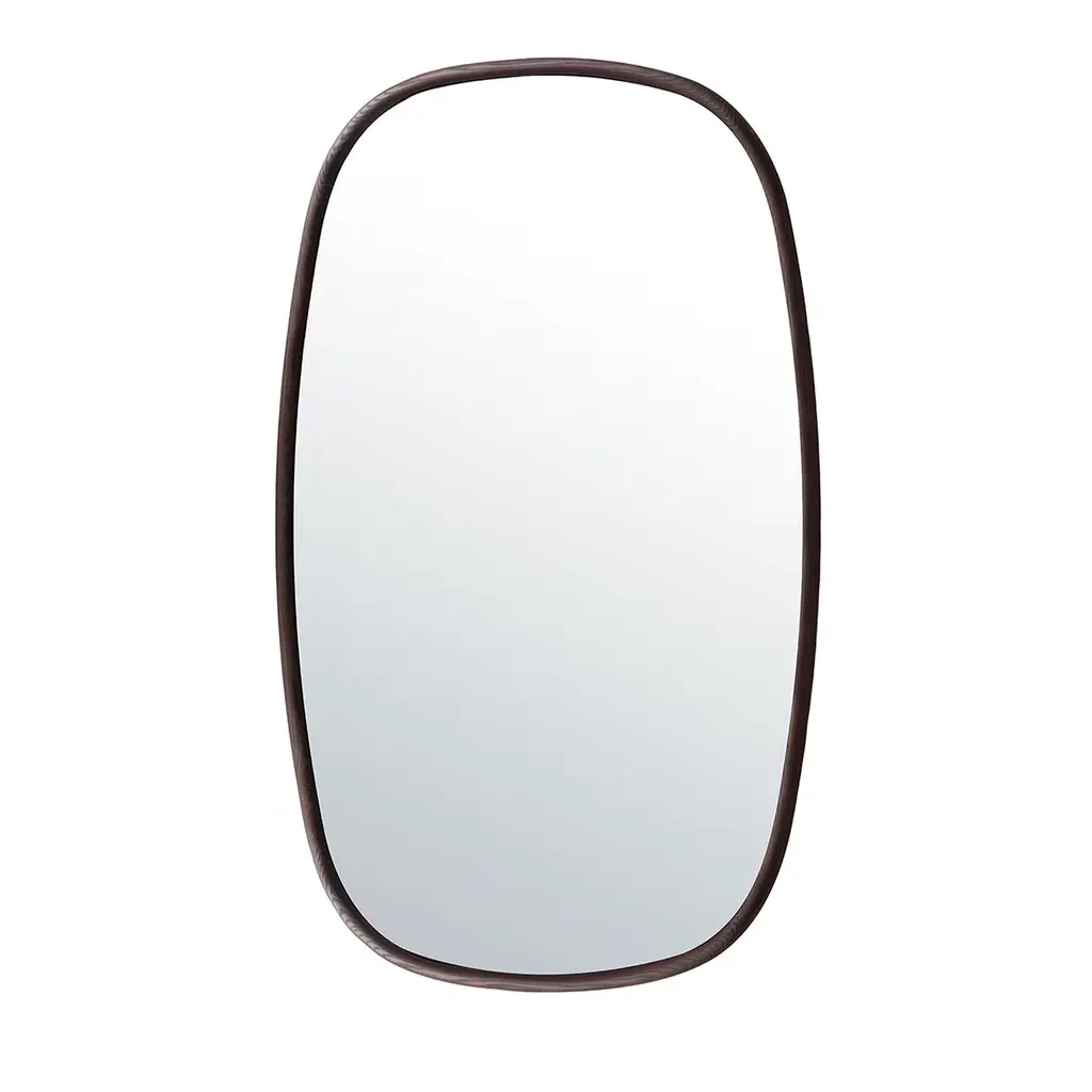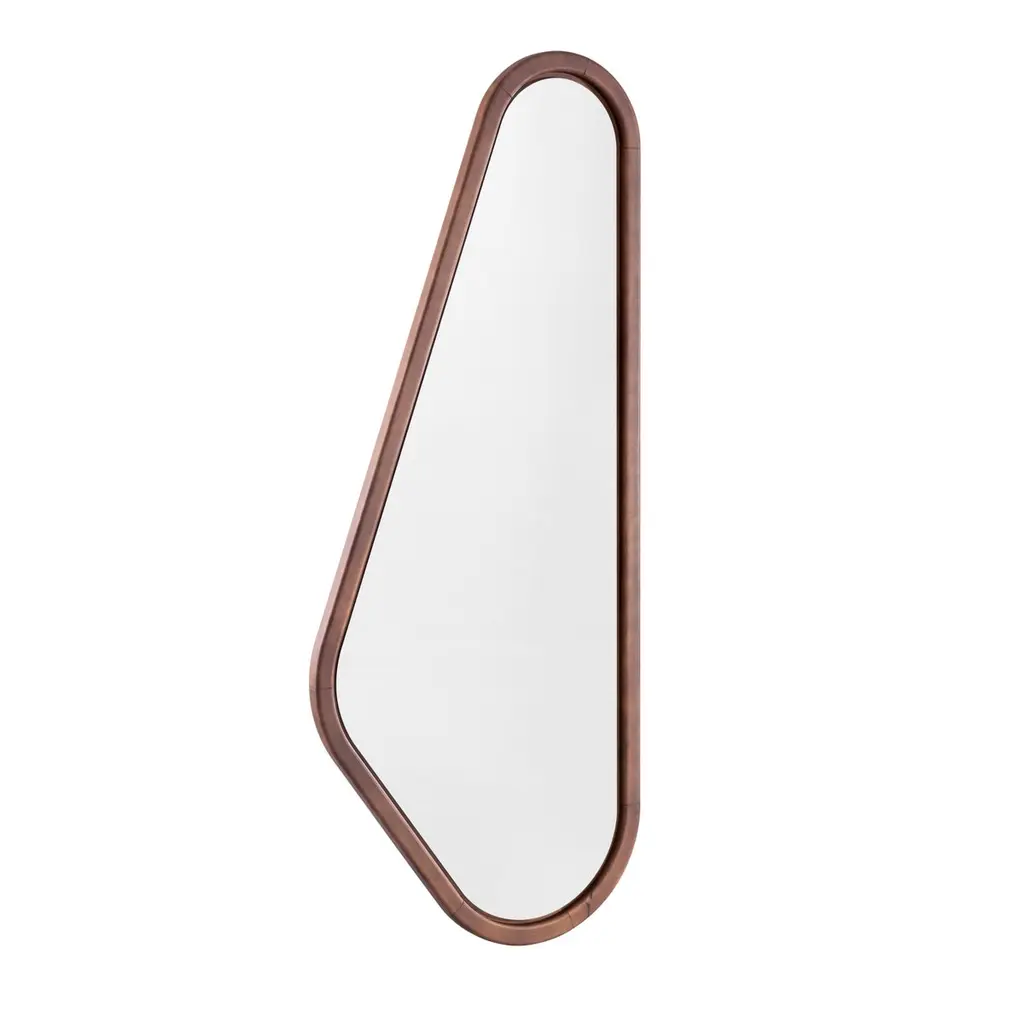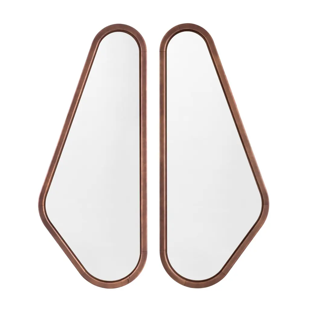 An Ali mirror designed by Studio + A! with walnut veneer, left side. Bring a touch of natural elegance and artistic inspiration into your home with the Ali mirror, a striking piece crafted with walnut veneer. Designed by Studio + A!, the Ali mirror takes its name from the Italian word for "wings," a concept brought to life through its graceful, dynamic design. Placed with its counterpart the right side (also available for purchase), the mirrors create a wing-like effect, imbuing any space with a sense of movement, balance, and freedom.Each mirror features a frame of rich walnut veneer paired with an MDF backing, combining beauty, durability, and sustainability. This mirror is ideal for modern and contemporary interiors, offering versatile placement options—use it as a statement piece in an entryway, above a console table, or as part of a curated gallery wall. Its clean lines and organic design also make it a beautiful addition to bedrooms, creating a tranquil yet visually dynamic effect.Perfect for pairing or displaying individually, the Ali mirror elevates any room while reflecting natural light to enhance the sense of space. Designed with both form and function in mind, it showcases meticulous craftsmanship while aligning with eco-conscious values. Whether hung side by side with its counterpart or creatively positioned, this mirror provides timeless style, making it a versatile investment for home or commercial spaces. Minimal assembly required for installation.