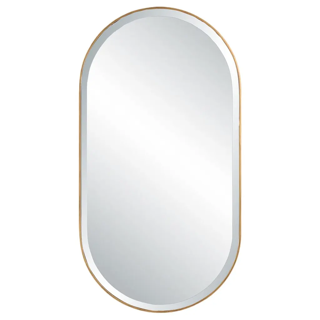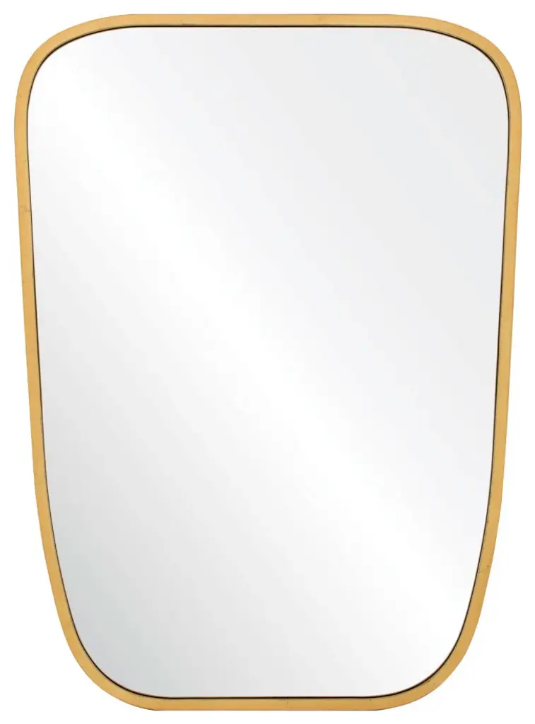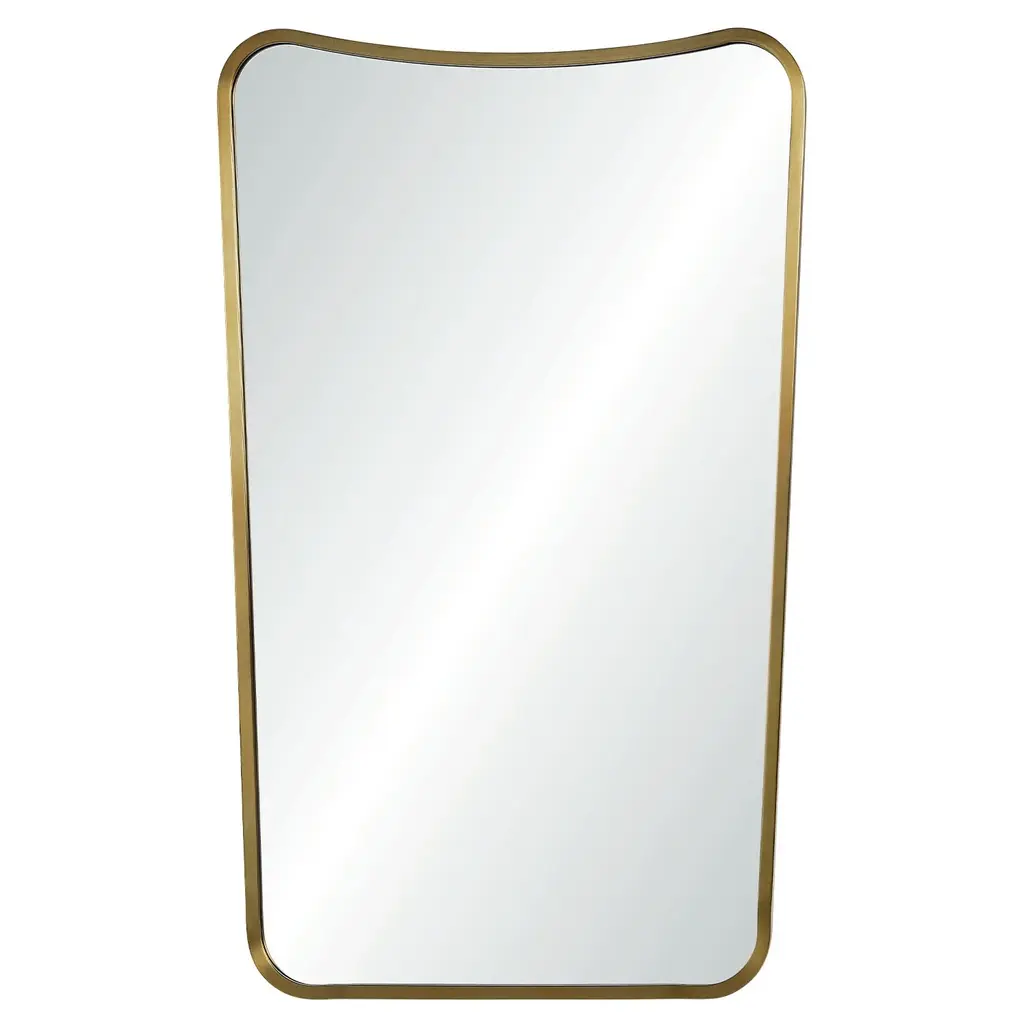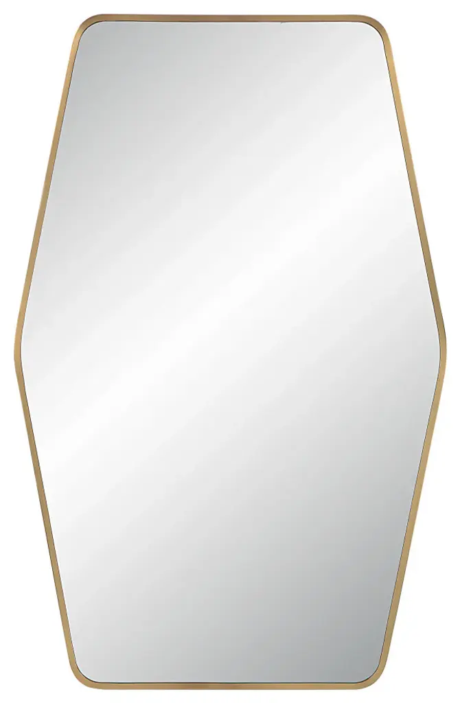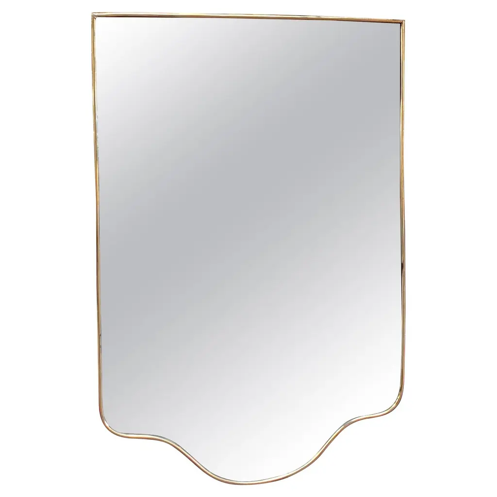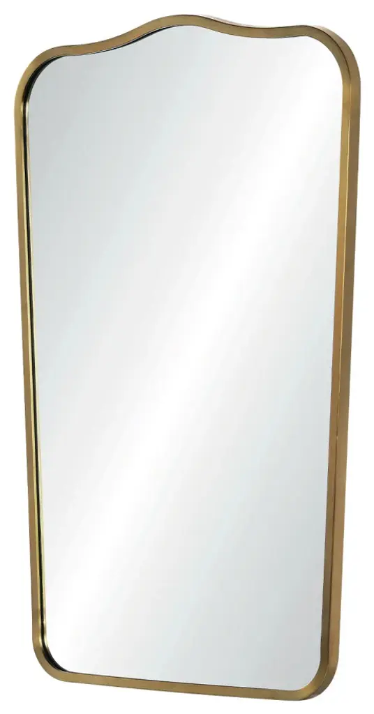 This unique yet simple mirror is a perfect accent for your home or office. Hand welded shield mirror finished in antiqued silver leaf or burnished gold leaf. Non-beveled center mirror. Cleat hardware provided.