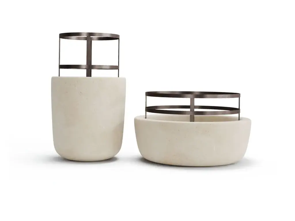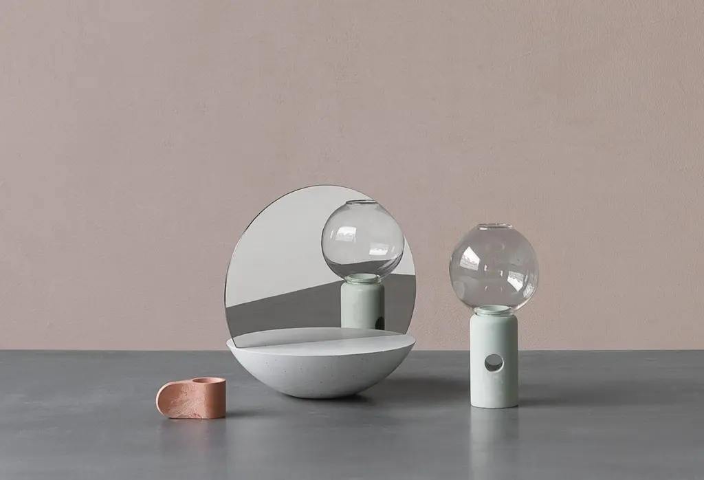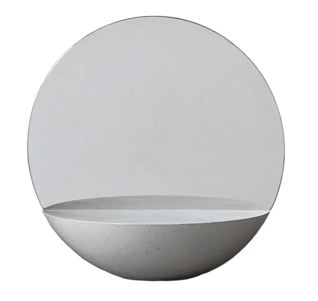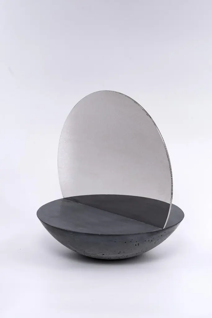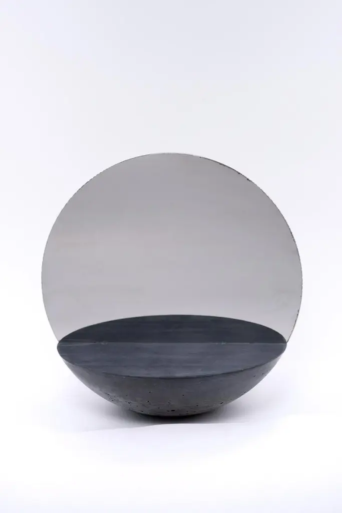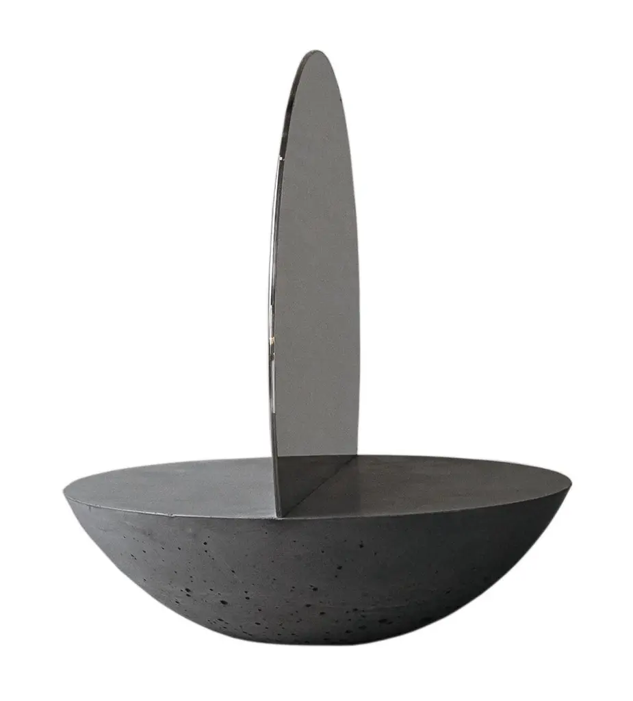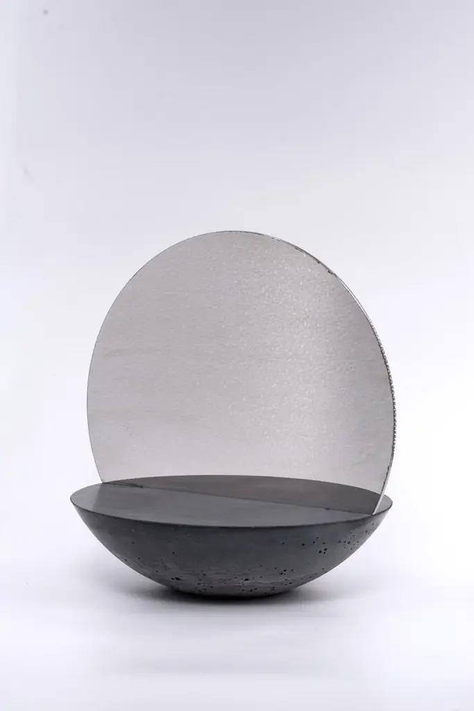 This double sided mirror will create a focal point on a bedroom dresser or in an entryway. Entirely handcrafted, has a semi-spherical base in concrete with a two-sided reflective sheet in polished steel placed in the centre of the base. Each piece is a unique piece, made by hand, no two are the same.