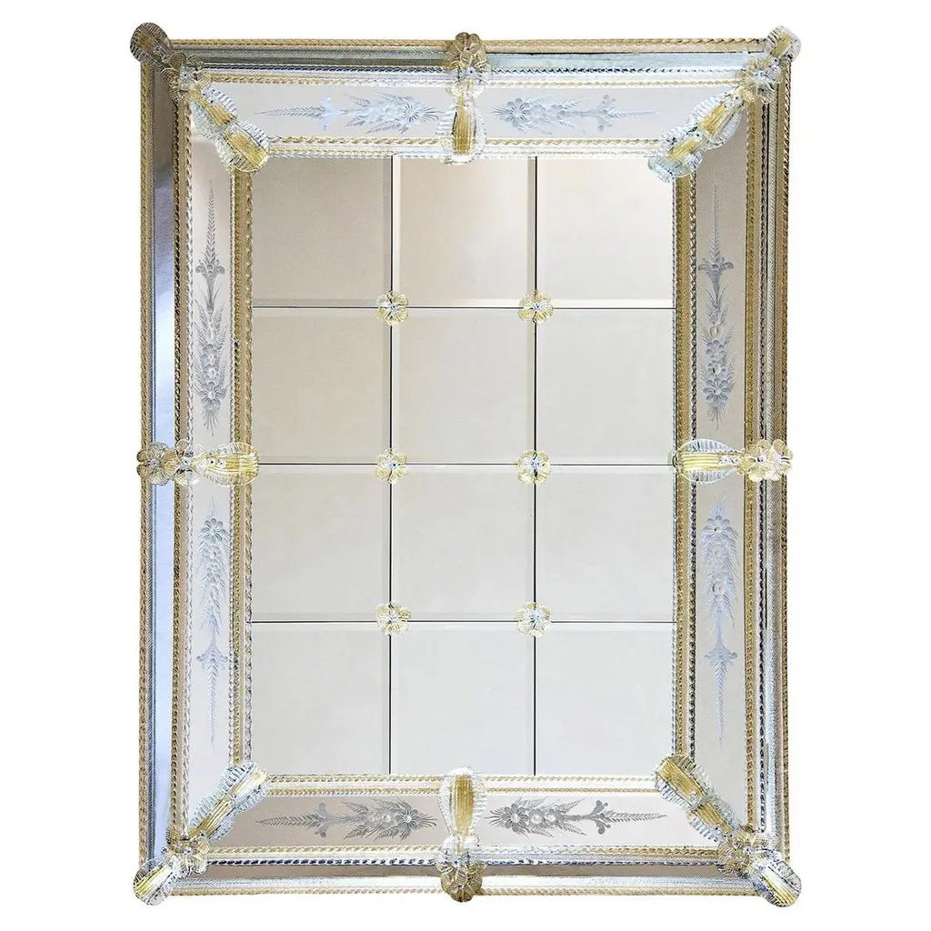 This superb, handmade mirror will stand out on any wall, simultaneously playing a decorative and functional role thanks to its ornate design. Floral motifs are meticulously etched into the inner section in mirrored glass, their naturalistic inspiration matching the dainty golden inserts in Murano glass defining the edges. This sublime design is achieved thanks to the master Venetian glassblowers who effortlessly execute 14th-century techniques.