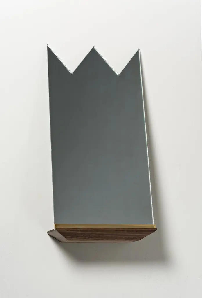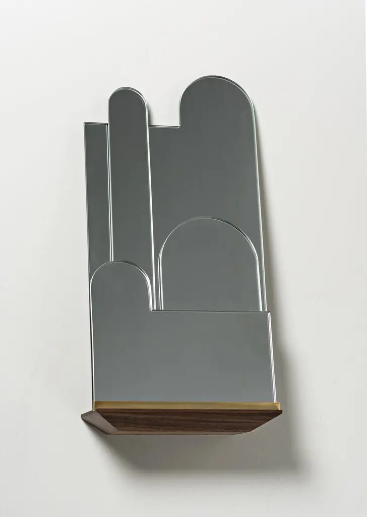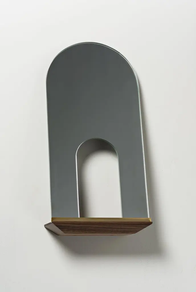 Daily-Use mirror #1 by PhaedoDimensions: W 9" x H 18" inchesMaterials: solid wood (shelf) with a polished brass mirror catchBrass and bronze frames are also available.With the propped mirror format we removed the restraints of the traditional frame allowing the mirror to move unencumbered. The mirrors are available in an assortment of shapes and sizes and layers.PHAEDO is a sculpture and design company founded by Morgan Spaulding.At once playful and restrained, somber and lively, Spaulding’s art and furniture personify the ambiguous curvatures of ethereal in-betweens: dreamstates, memories in recession, thresholds in passing.In balanced practice, Spaulding’s ornamental sculpture and functional furniture and design objects strengthen with time. Each piece exists to graft its design story with its relationship to present spaces and contexts. All of PHAEDO’s pieces are designed and created by Spaulding in New York’s Catskill Mountains.